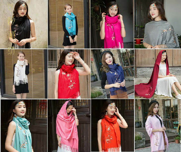 凯崎湘绣 女孩围巾 民族风刺绣羊绒披肩 手工复古百搭 秋冬季礼品 时尚绣花款 围脖