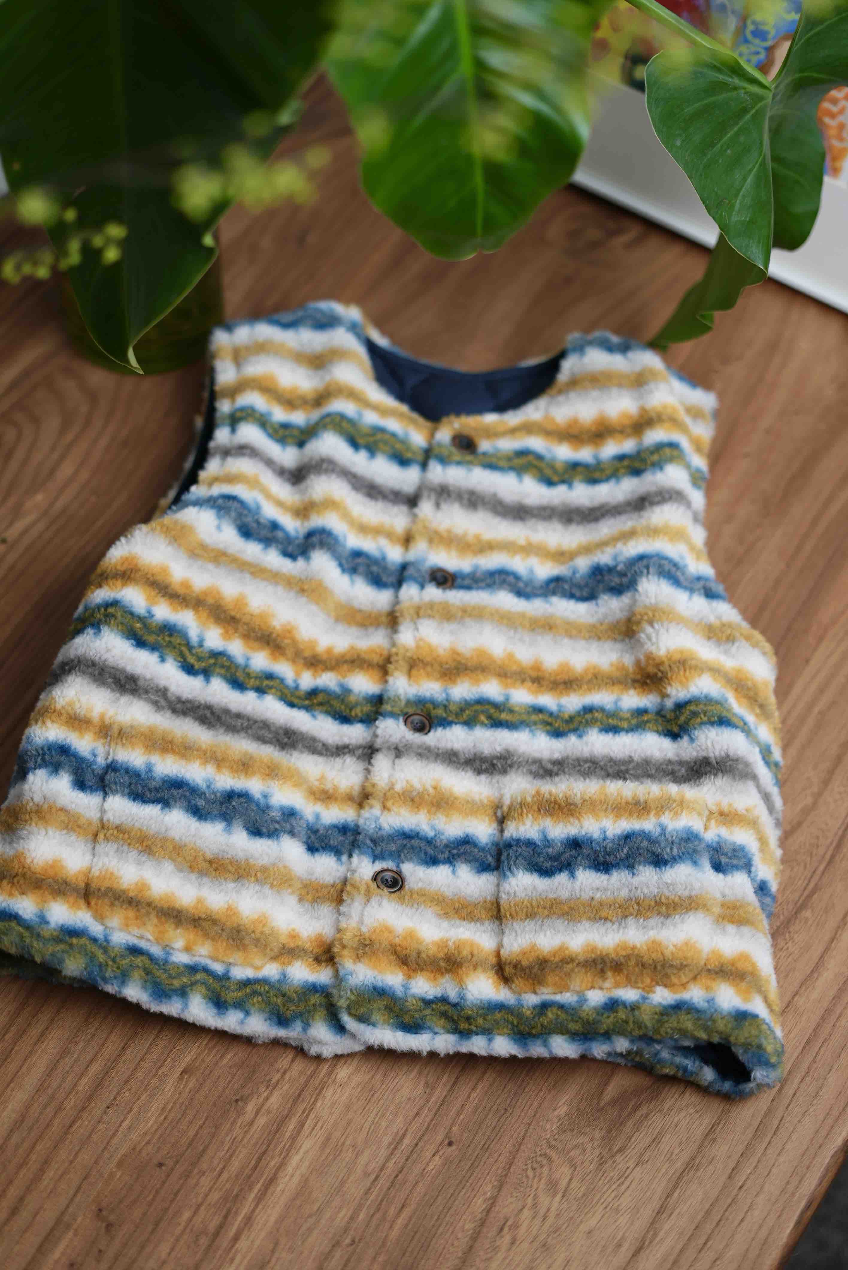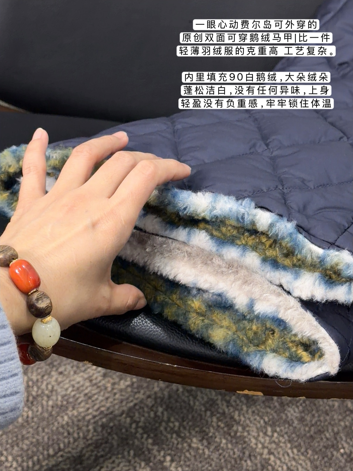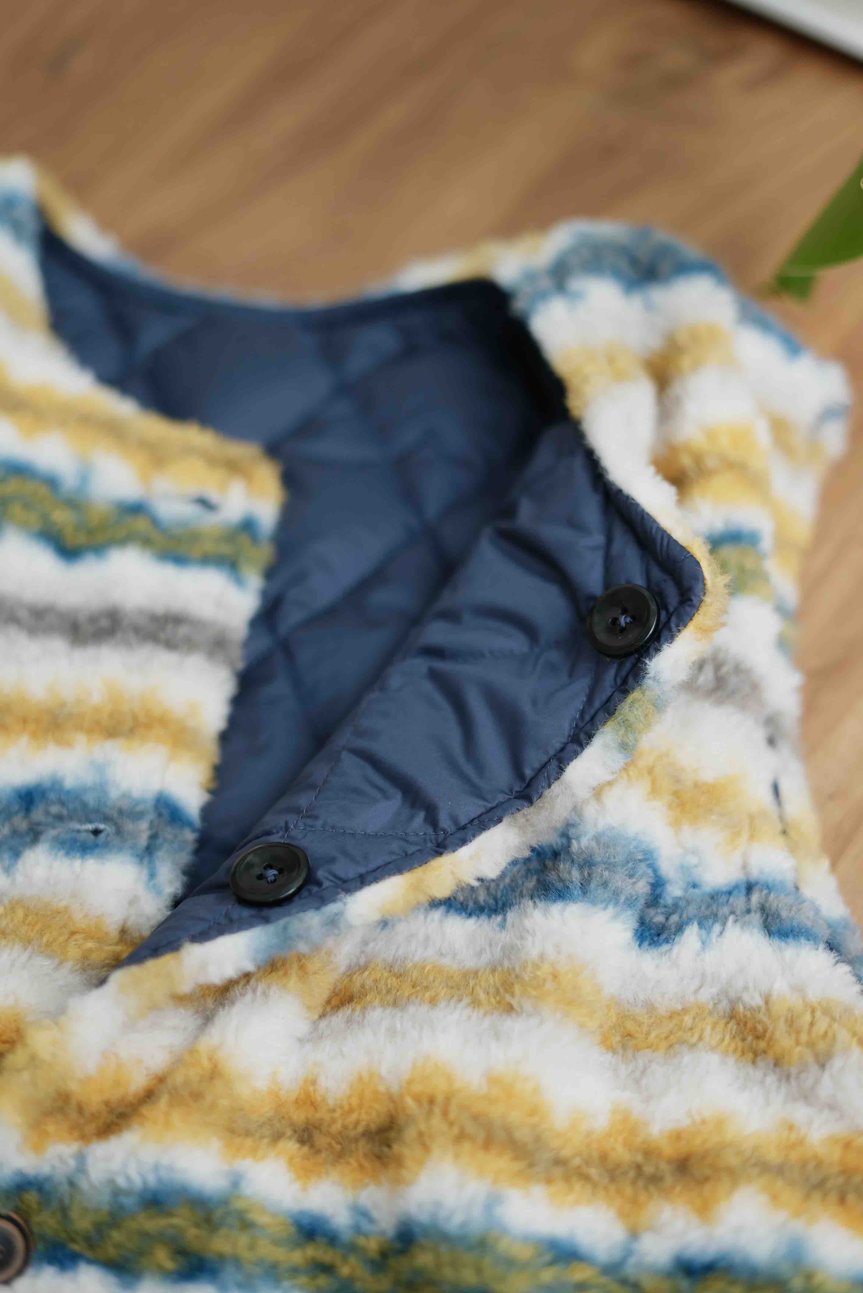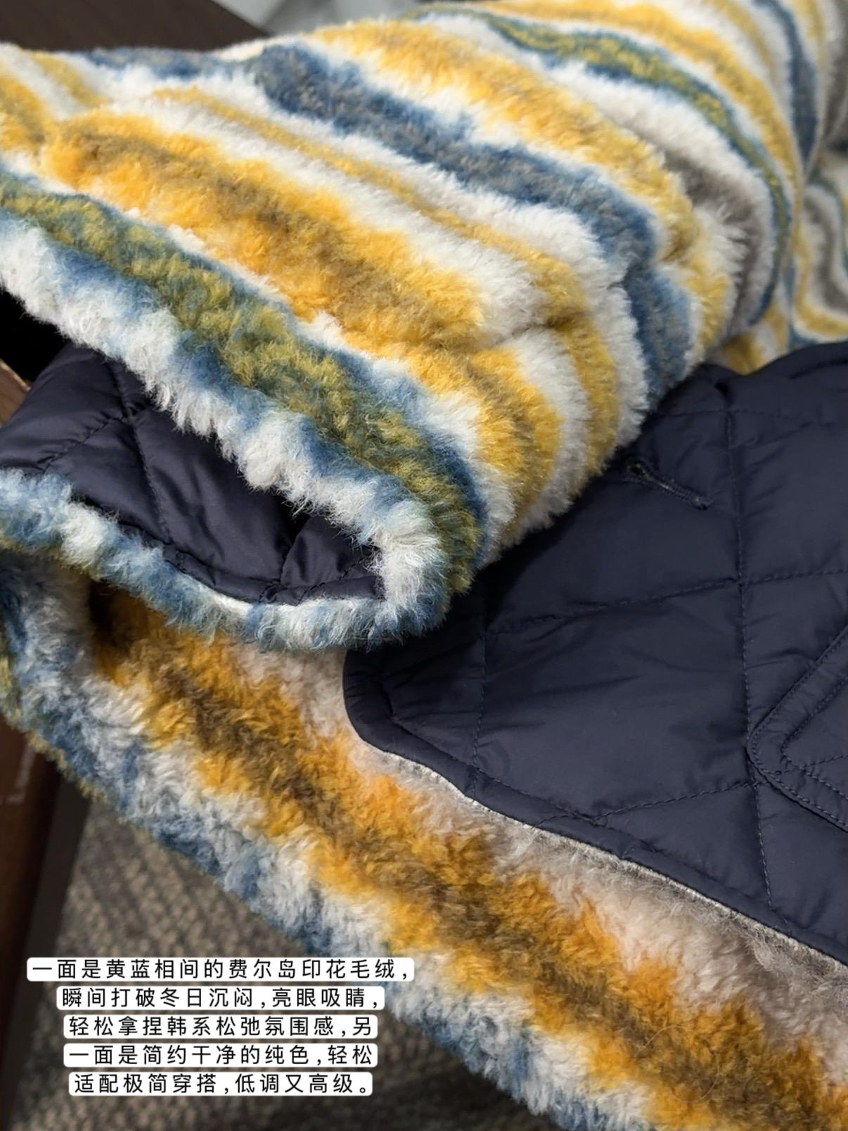 一面是黄蓝相间的费尔岛印花毛绒,瞬间
