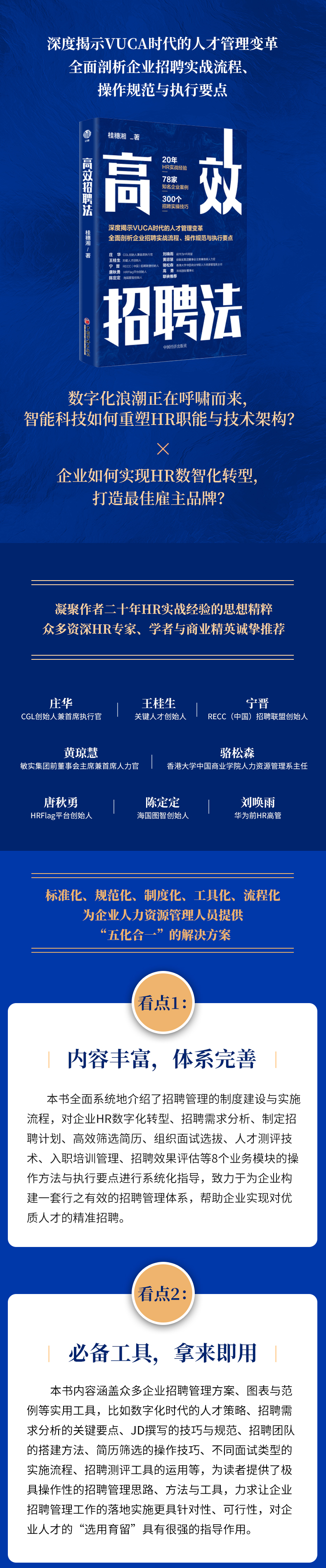 本书从企业招聘管理工作的实际出发,采取“制度建设+操作流程+执行要点+图表工具”的框架思路,系统介绍了HR数字化转型、招聘需求分析、制定招聘计划、*筛选简历、组织面试选拔、人才测评技术、入职培训管理等7大业务模块、198个工作环节的规范化执行进行了详细解析,为读者提供了*操作性的模型、工具与方案,致力于为企业构建了一套行之有效的招聘管理体系,帮助企业实现对优质人才的*招聘。