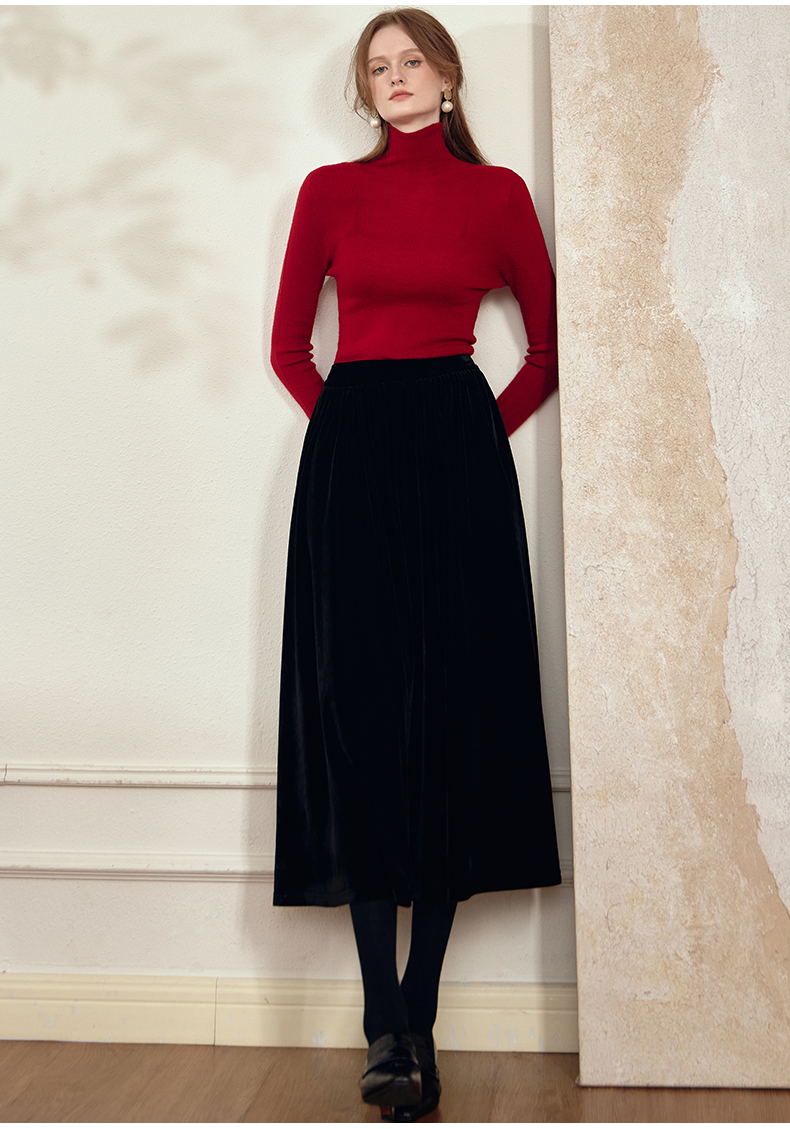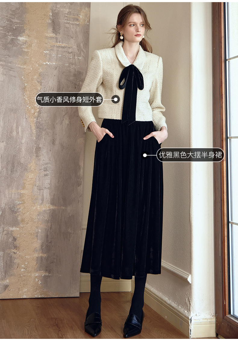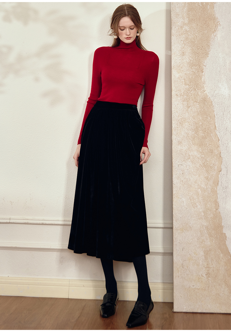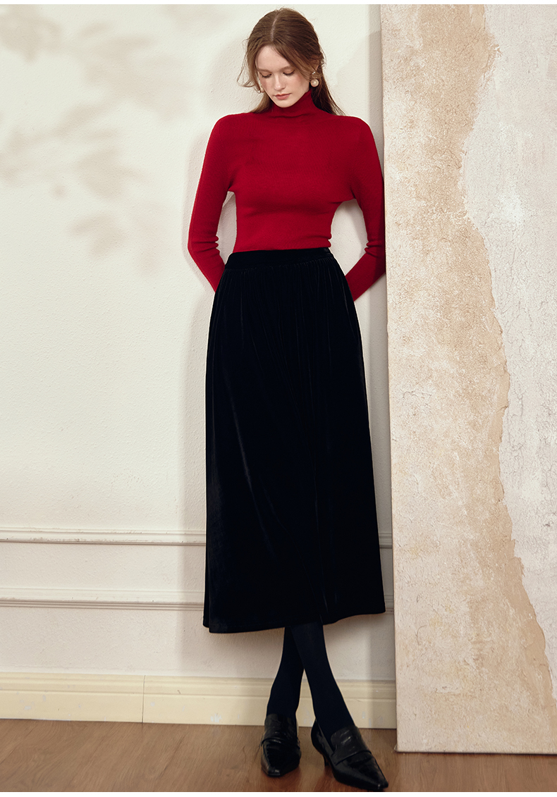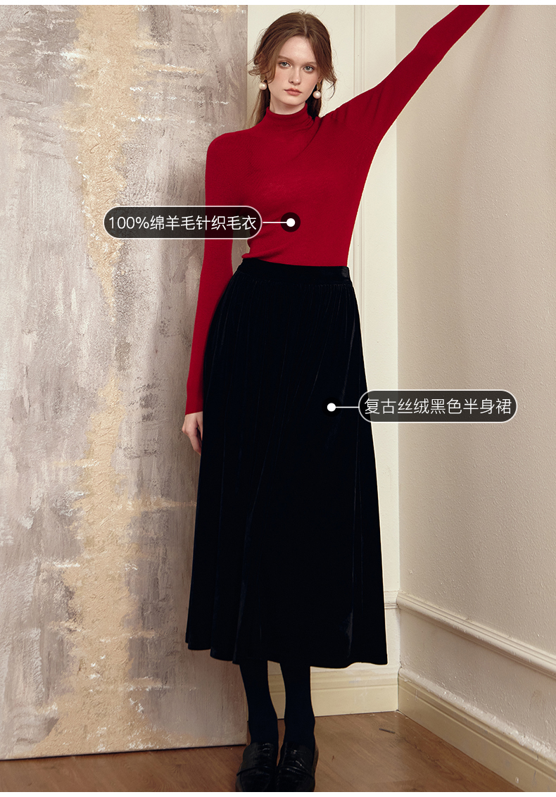 BE09785罗衣复古丝绒黑色高腰半身裙2023冬装新款优雅大摆褶皱裙子
