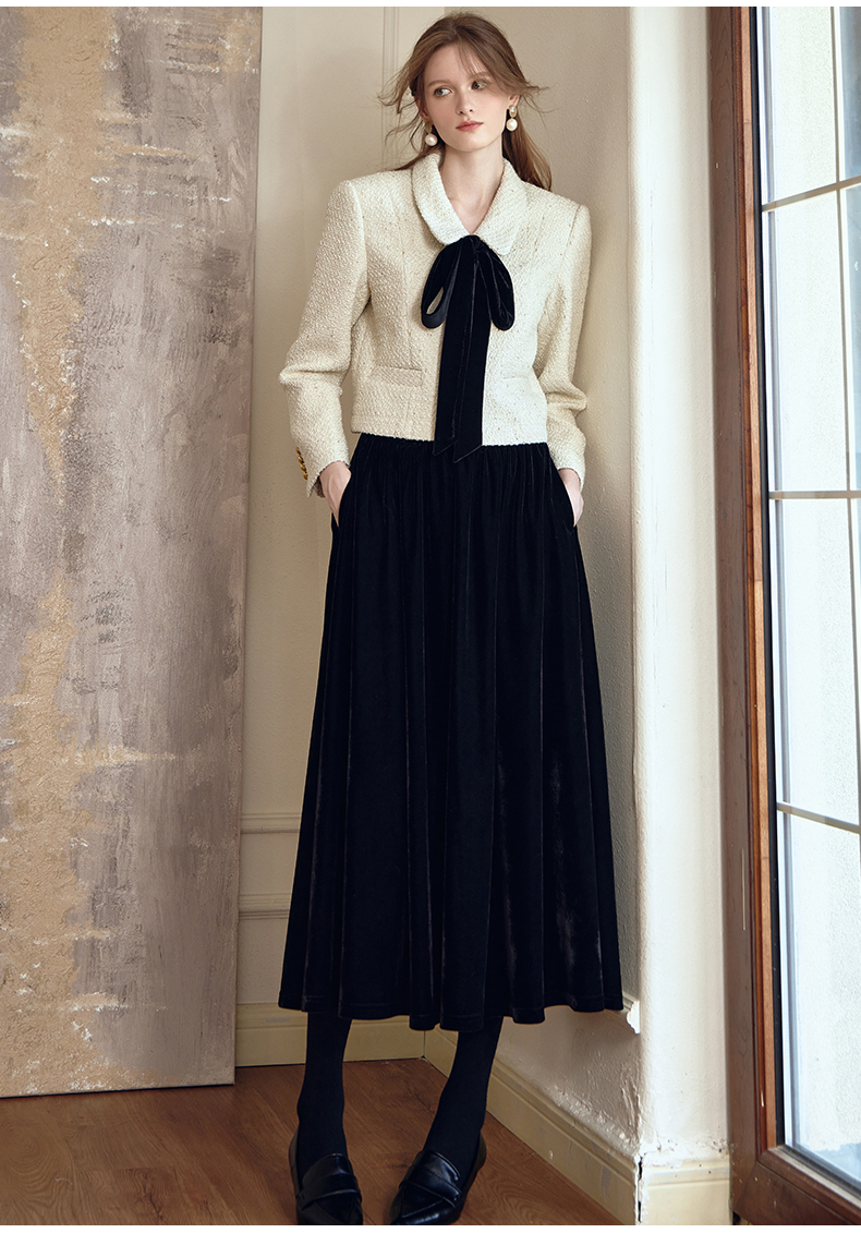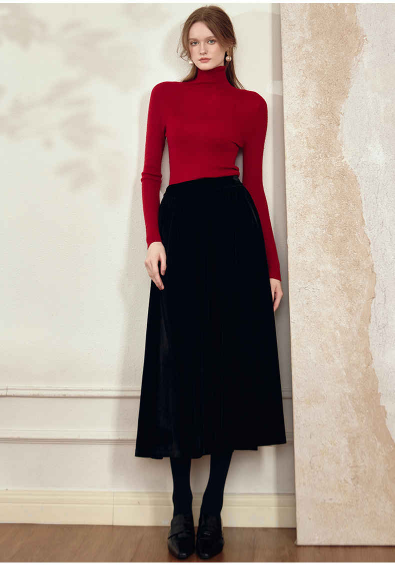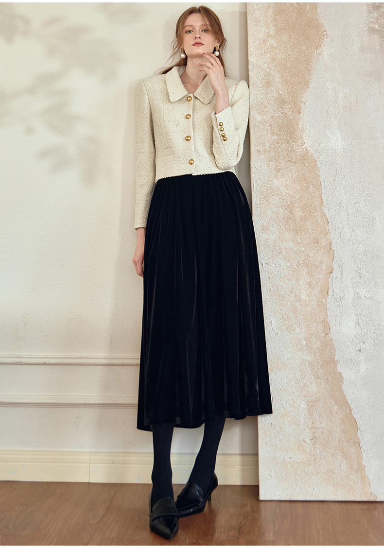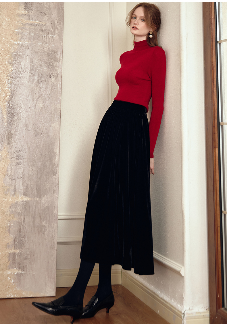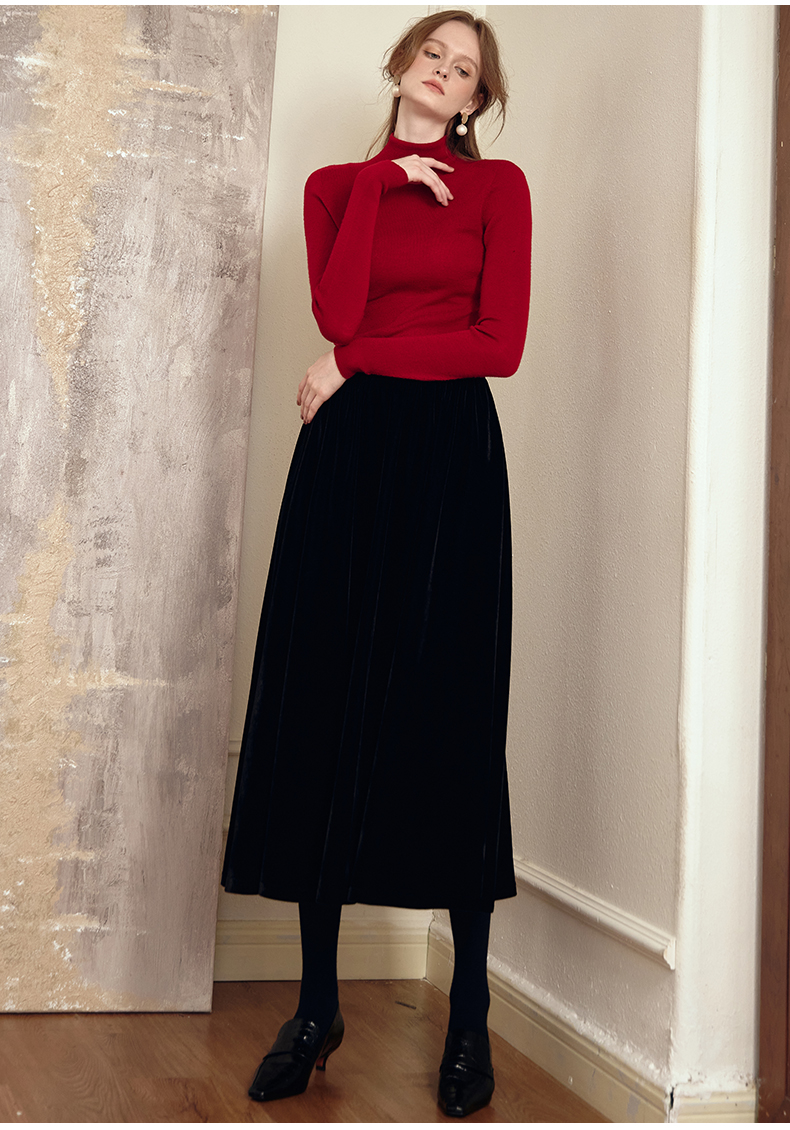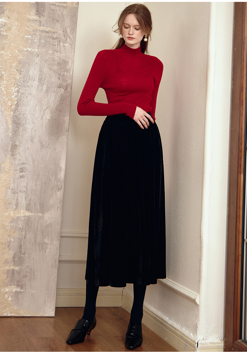 BE09785罗衣复古丝绒黑色高腰半身裙2023冬装新款优雅大摆褶皱裙子