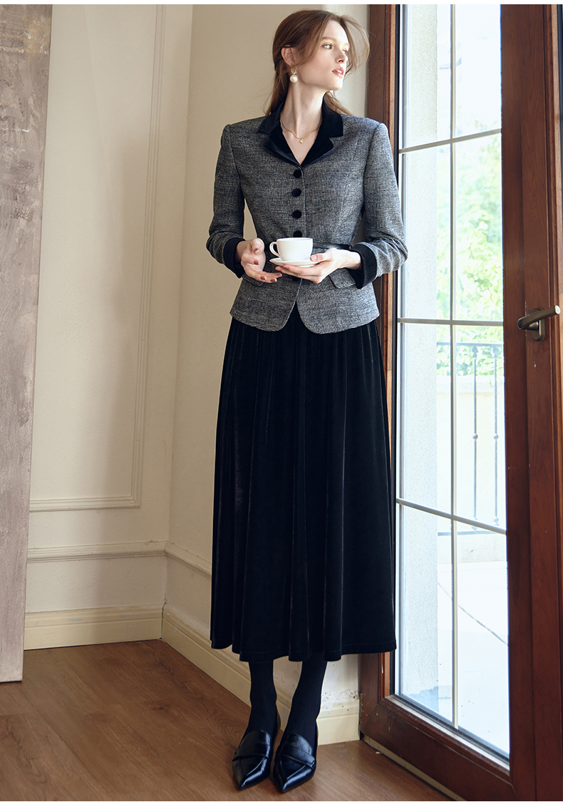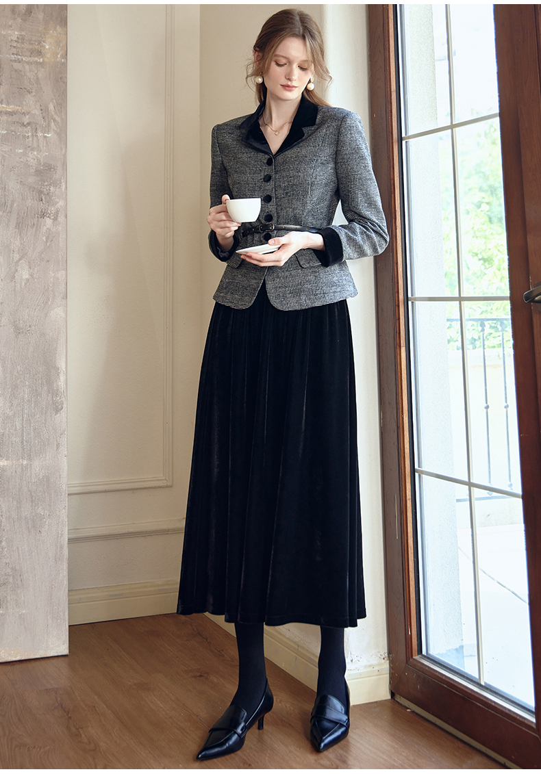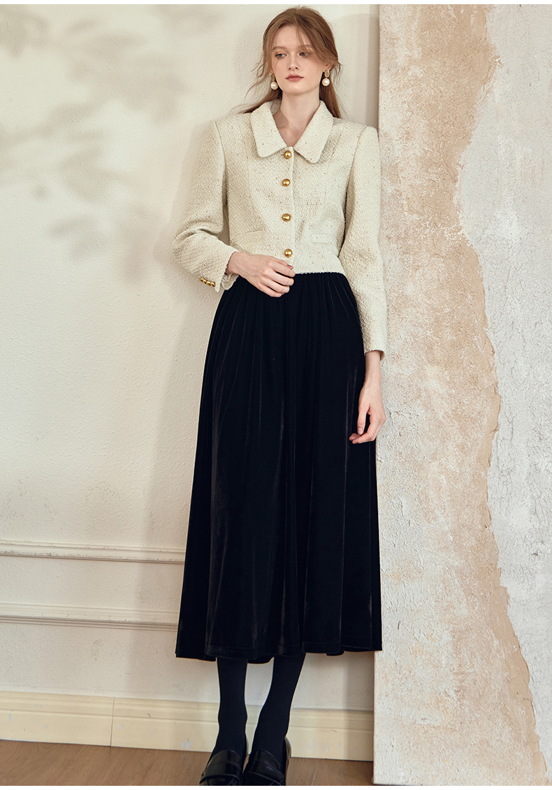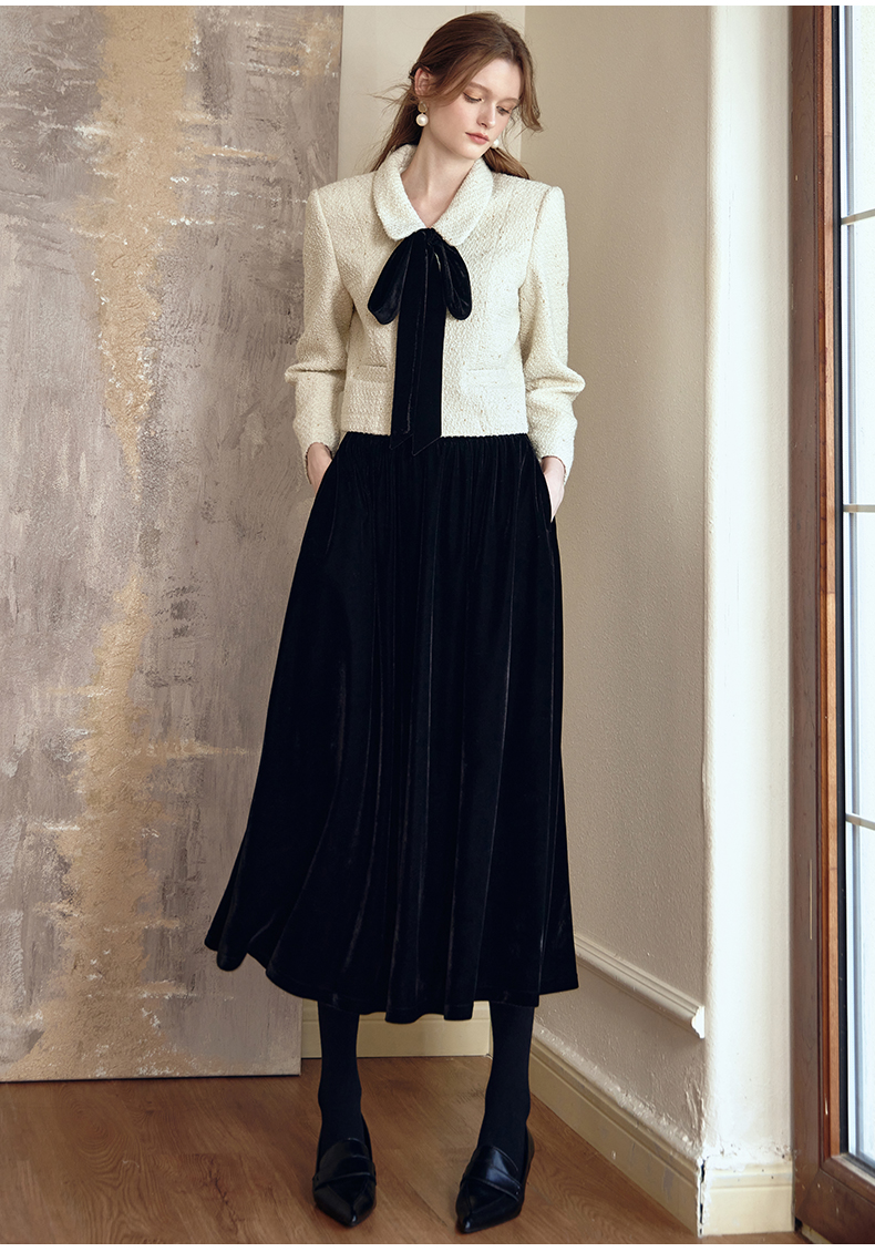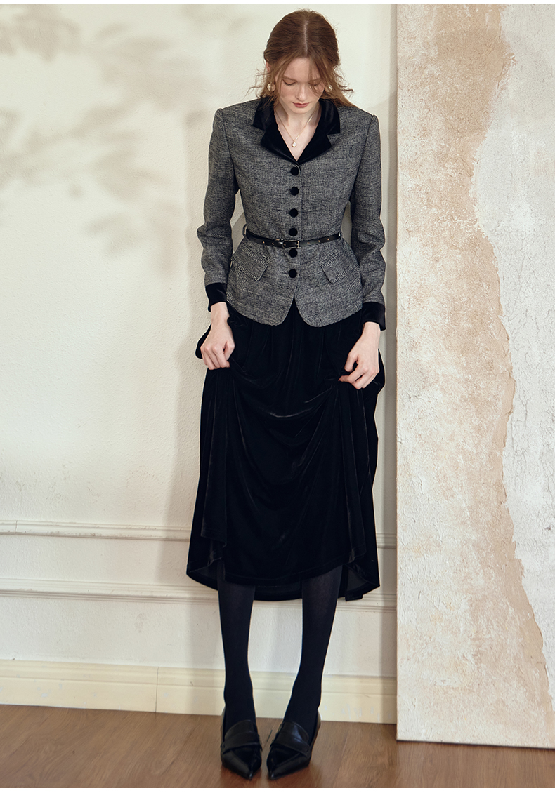BE09785罗衣复古丝绒黑色高腰半身裙2023冬装新款优雅大摆褶皱裙子