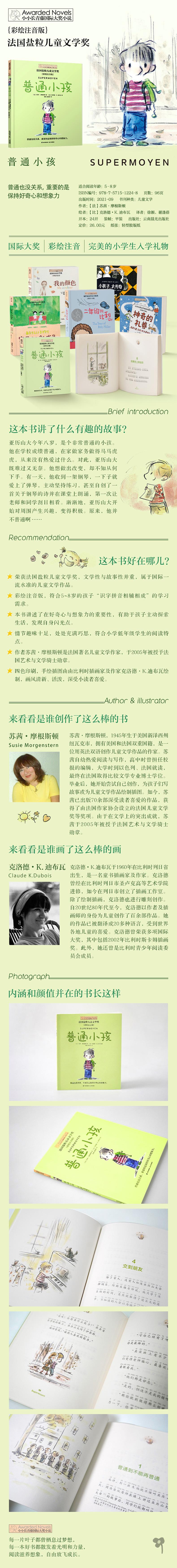 ★《普通小孩》荣获法国盐粒儿童文学奖,文学性与故事性并重,属于不错水准的儿童文学作品。 ★本书是彩绘注音版,符合5~8岁的孩子“识字拼音相辅相成”的学习需求。国际大奖小说保证了故事的经典性与可读性,能够让孩子在上学之初即与世界孩子站在同一起跑线上。 ★本书讲述了一个原本觉得自己很普通的小孩,在好奇心与想象力的驱动下,主动探索生活,发现自身闪光点的故事。让孩子们更加珍视自己的好奇心,明白自己是独一无二的。 ★本书作者苏茜·摩根斯顿是法国有名儿童文学作家,曾荣获由法国作家协会设立的法国儿童文学奖等多项国际大奖,并于2005年被授予法国艺术与文学骑士勋章。 ★本书情节趣味十足,处处充满巧思,符合小学低年级学生的阅读特点,促使小读者不停翻阅,提高阅读水平。 ★全书采用四色印刷,手绘插图由比利时插画家及作家克洛德·K.迪布瓦绘制。克洛德荣获包括比利时斯卡姆插画奖等多项国际大奖。她的画风清新、活泼,深受小读者喜爱。