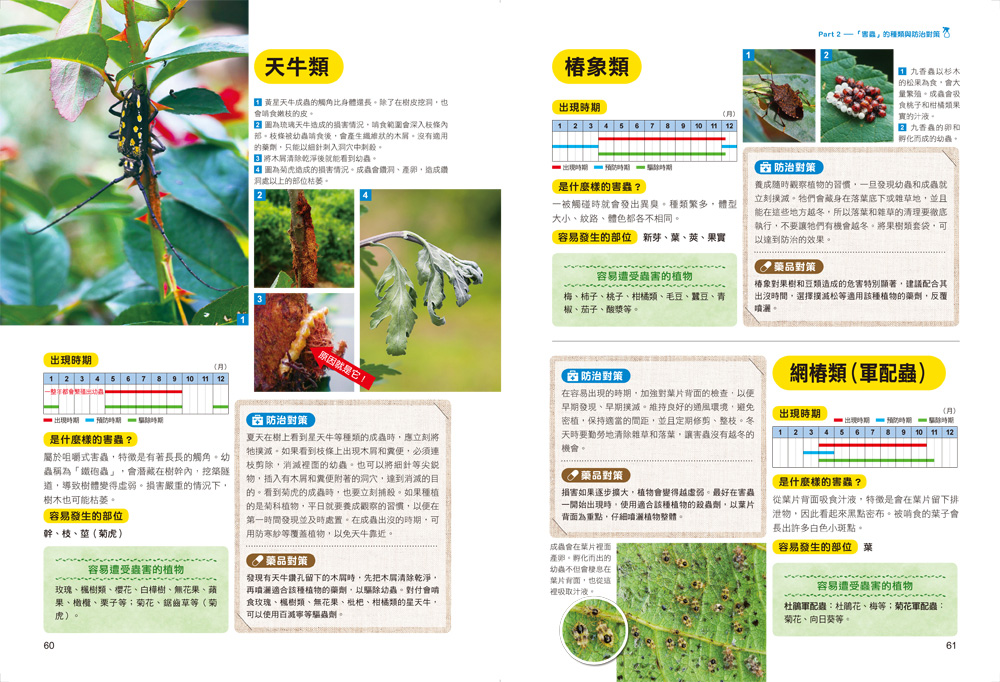 全書收錄66種黴菌、細菌、病毒與害蟲,詳細說明易發病的季節、染病的原理、容易發病的植物部位、染病時會出現的症狀、以及發病的解決對策等。不僅要告訴你如何事先做好預防策略,當病蟲害發生時,也不會束手無策,可以採用最正確的方法去除病因,不讓疾病範圍擴大,避免病害捲土重來。