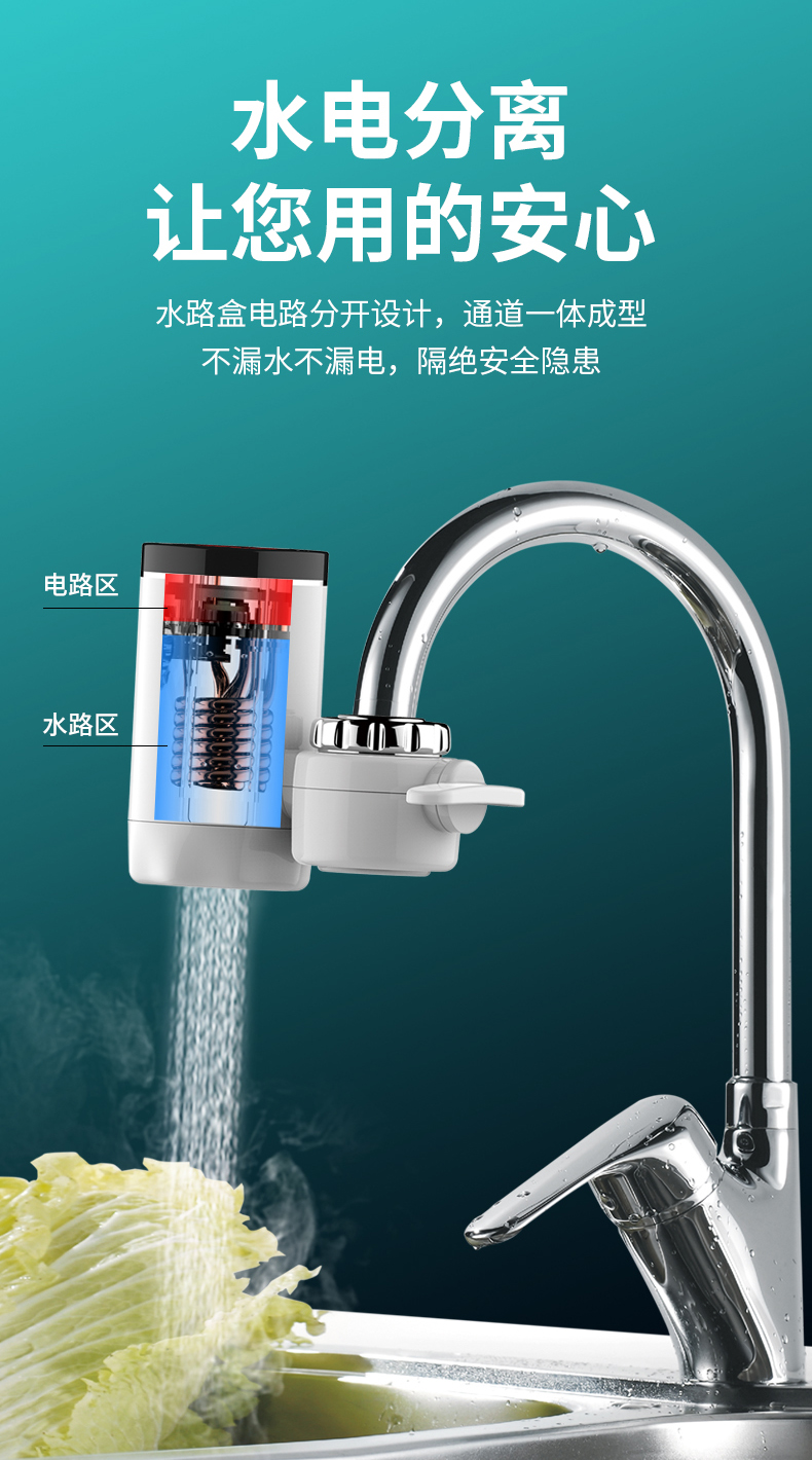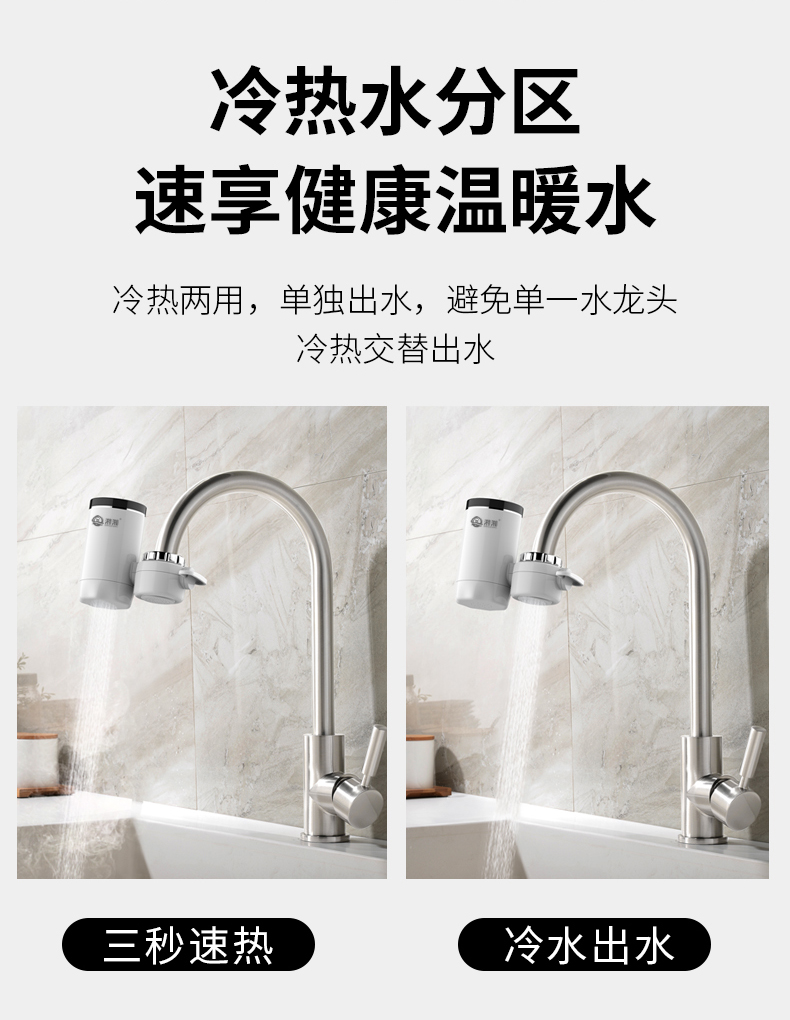 1、冷热两用,无极温控,3秒速热,双出水口设计