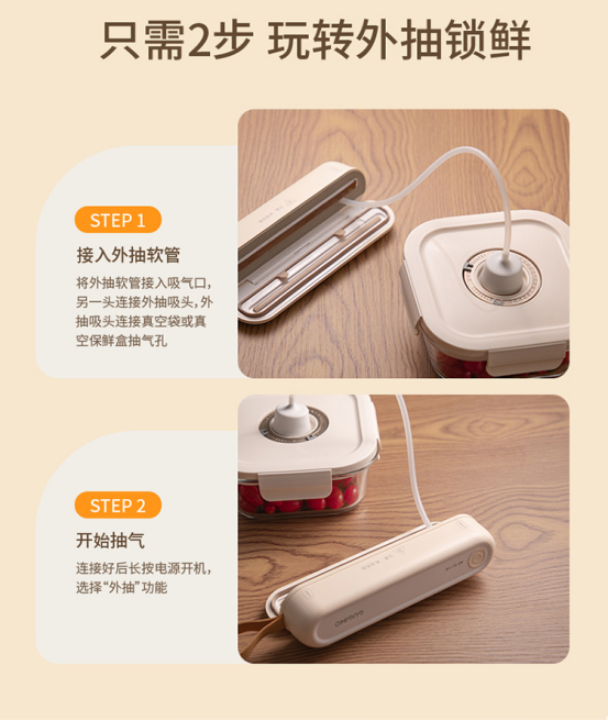 多种保鲜模式 真空封口/外抽真空/单独封口 真空外抽,干湿通用 不挑食物状态
