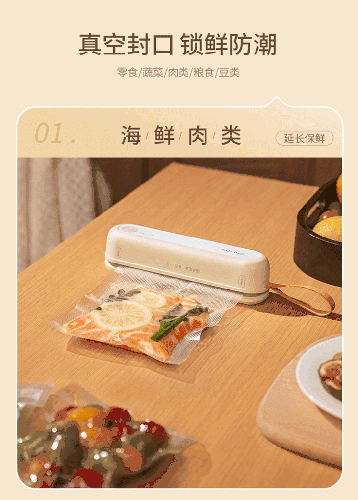 真空封袋,抑菌锁鲜 60KPa强劲吸力,秒制真空袋 食材荤素分装冰箱不串味 有效减缓发霉变质过程,延长食材保鲜期 真空封口机通过抽取包装袋内的空气 极大程度地防止食品氧化与变质