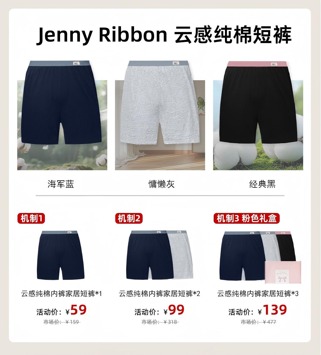 免穿内裤 一“裤”到底 | Jenny Ribbon纯棉云感系列 2in1内裤家居短裤(三色可选)