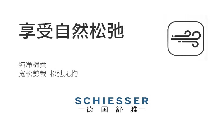 - 来自德国的SCHIESSER舒雅,专注做内衣一百四十余年,不遗余力的材料创新,因材而异的专业剪裁,健康环保的加工技术以及充满文化关注的时尚主题,做你认识之外的舒适内衣。