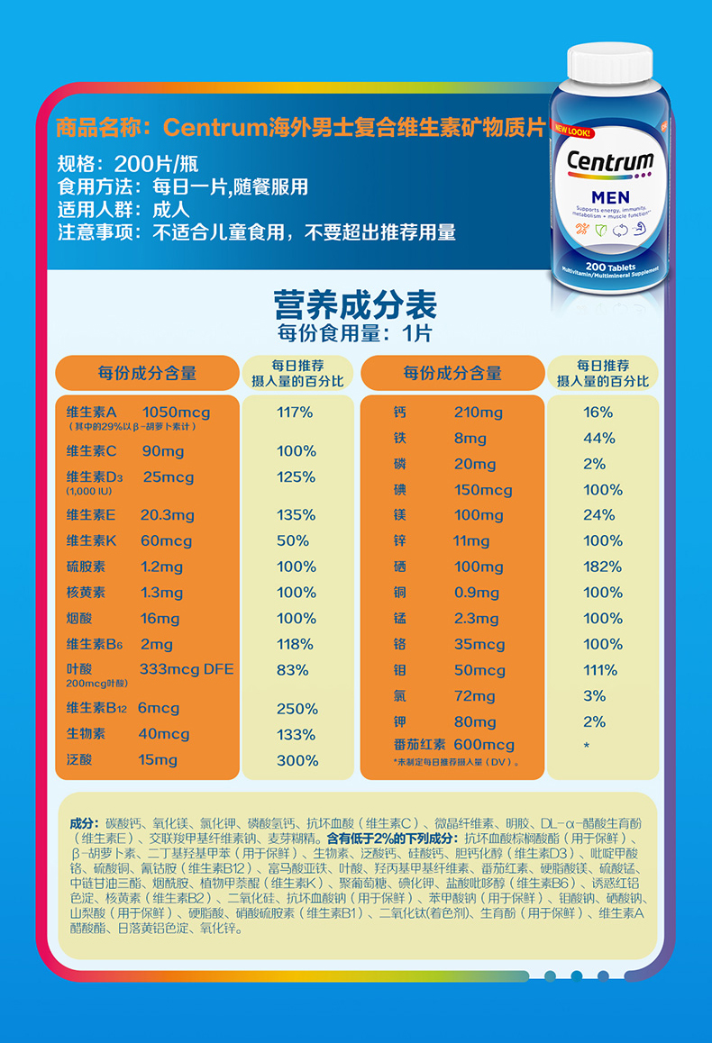 【跨境直供】美国善存男士维生素 200粒