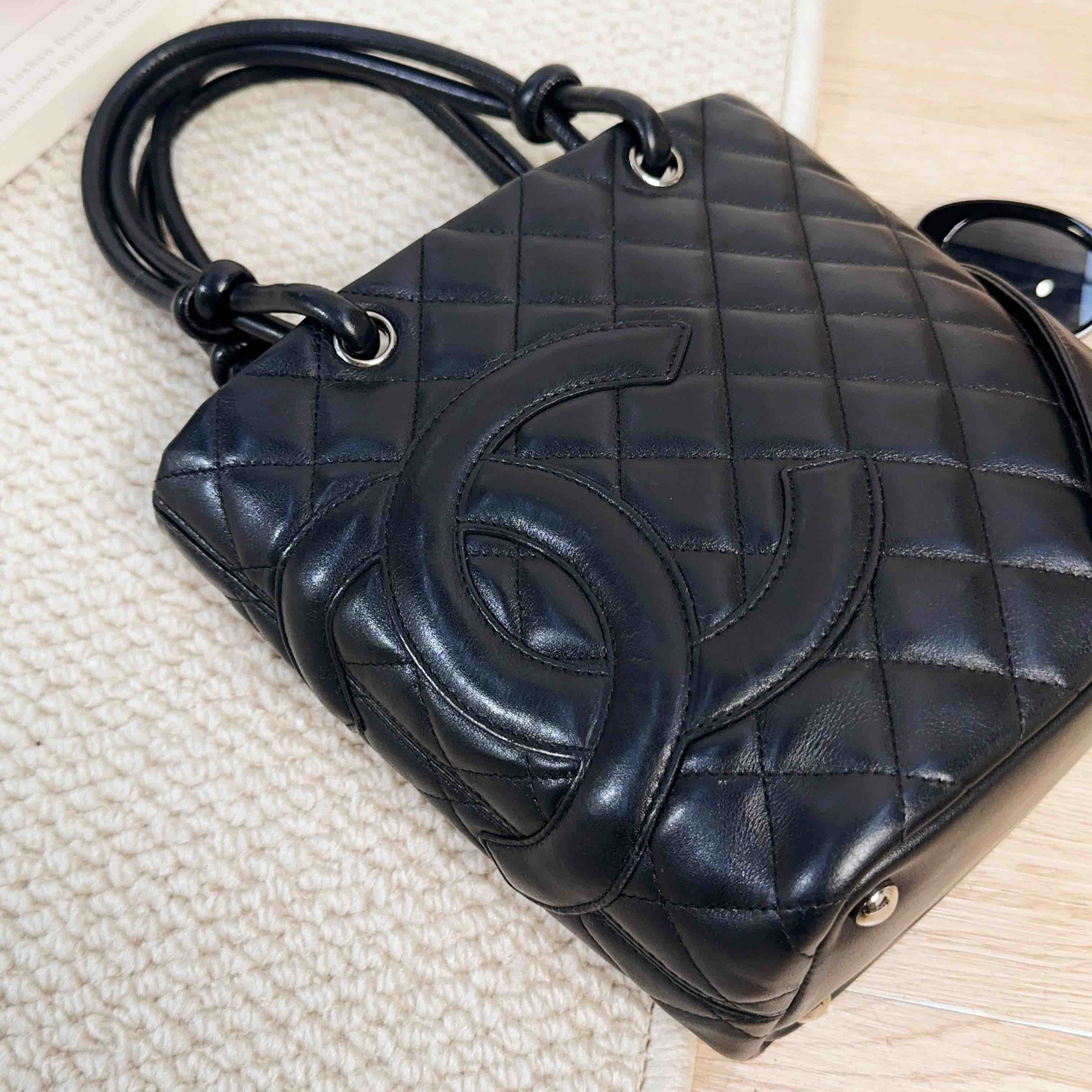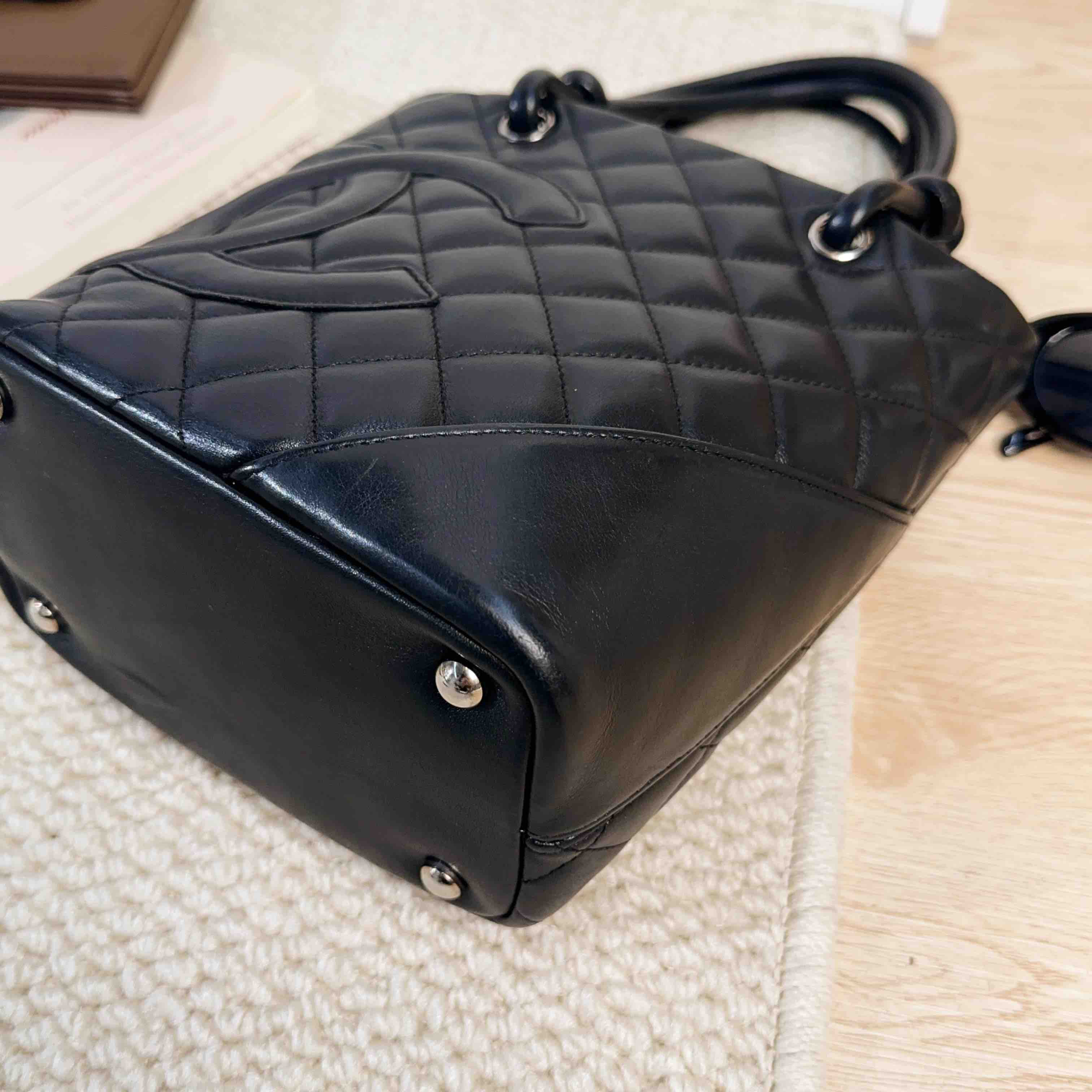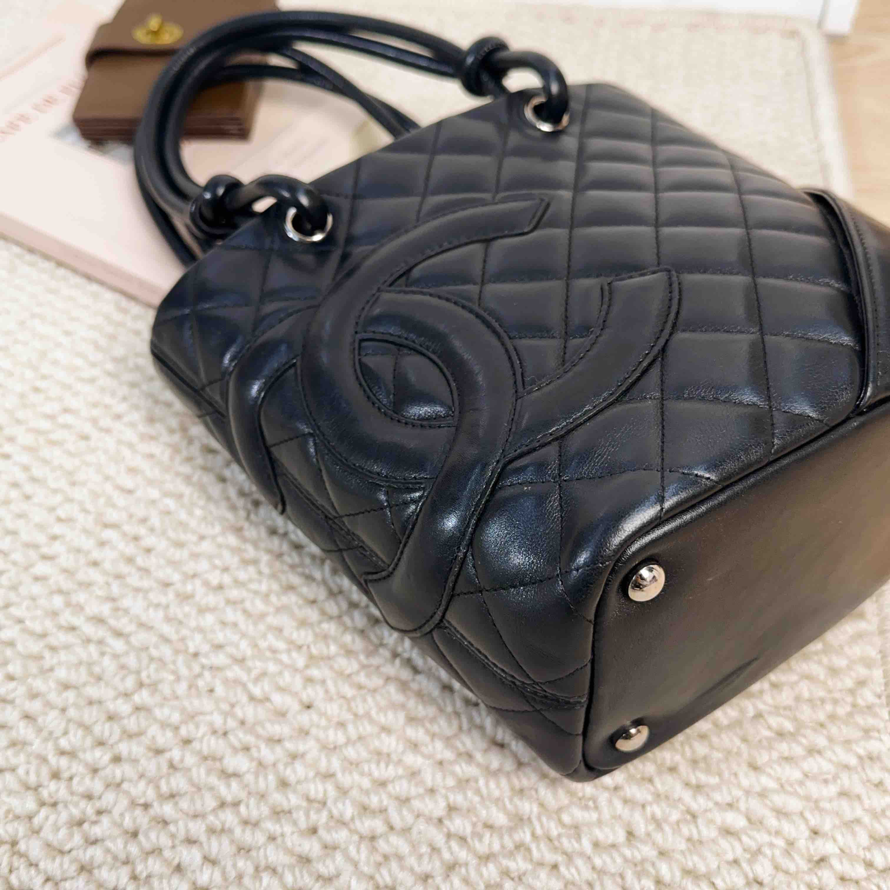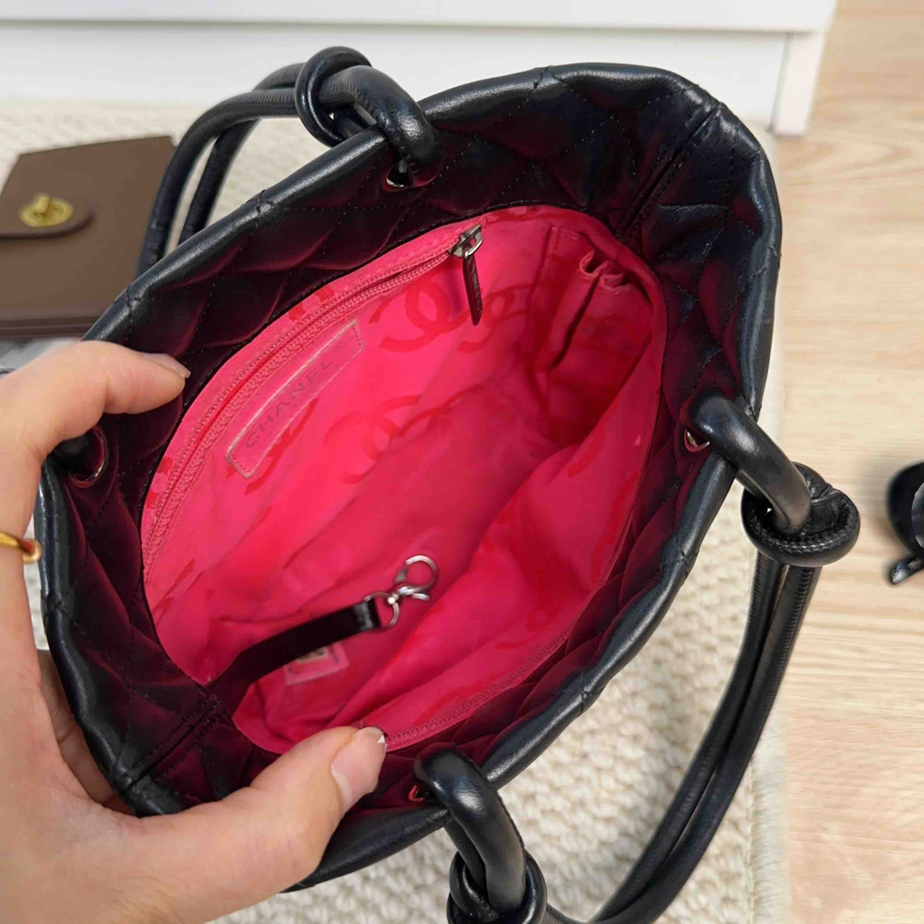 【商品描述】正品二手 Chanel 康鹏 黑色 羊皮 mini 菜篮子 手提包🍒95新 15×19 有镭射。包口和包底边角轻微使用磨损 包面和包底轻微划痕感 内里正常使用痕迹