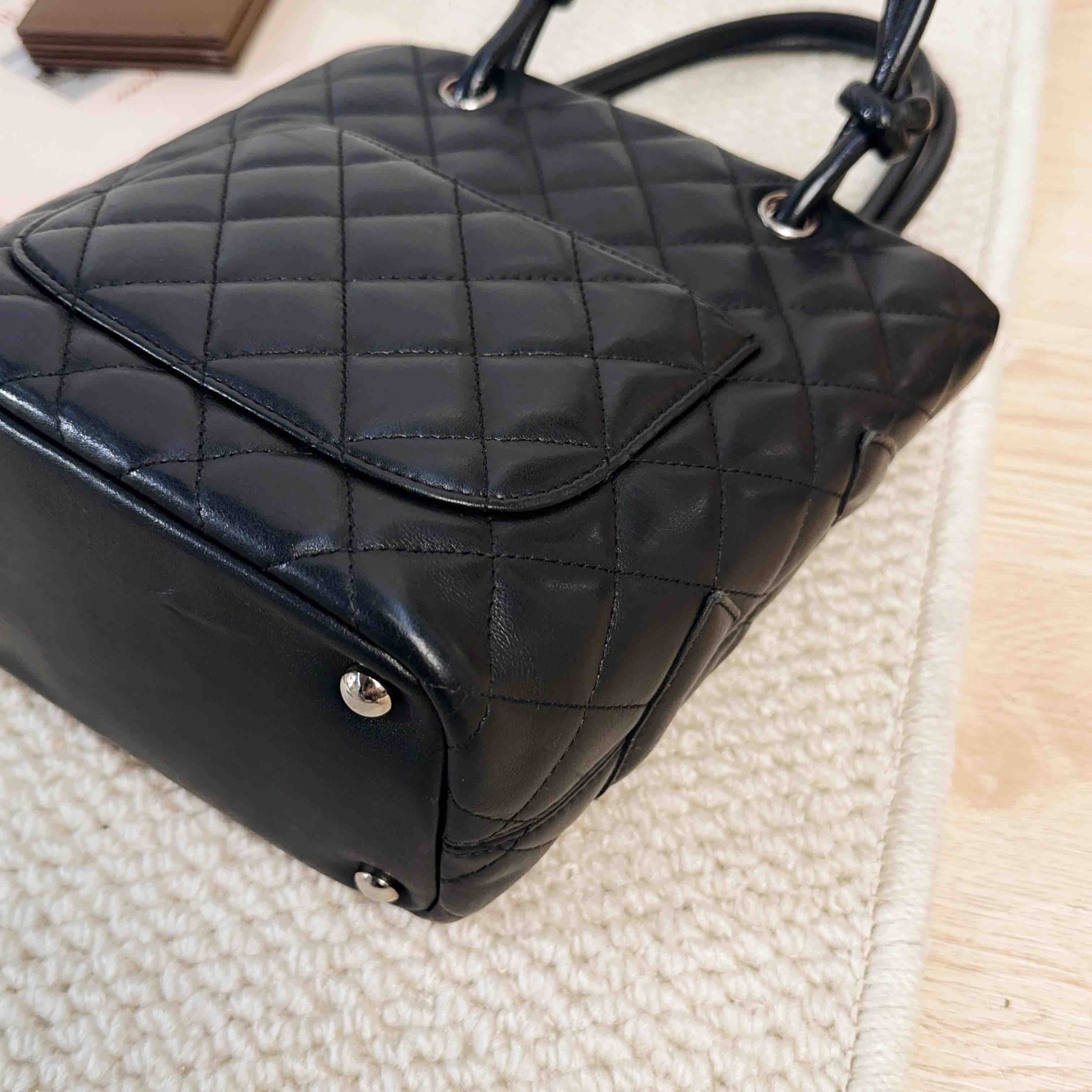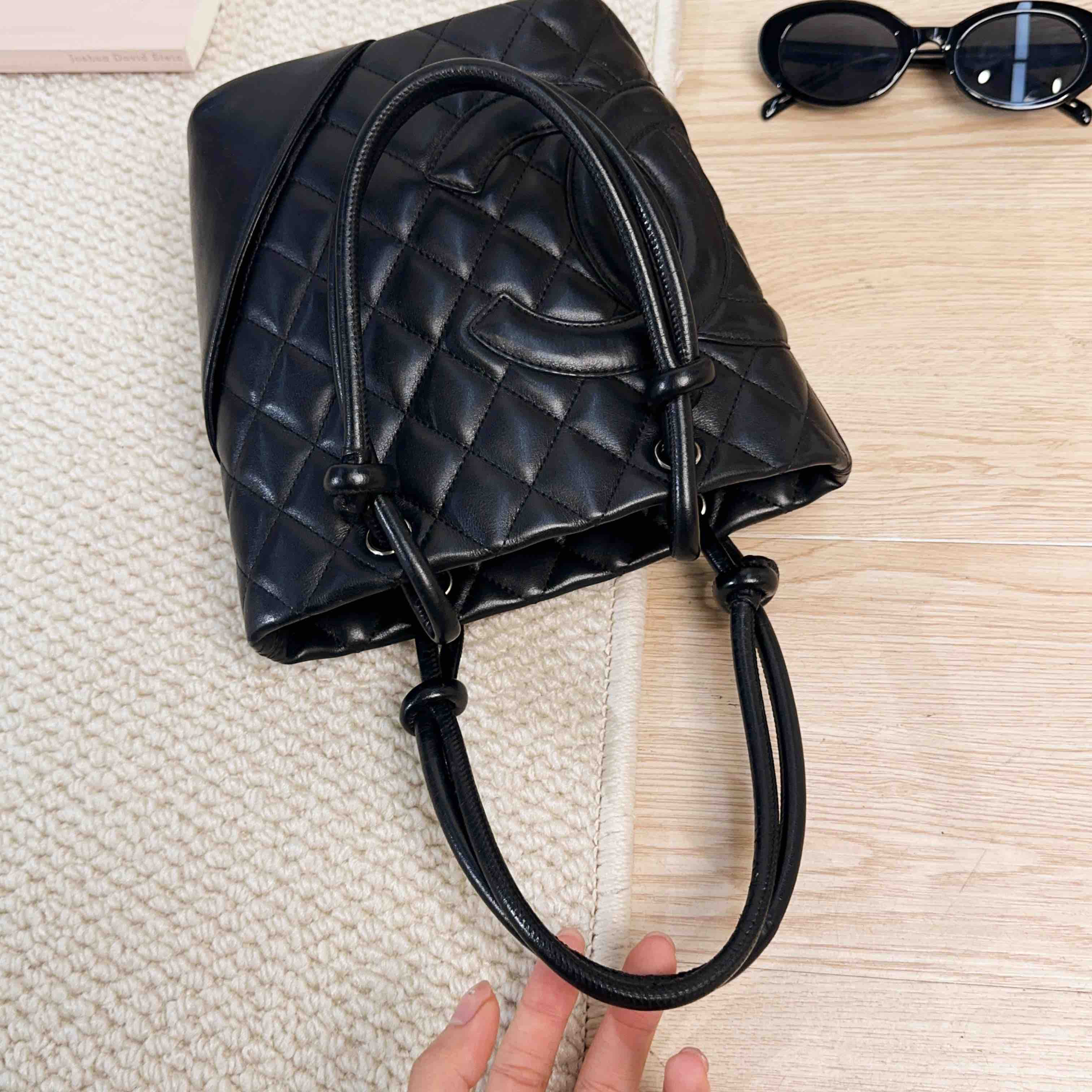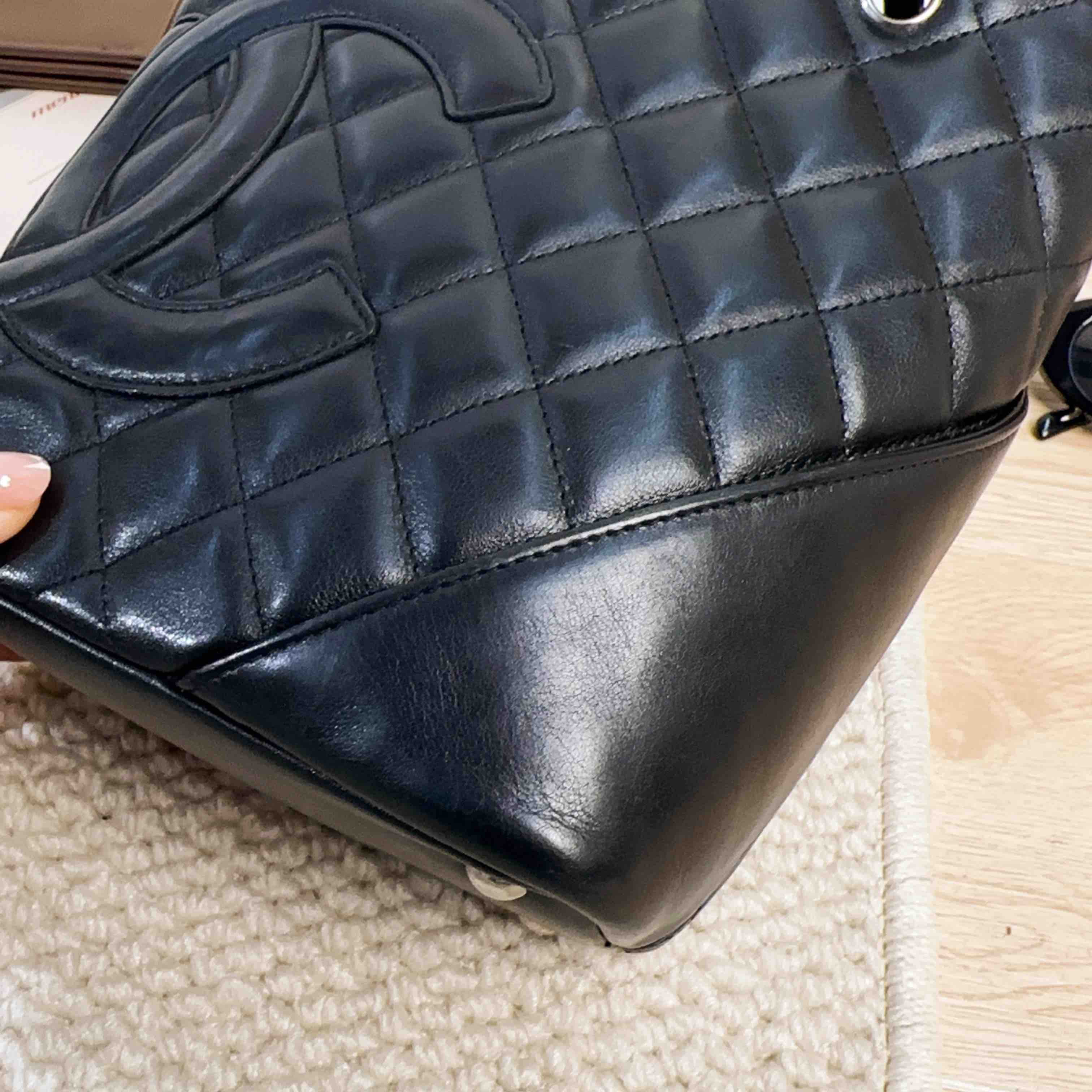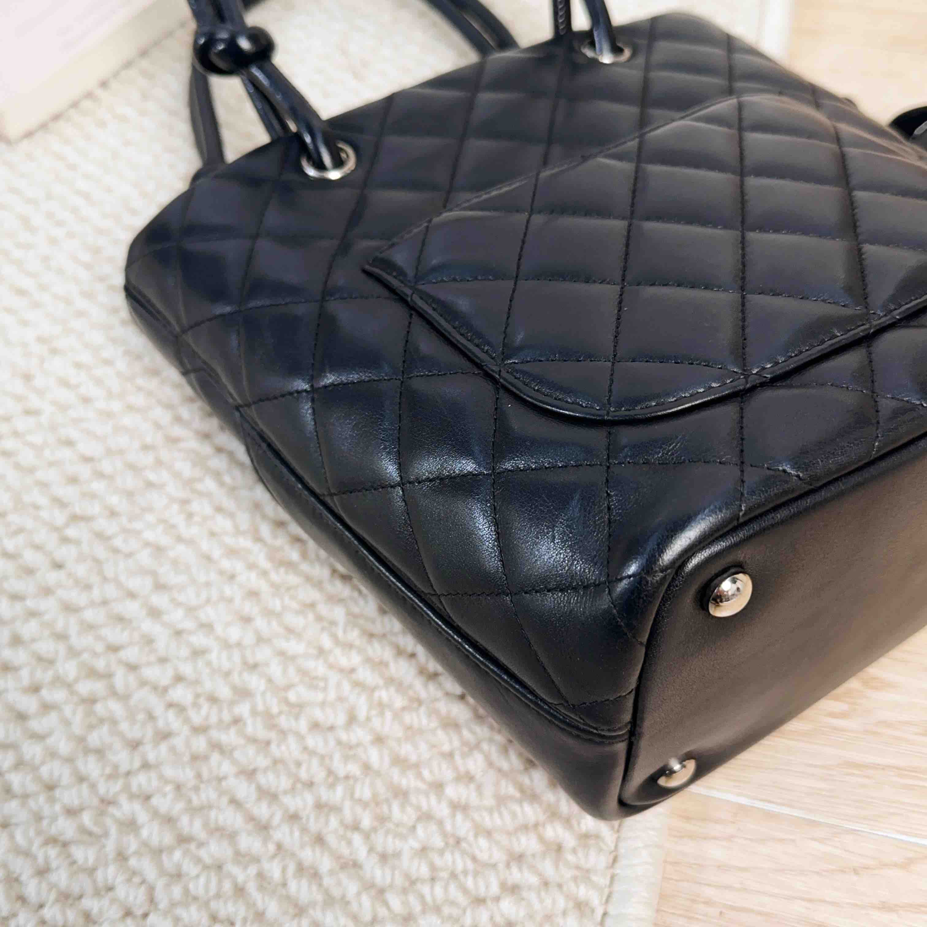 【商品描述】正品二手 Chanel 康鹏 黑色 羊皮 mini 菜篮子 手提包🍒95新 15×19 有镭射。包口和包底边角轻微使用磨损 包面和包底轻微划痕感 内里正常使用痕迹