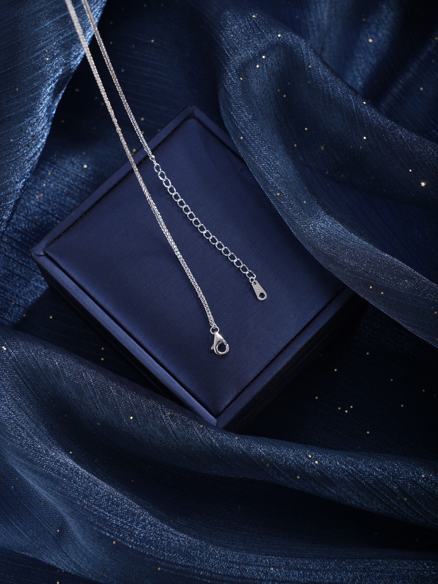【寓意】:以纯银精铸链身,蓝白双色宝石镶嵌,以菱形之形寄寓“刚柔并济”,寓意人生如福海般豁达明净,在人生航程中收获平安顺遂。