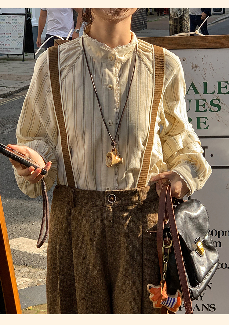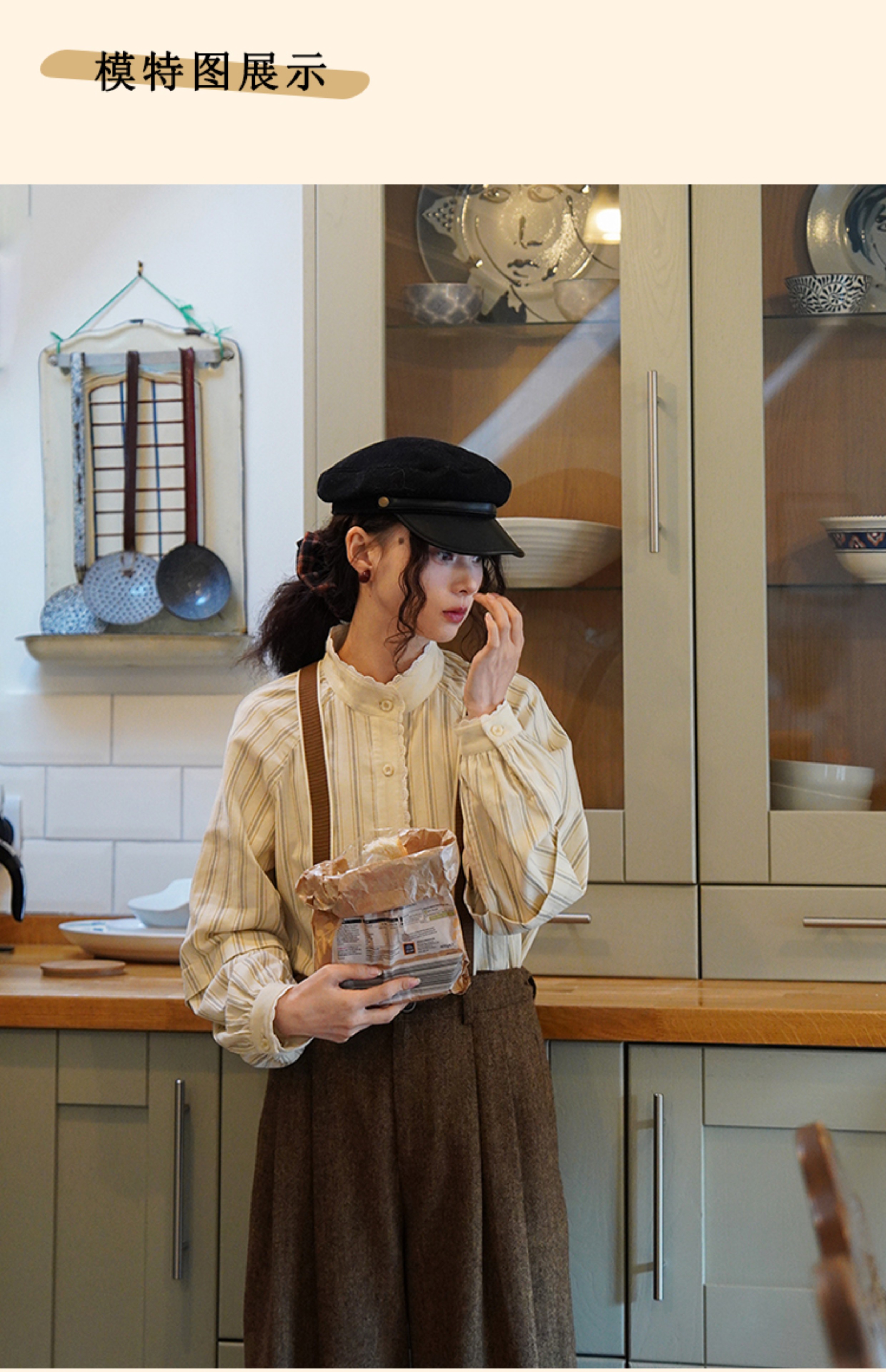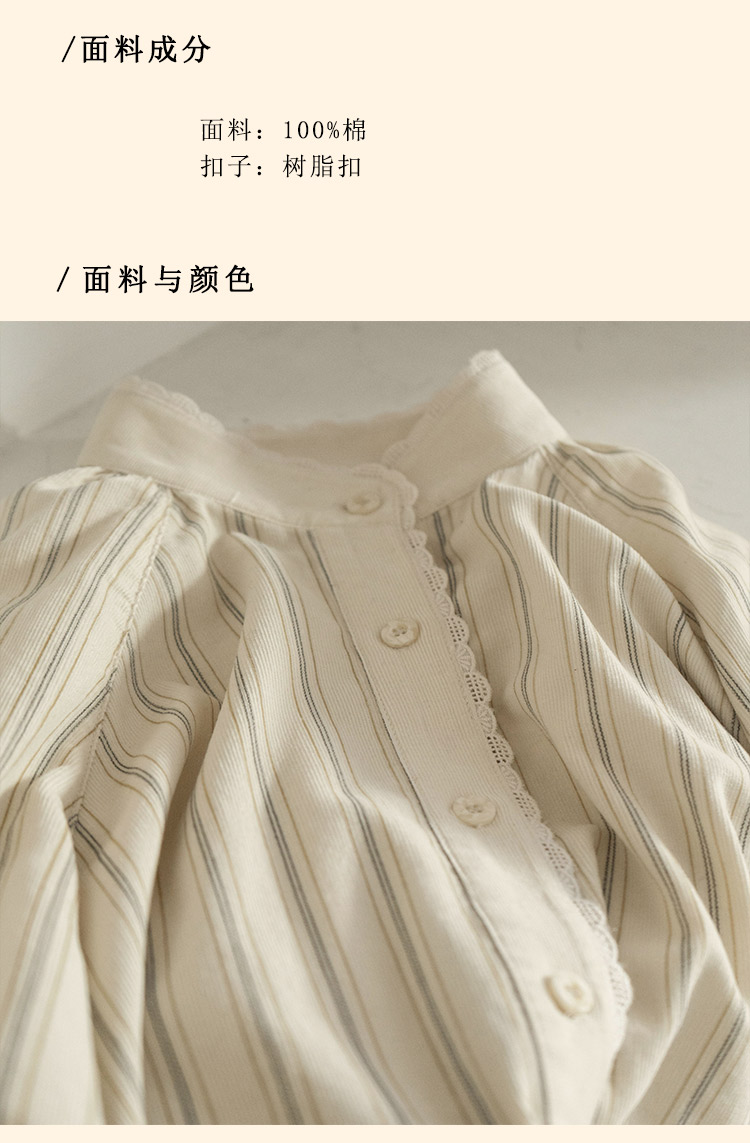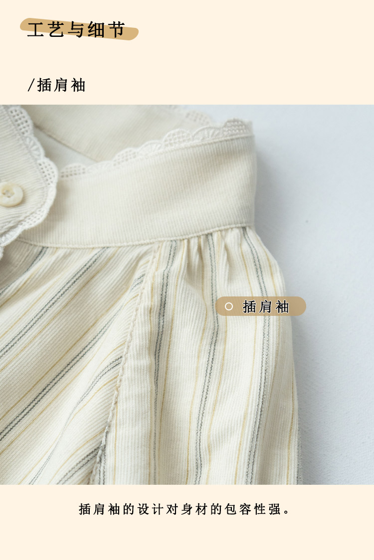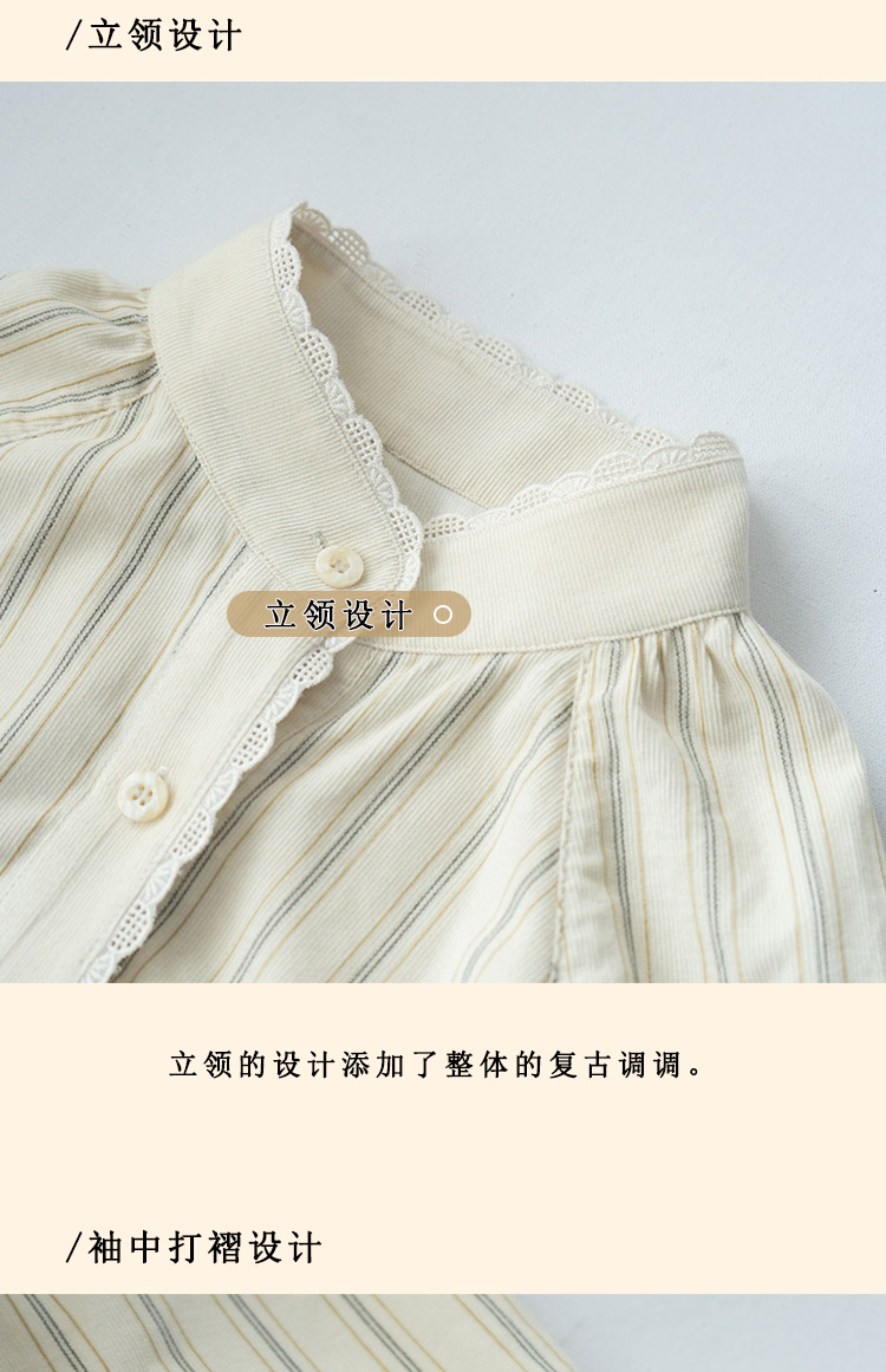 浮生八记/24C122/英伦立领花边全棉灯芯绒条纹插肩灯笼袖衬衫