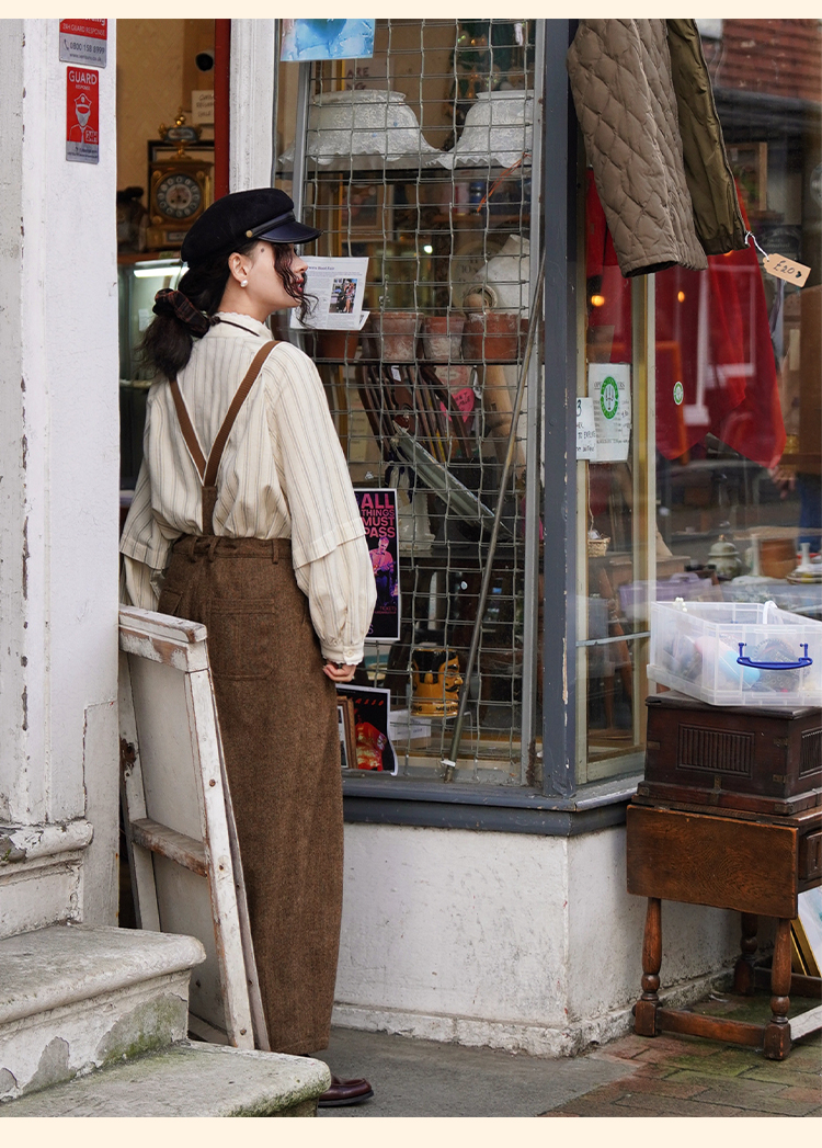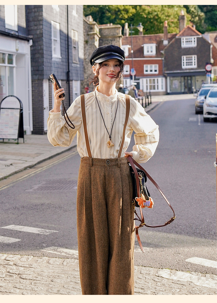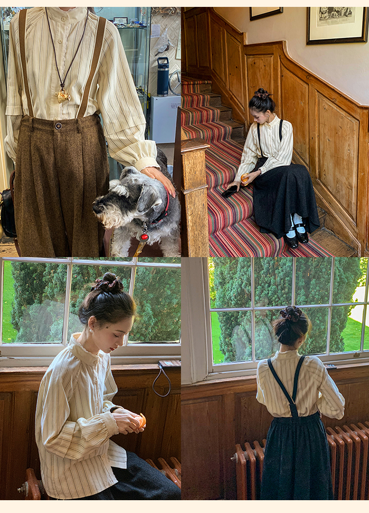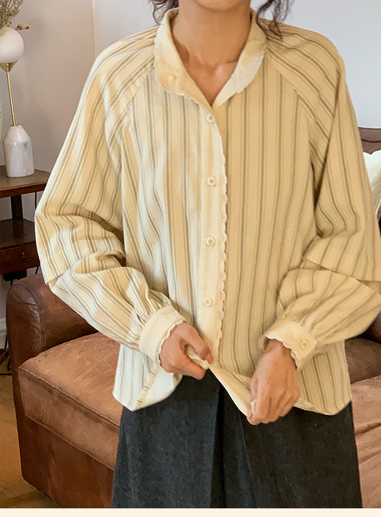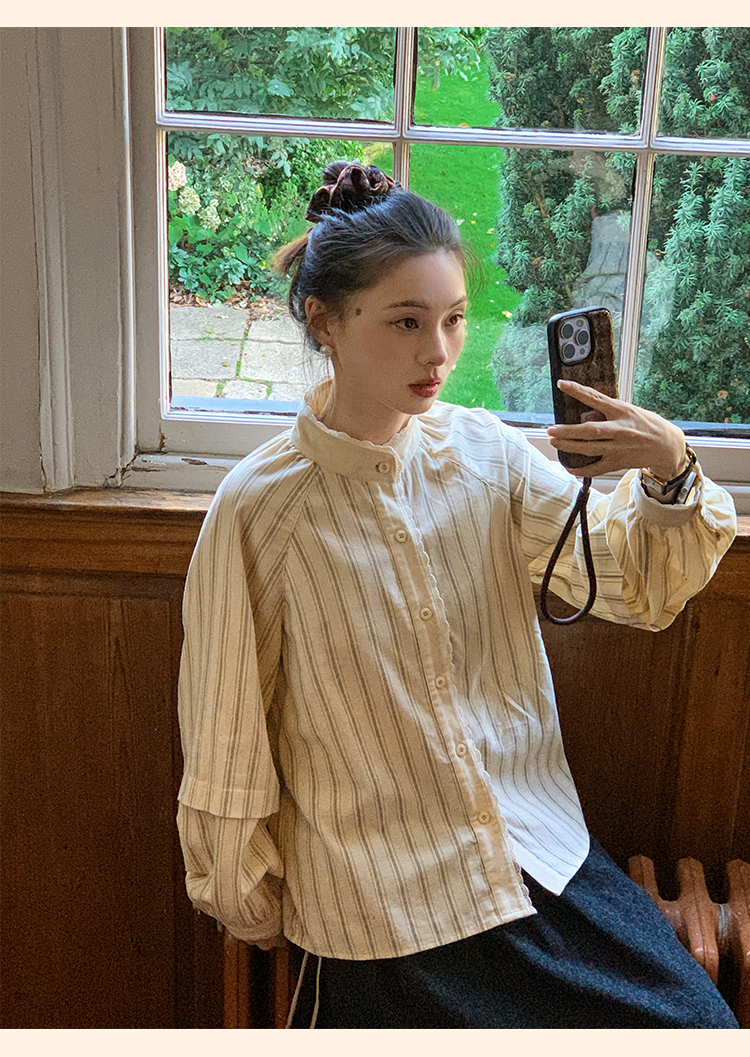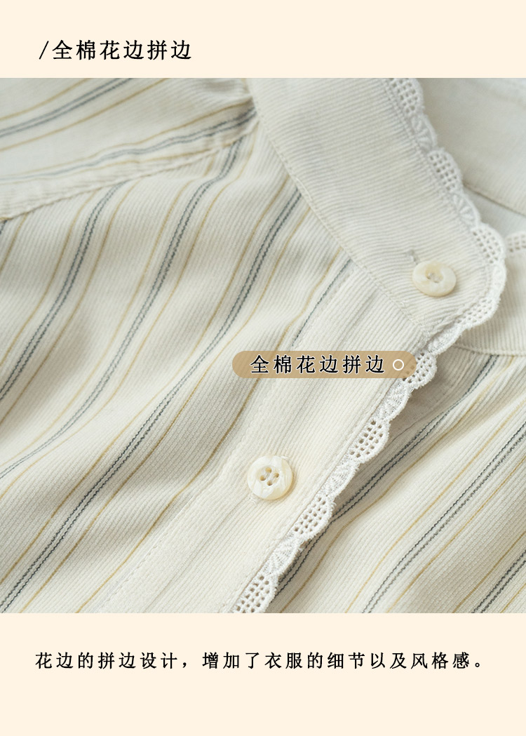 浮生八记/24C122/英伦立领花边全棉灯芯绒条纹插肩灯笼袖衬衫