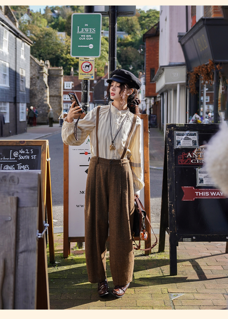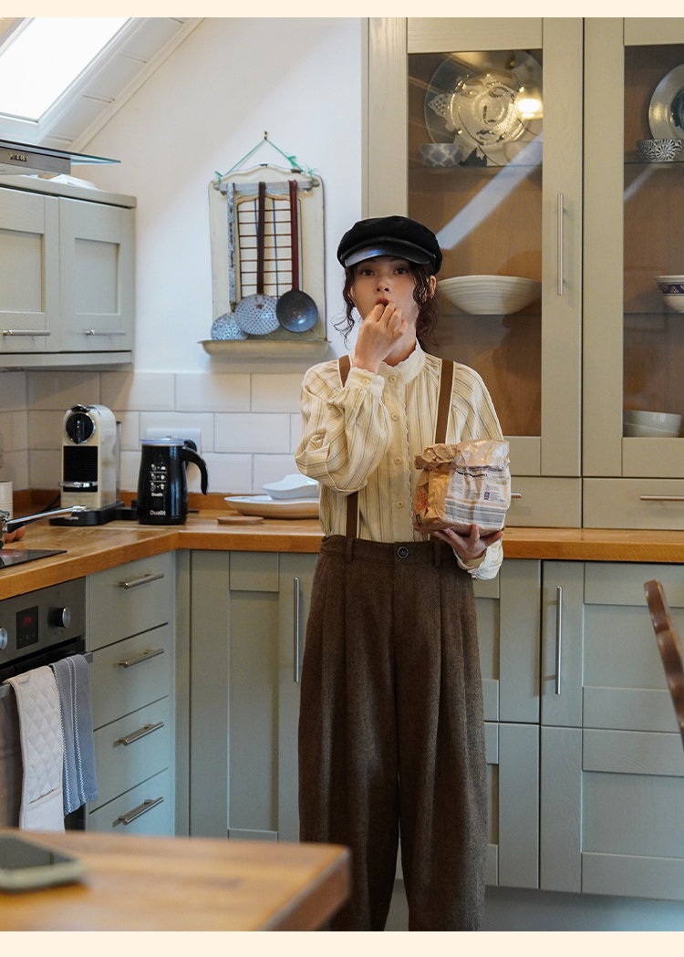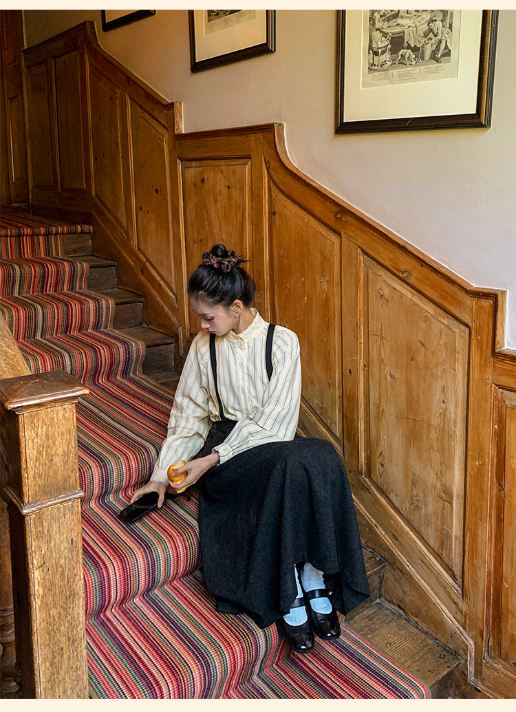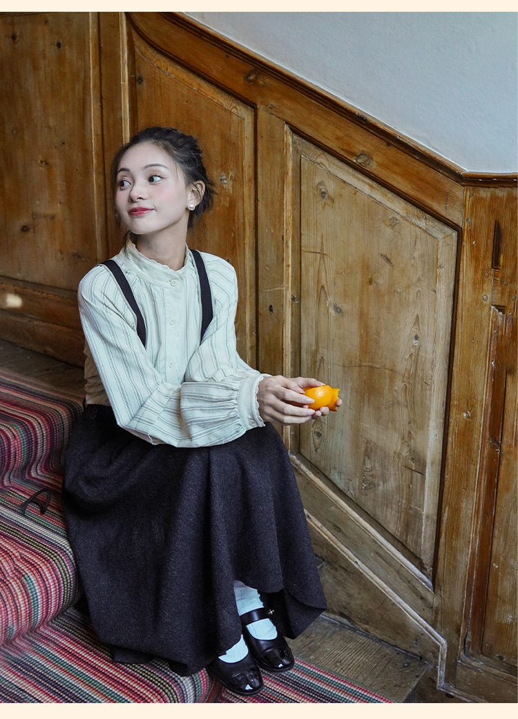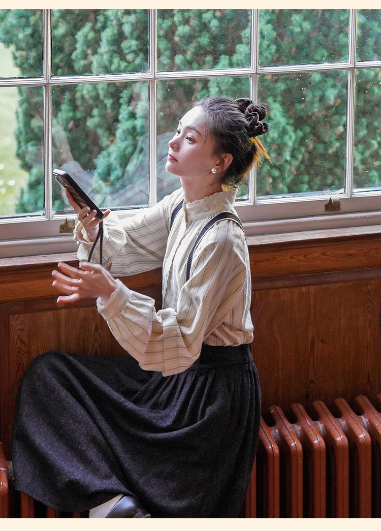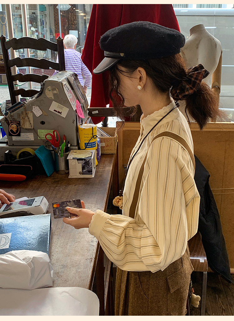浮生八记/24C122/英伦立领花边全棉灯芯绒条纹插肩灯笼袖衬衫