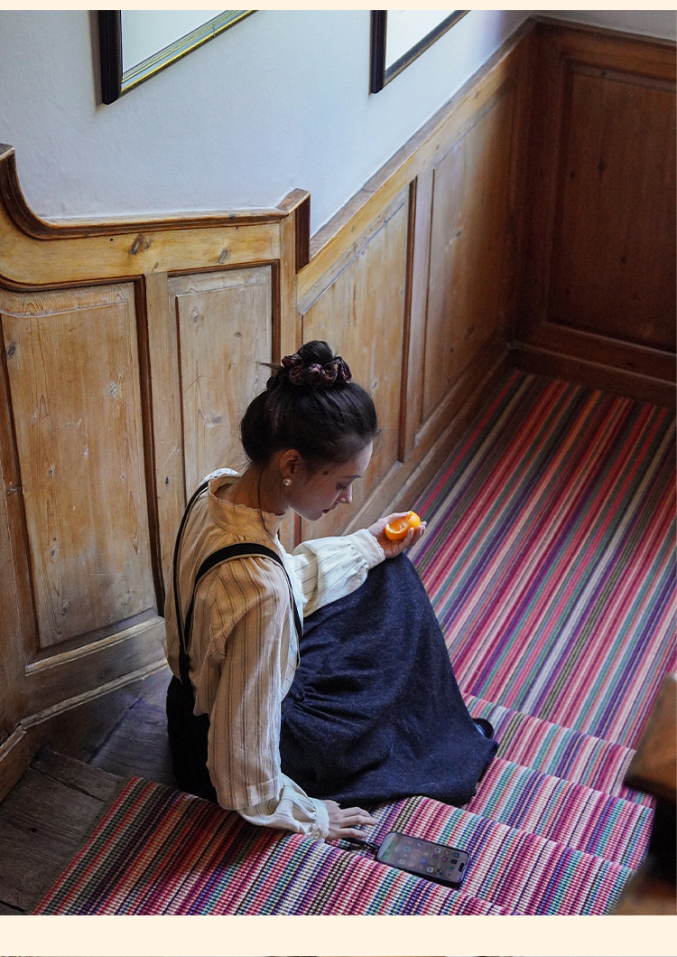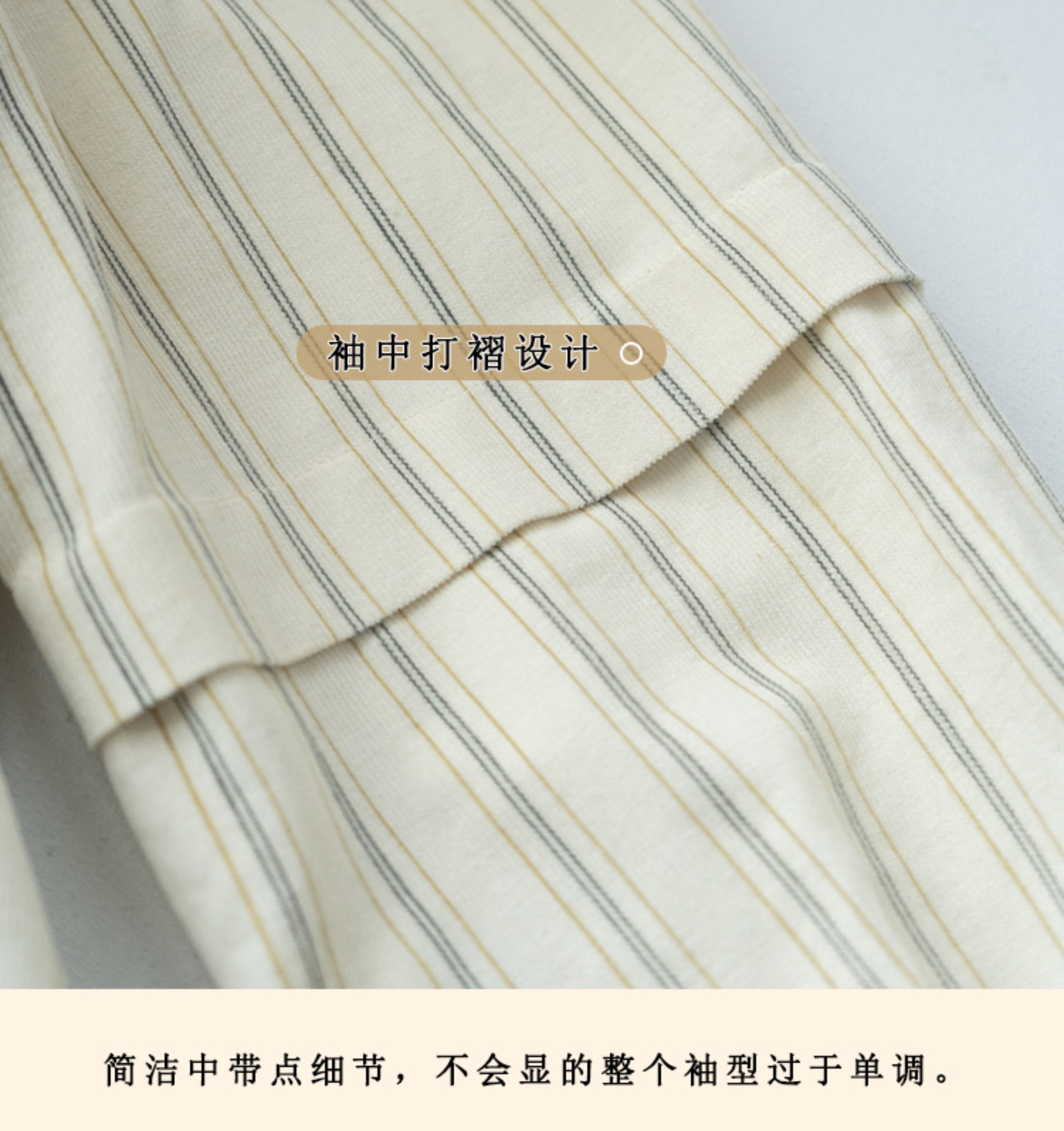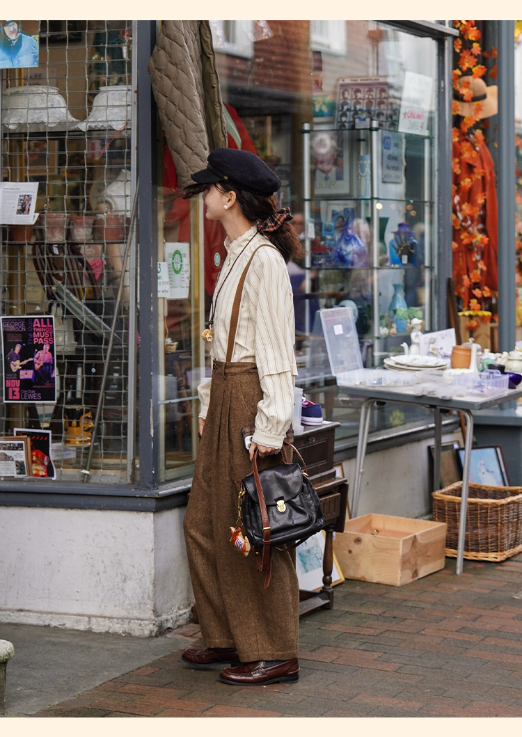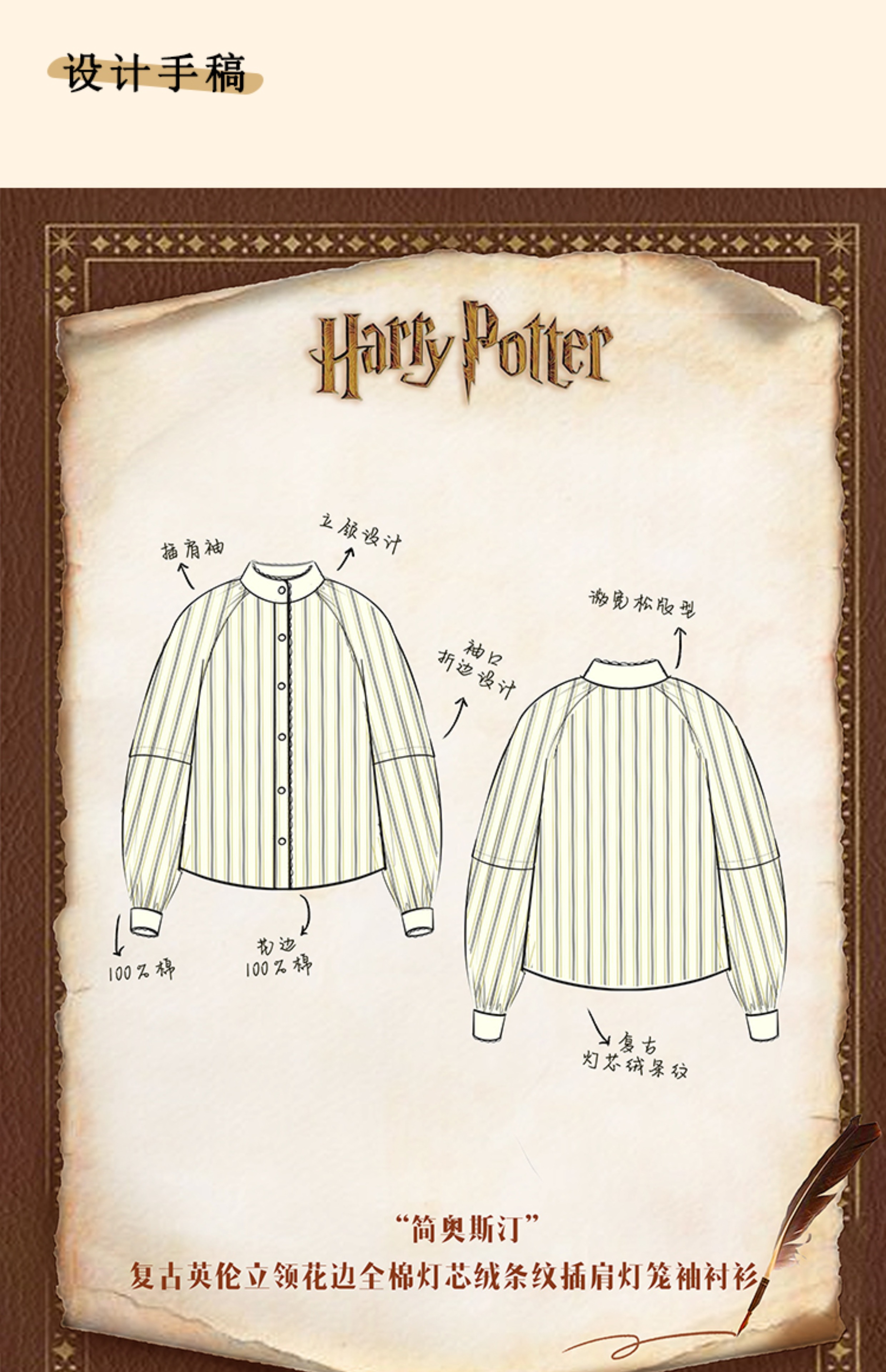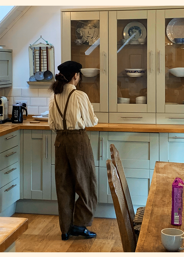 浮生八记/24C122/英伦立领花边全棉灯芯绒条纹插肩灯笼袖衬衫