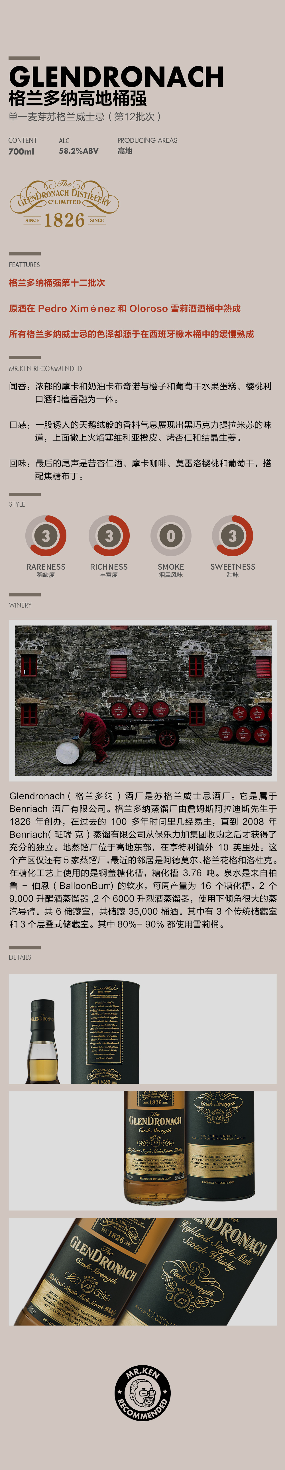 格兰多纳(Glendronach)高格兰多纳(Glendronach)高地桶强单一麦芽苏格兰威士忌(第12批次)地桶强单一麦芽苏格兰威士忌(第12批次)