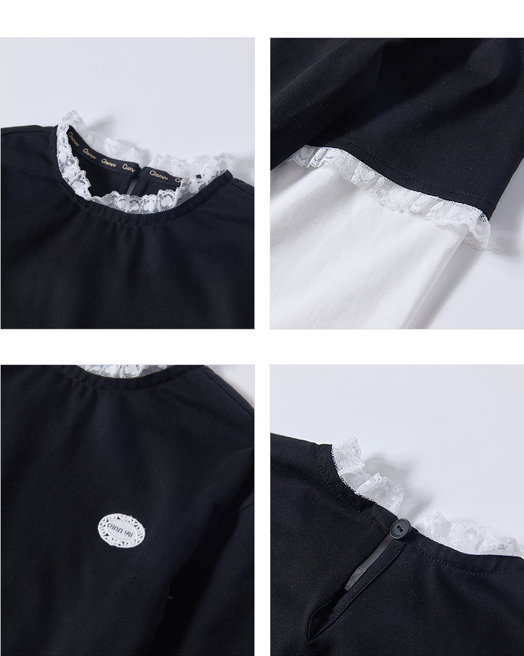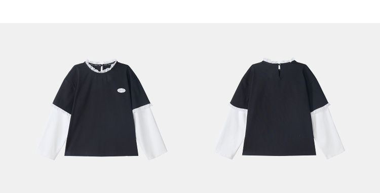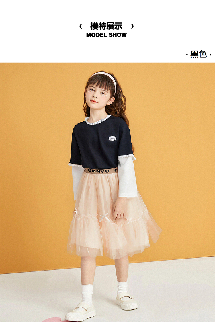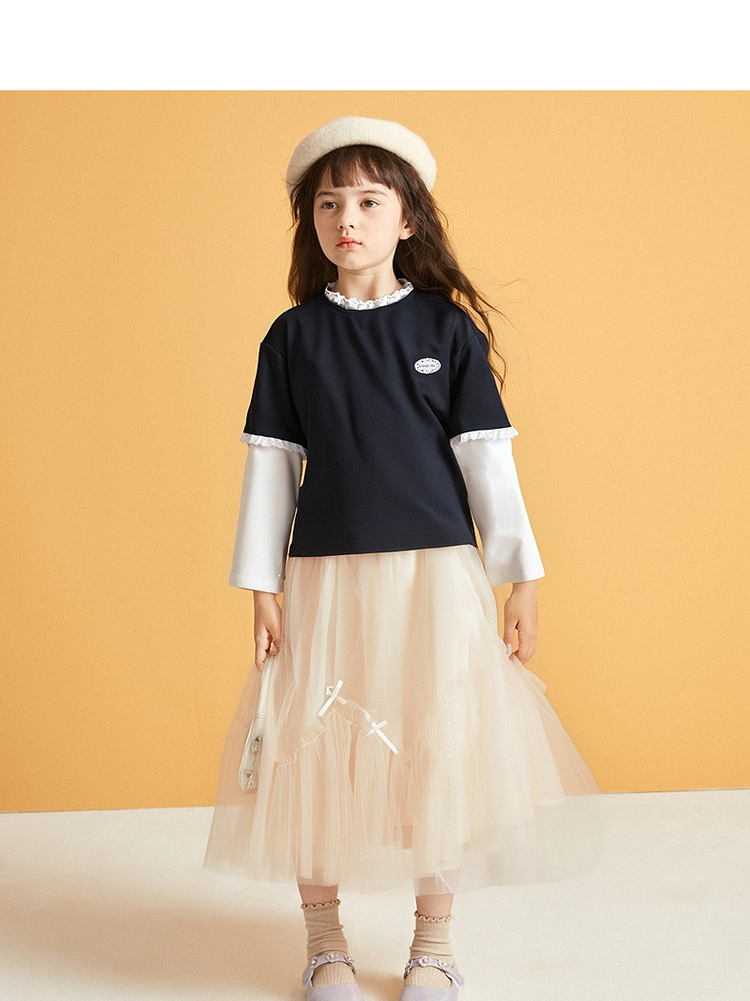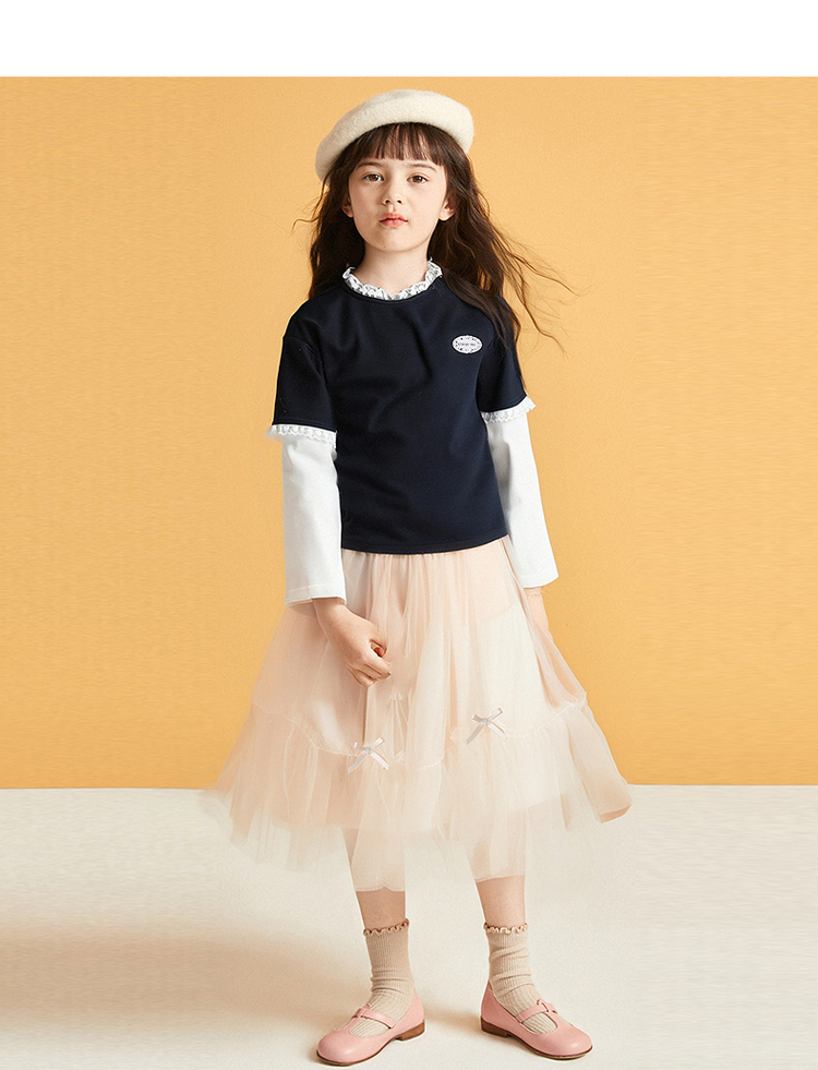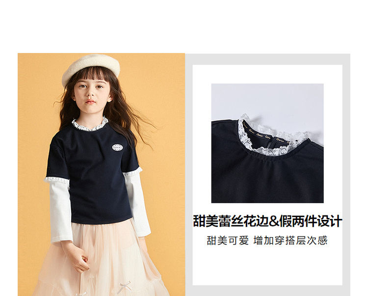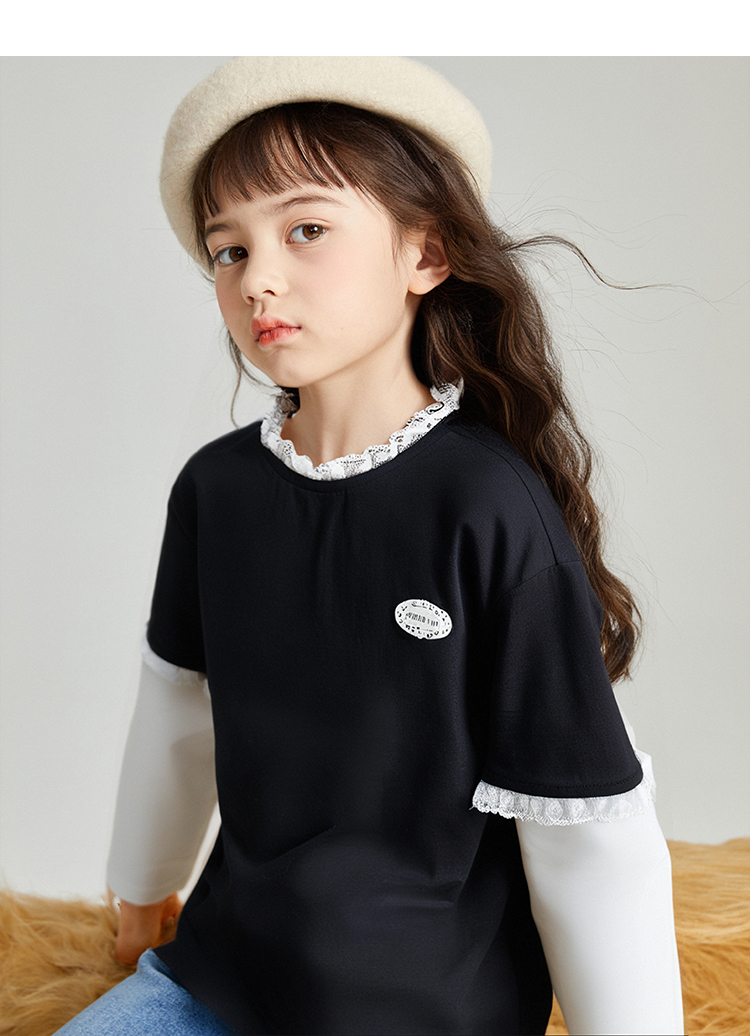 笛莎千与2025秋季新款女童蕾丝花边假两件拼接长袖T恤