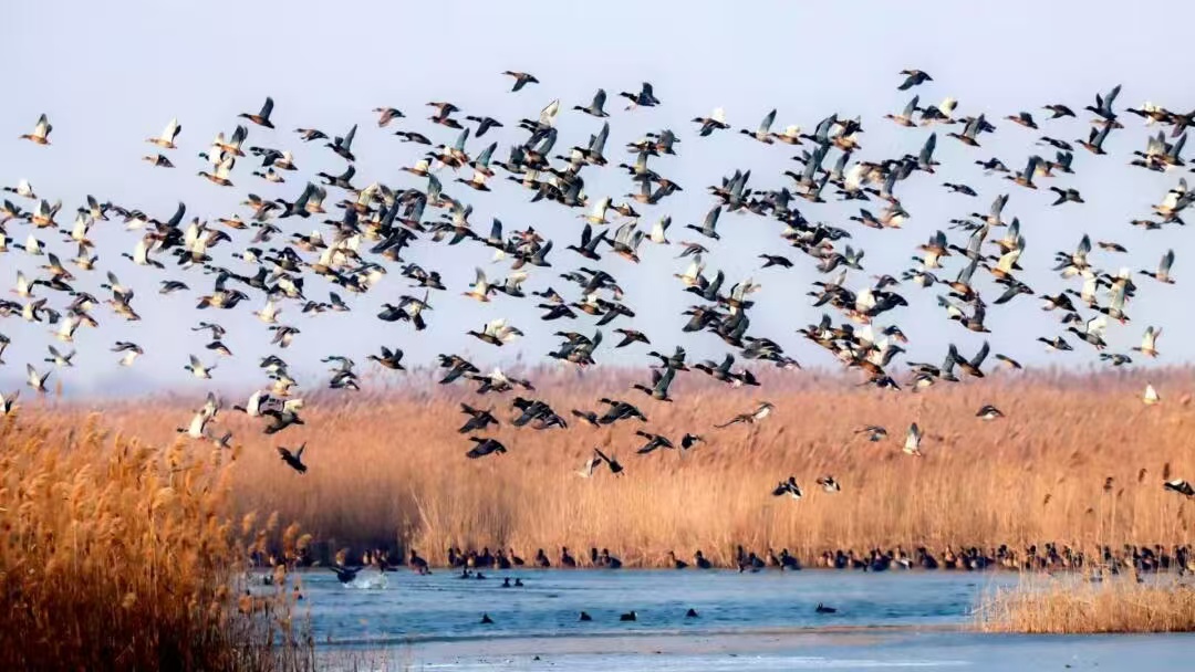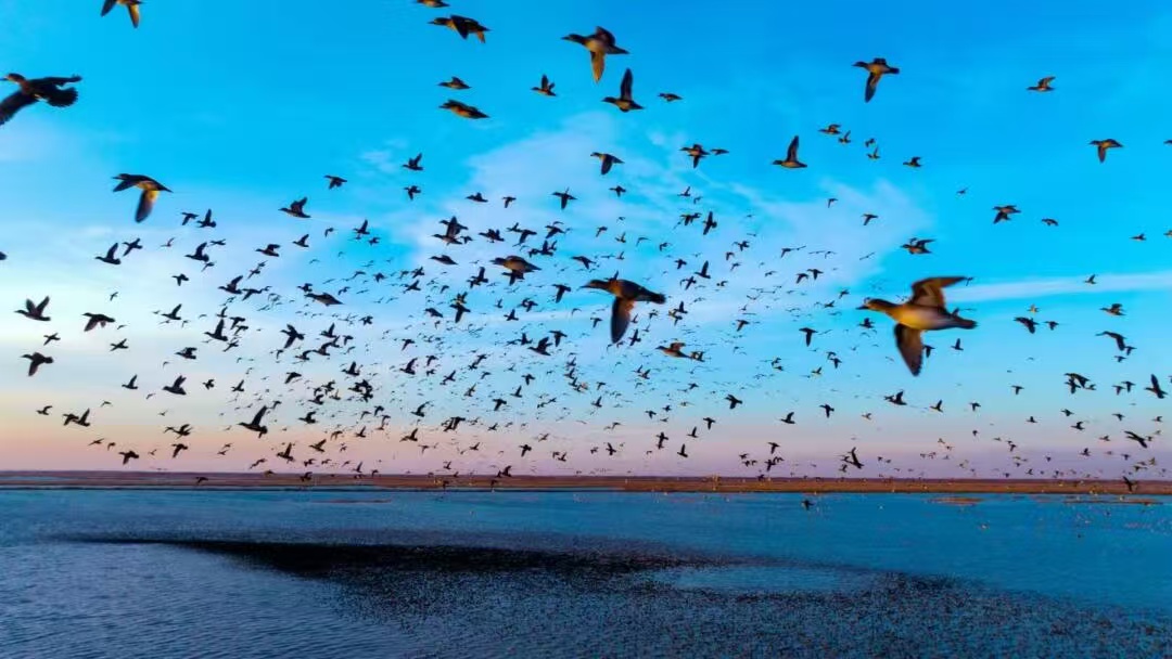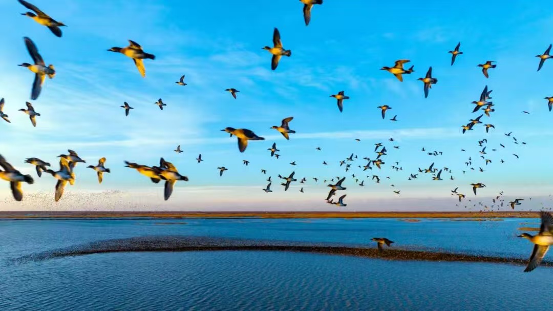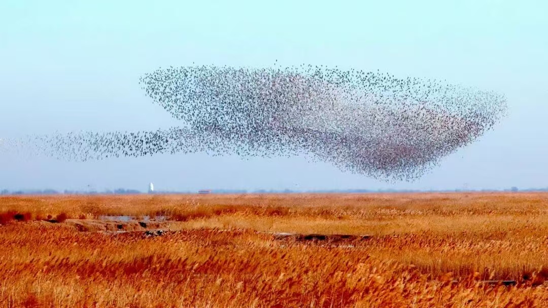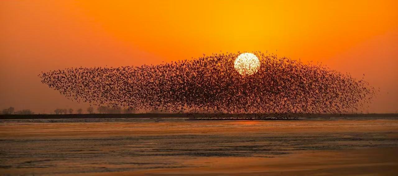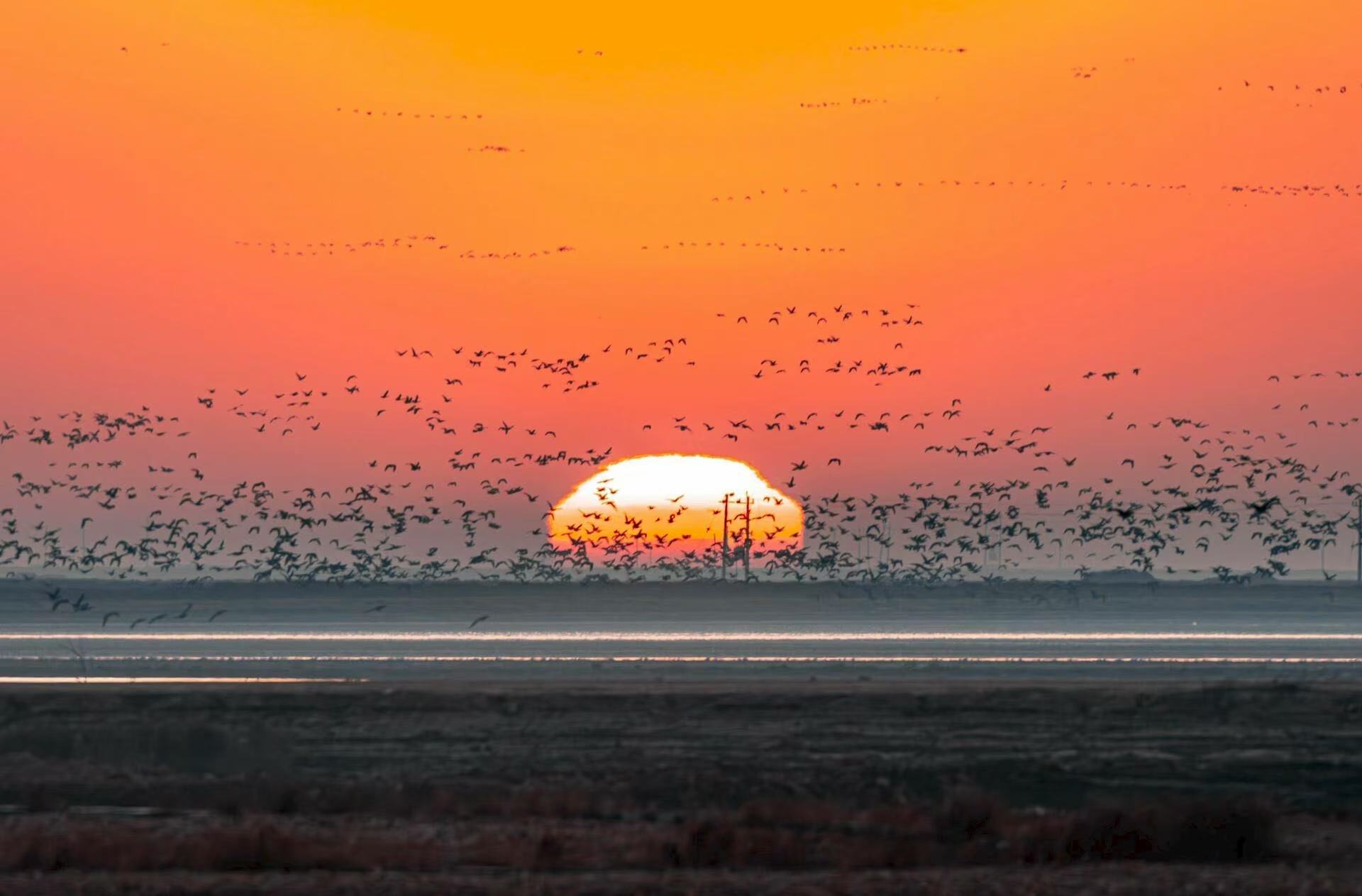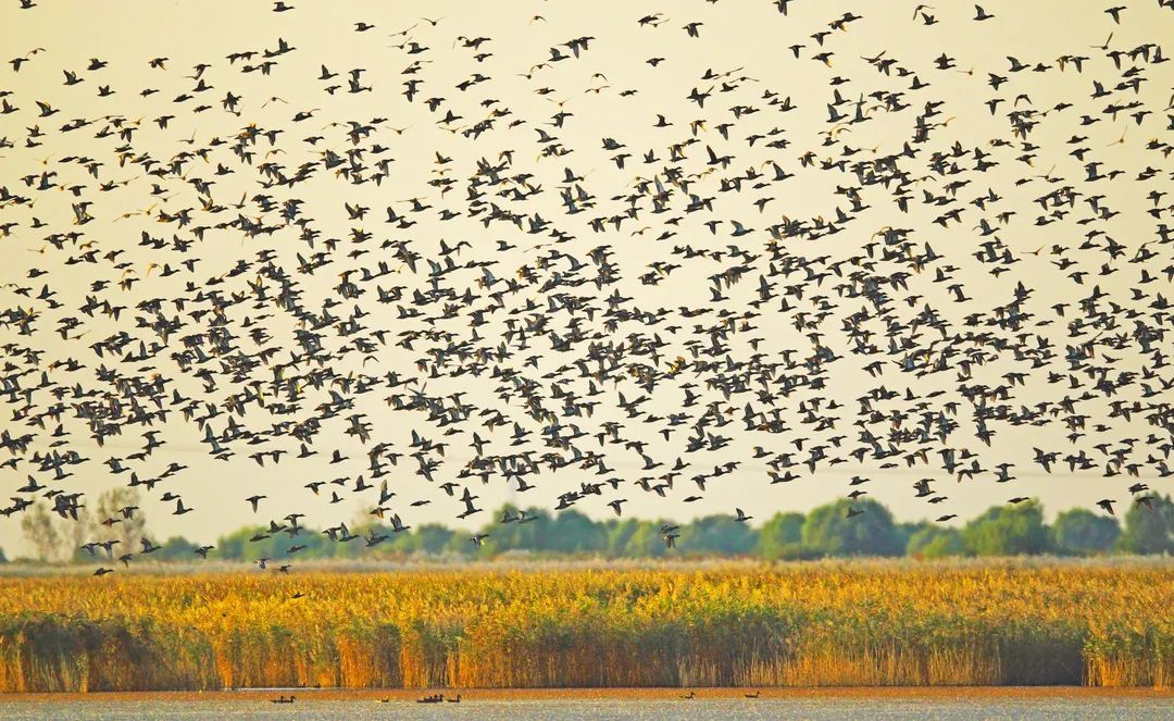 山东东营,黄河入海口,海岸线旁边有美丽的滩涂,神奇的潮汐树,情景交融的稻田画,于是,这片土地就成了鸟儿们越冬的天堂。古往今来,候鸟们延续迁徙的习性,谱写着飞行的传奇,在途径黄河三角洲时,给这一片天地奏出活力跃动的生命音符——“鸟浪”。