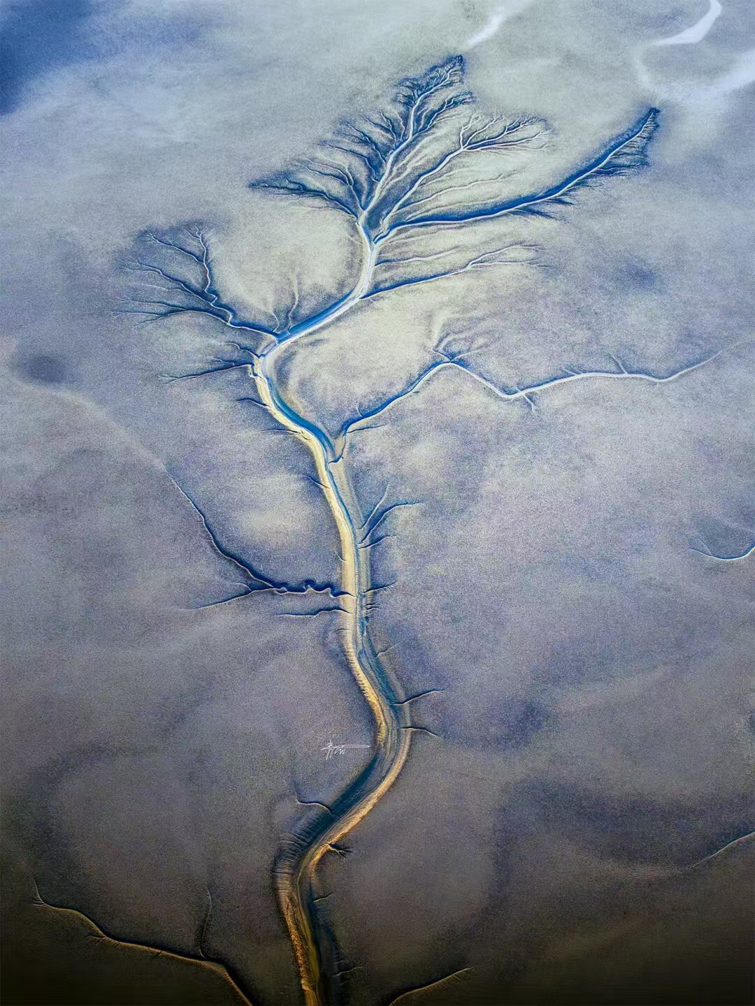 在这里,海潮滩上自然形成的一道道潮沟,形状各异,栩栩如生,构成了一幅幅写意的“生态画卷”,宛如大地生命之树——“潮汐树”