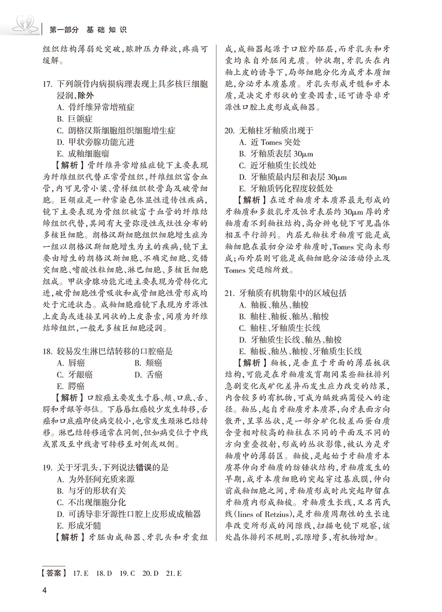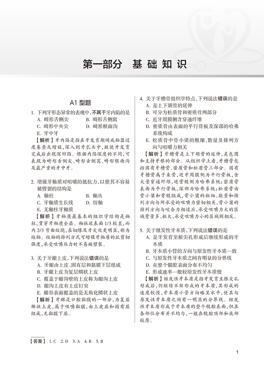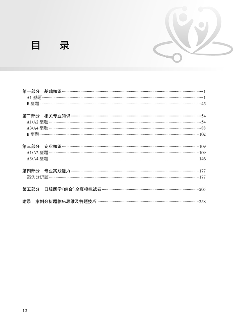 第一部分 基础知识 / 1 A1 型题 / 1 B 型题 / 45 第二部分 相关专业知识 / 54 A1 / A2 型题 / 54 A3 / A4 型题 / 88 B 型题 / 102 第三部分 专业知识 / 109 A1 / A2 型题 / 109 A3 / A4 型题 / 146 第四部分 专业实践能力 / 177 案例分析题 / 177 第五部分 口腔医学(综合)全真模拟试卷 / 205 附录 案例分析题临床思维及答题技巧 / 258