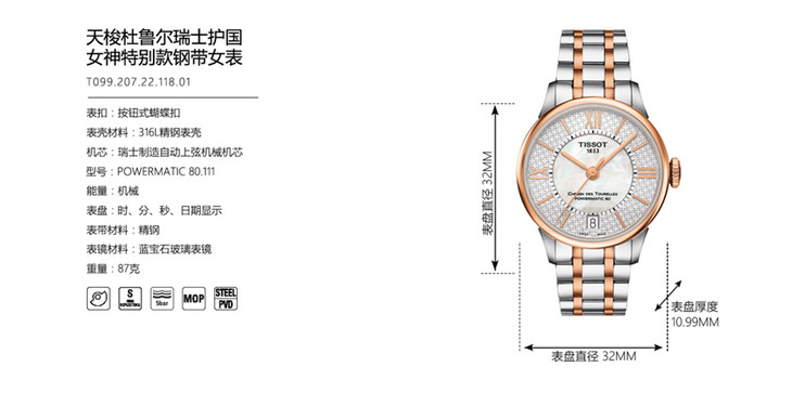 表壳 厚度 | 10.99 mm | 材质 | 316L精钢PVD镀玫瑰金 |