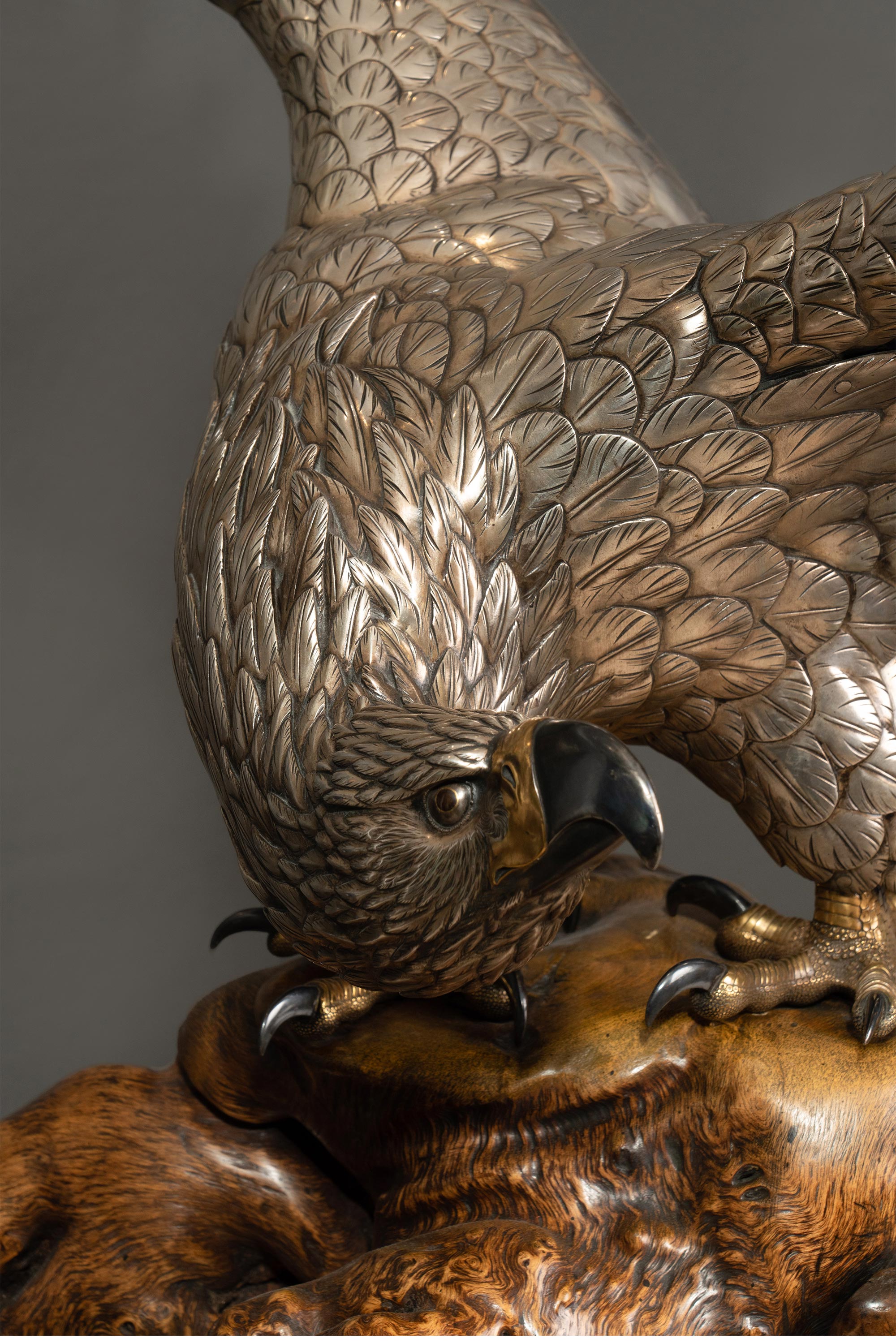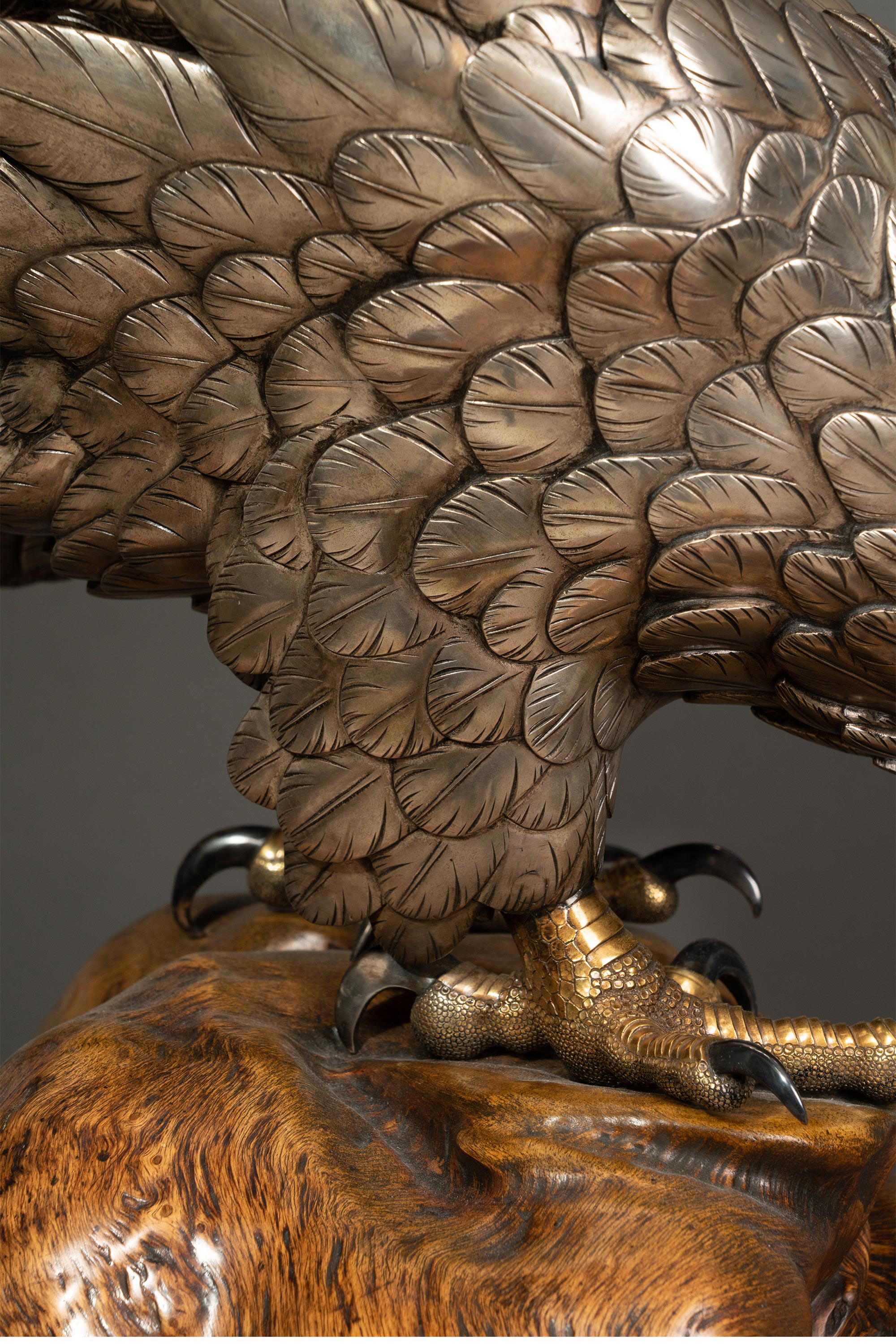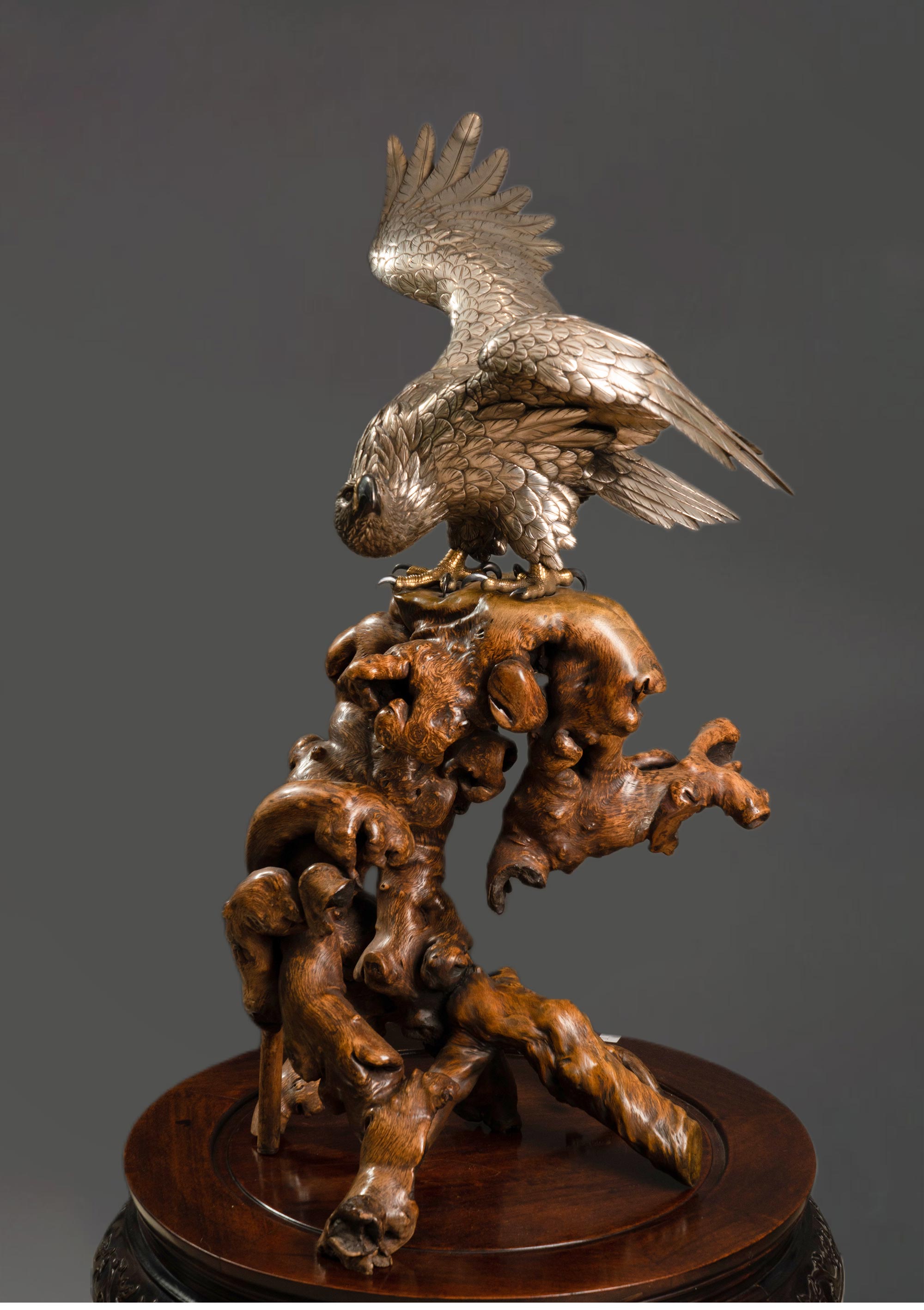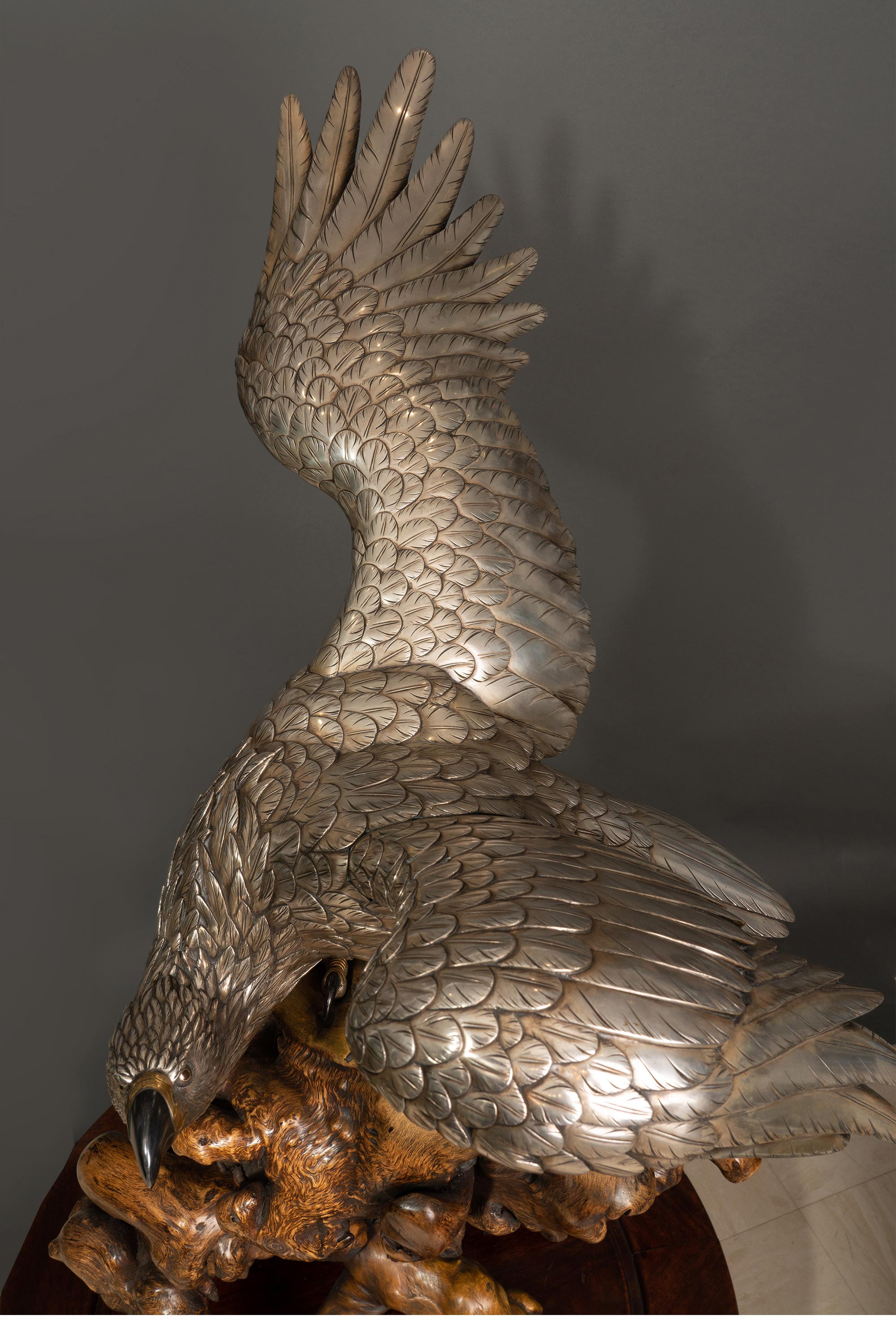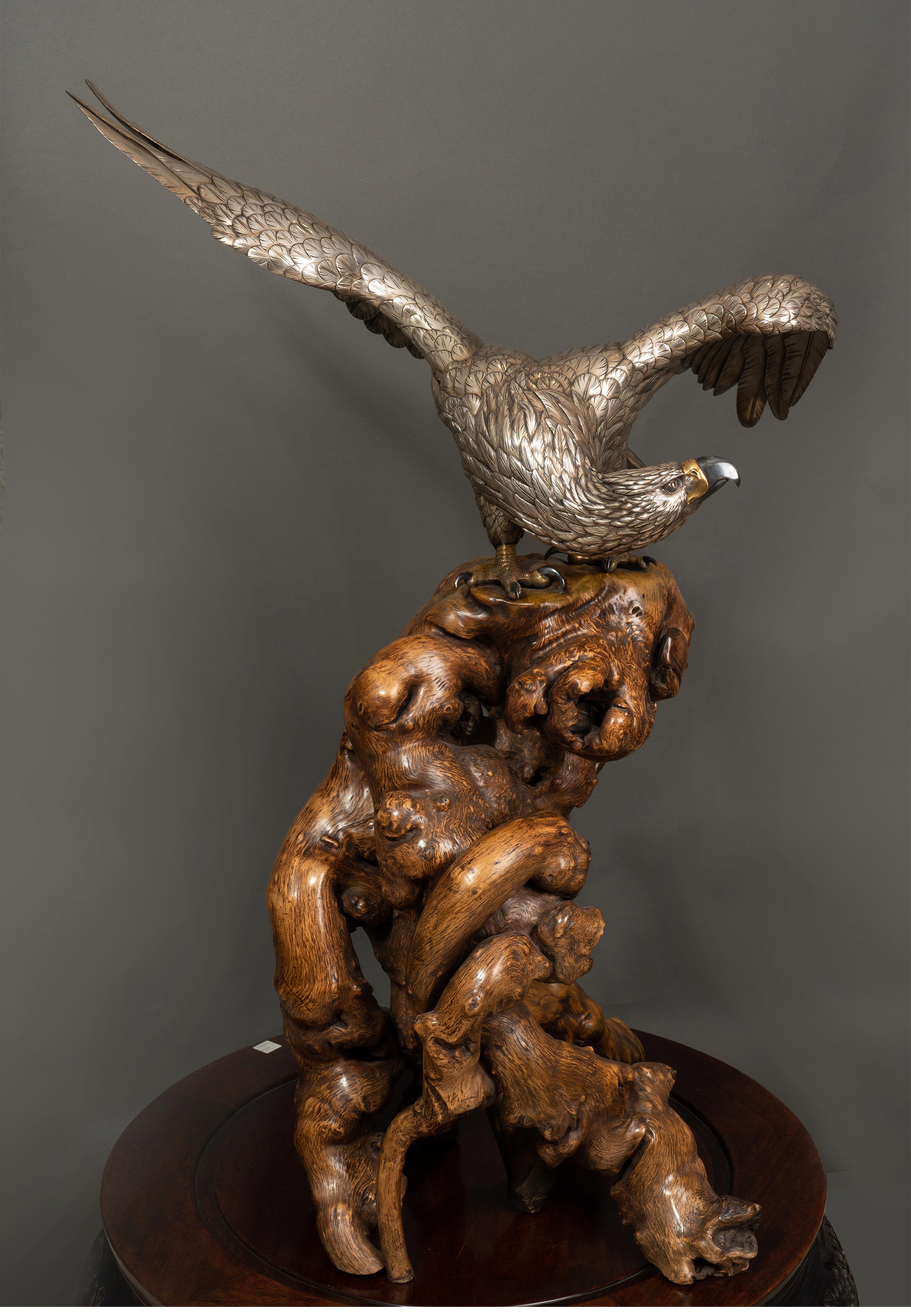 1880年代日本明治时期出品野尻秀親款雄鹰造型镀银铜雕摆件 带木质底座