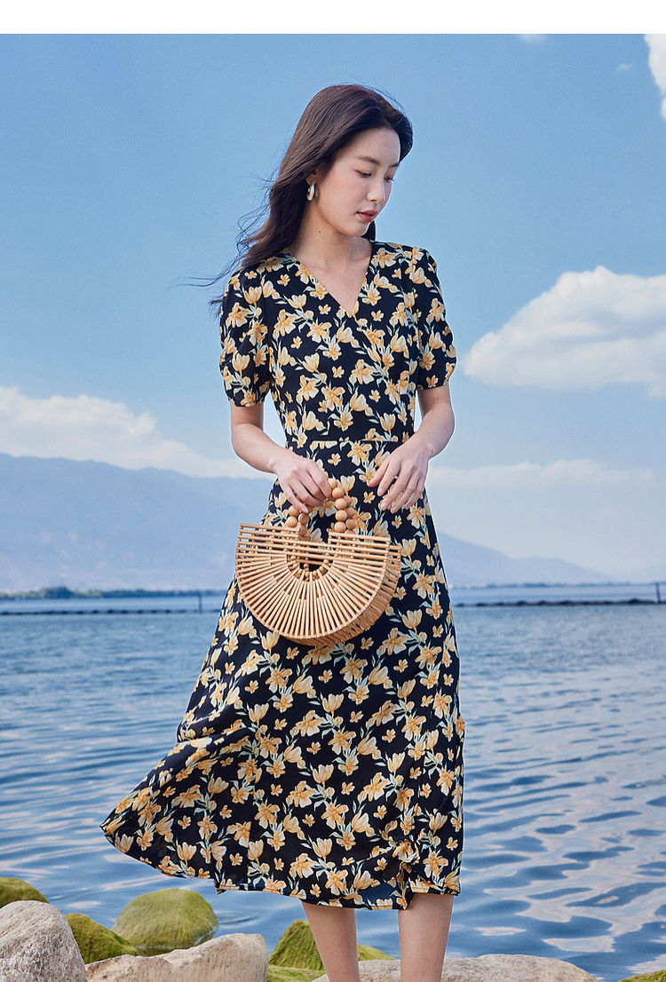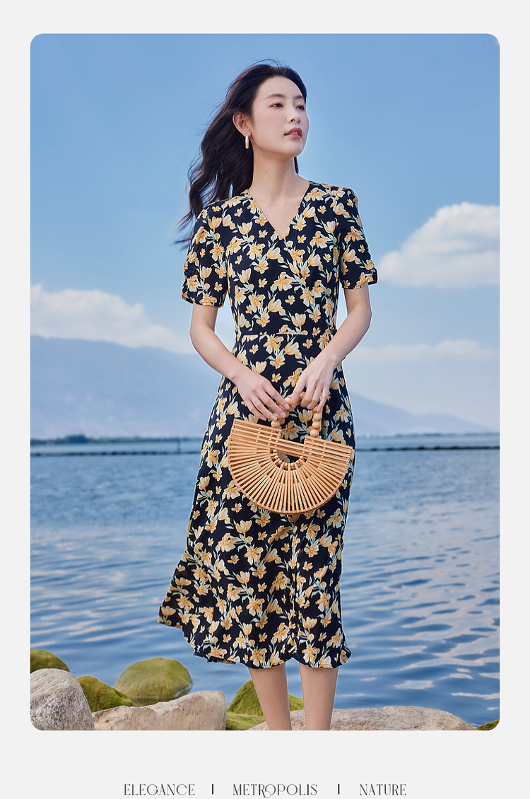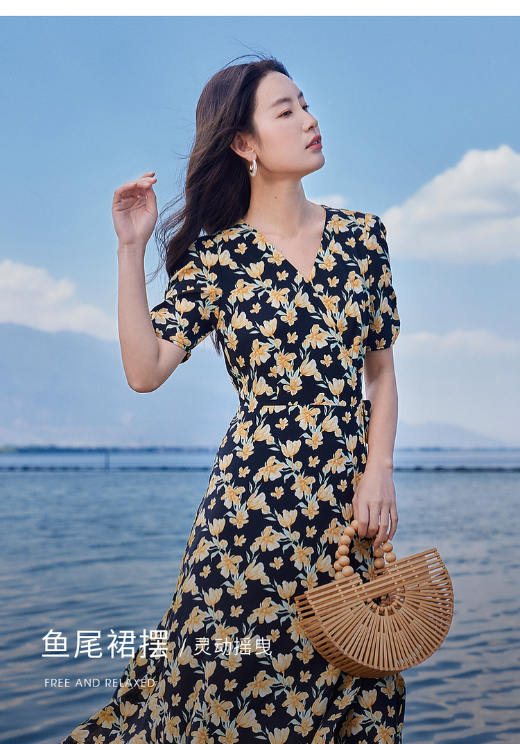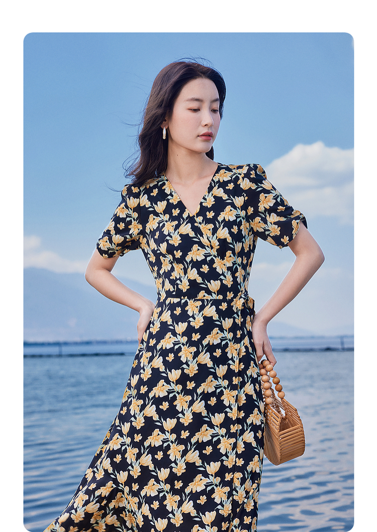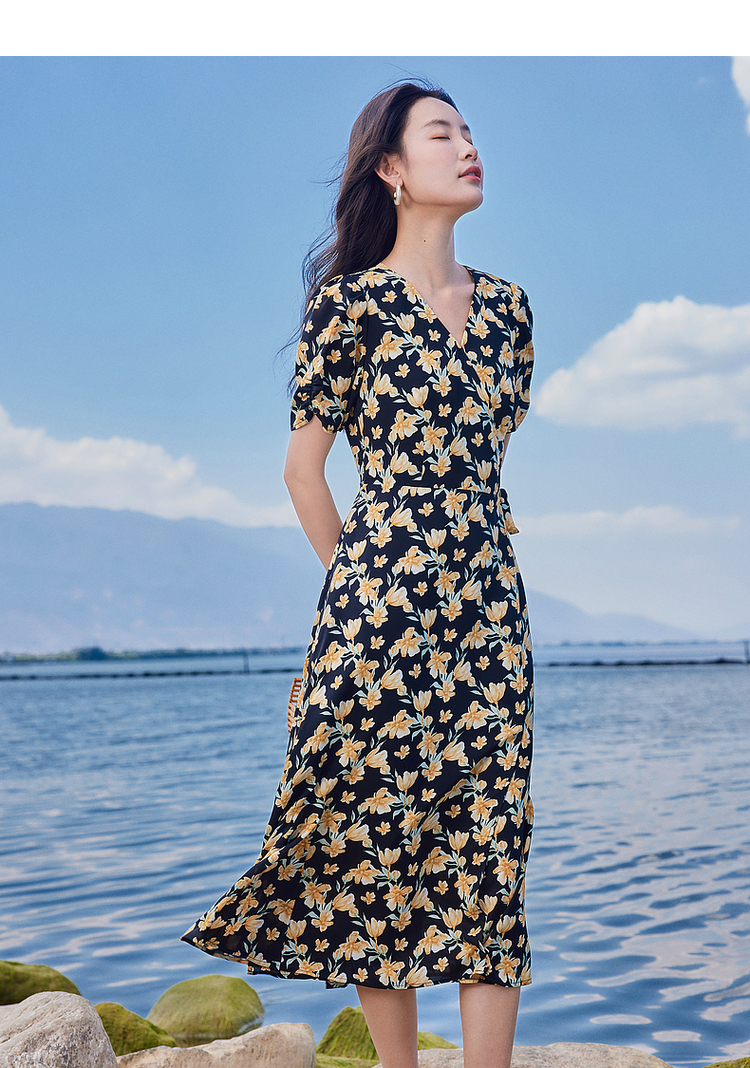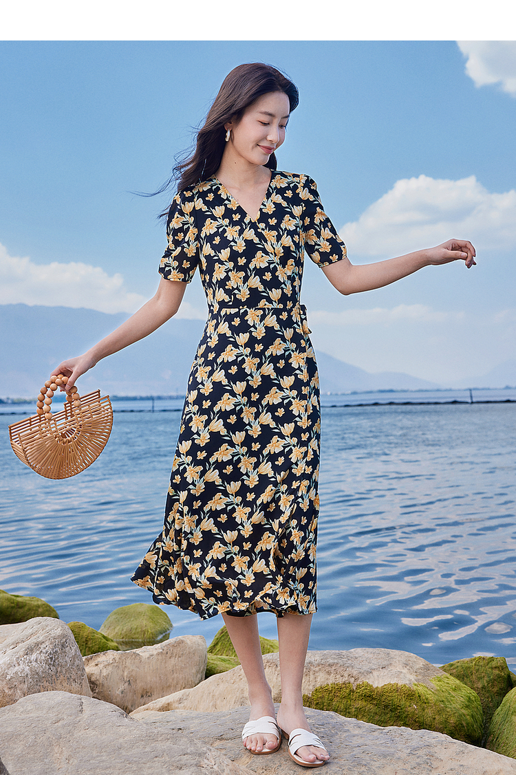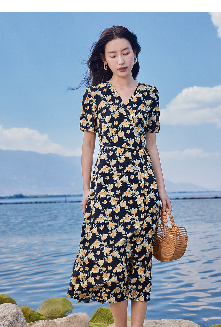 【五折购】熙世界浪漫复古围裹式V领碎花连衣裙2025夏季新款气质茶歇裙子