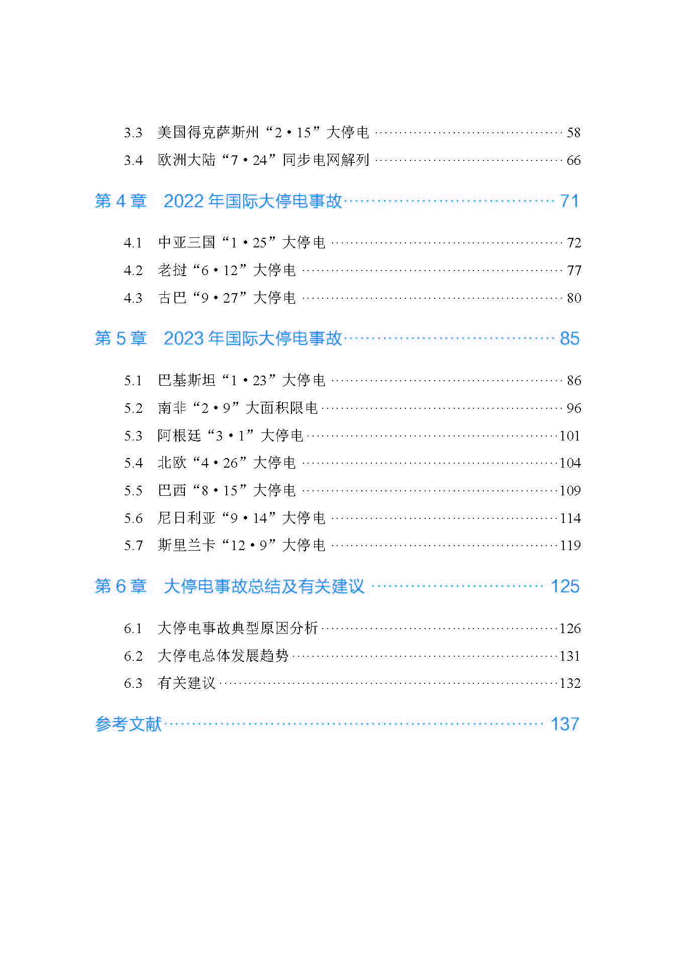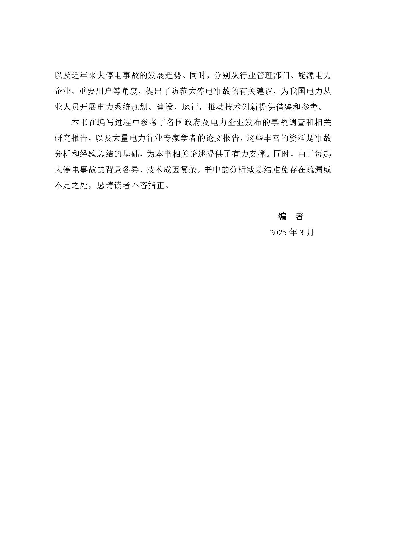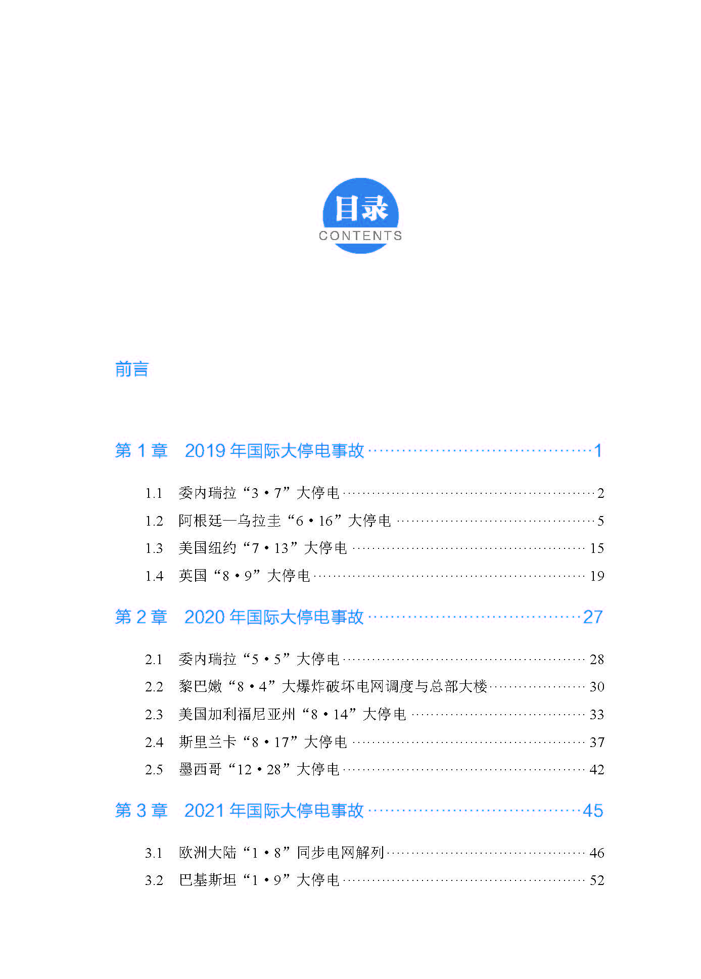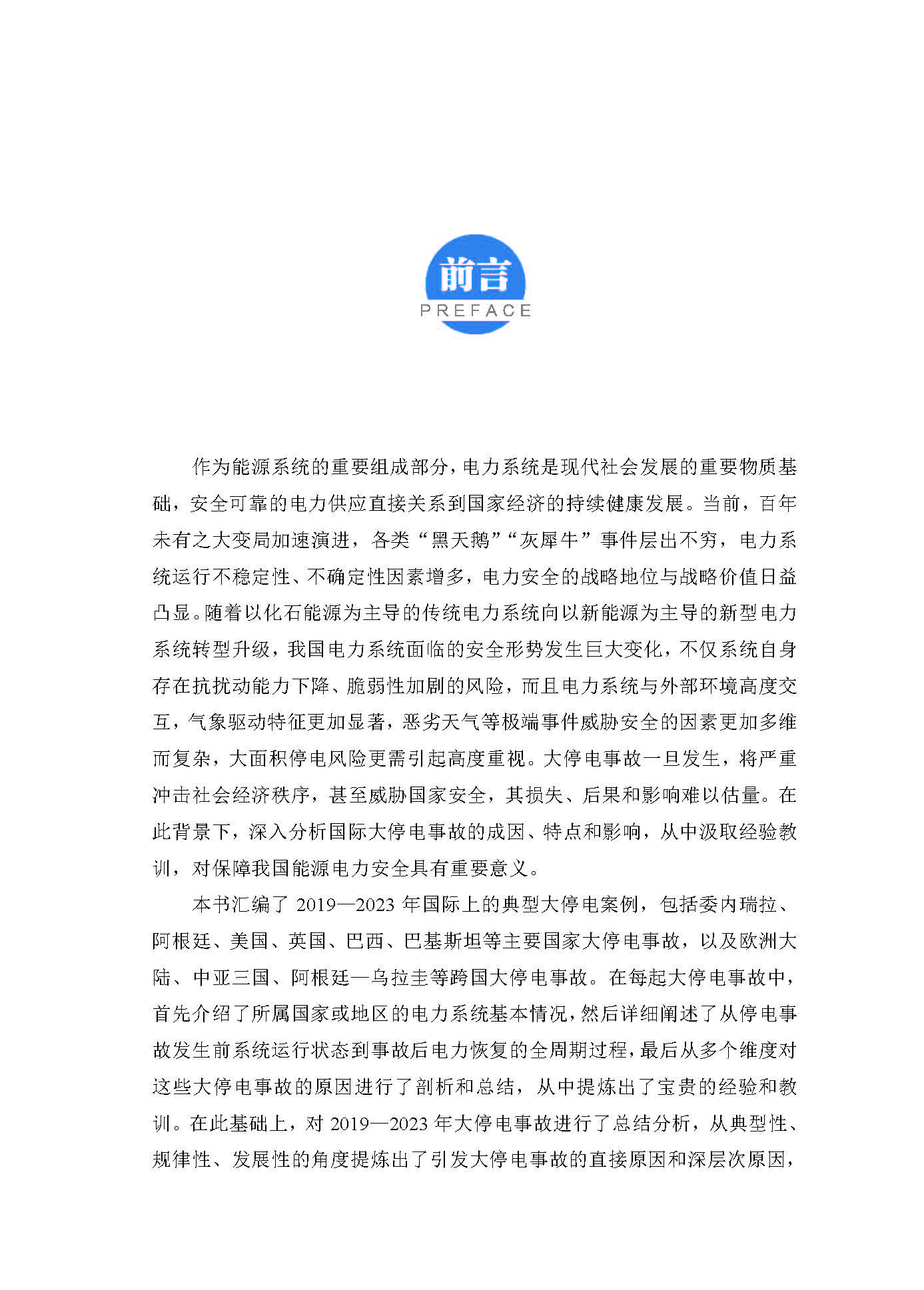 本书汇编分析了2019-2023年国际上主要的大停电事故,详细介绍了这些大停电事故的发展经过,从多个维度对这些大停电事故的原因进行了剖析,从中归纳出宝贵经验和教训,并提出防范大停电事故的有关建议。全书共分6章,第1章至第5章分别介绍了2019-2023年的国际大停电事故,包括2019年阿根廷一乌拉圭“6·16”大停电、英国“8·9”大停电,2020年美国加利福尼亚州“8·14”大停电、斯里兰卡“8·17”大停电,2021年欧洲大陆“1·8”同步电网解列、巴基斯坦“1·9”大停电、美国得克萨斯州“2·15”大停电、欧洲大陆“7·24”同步电网解列,2022年中亚三国“1·25”大停电,2023 年巴基斯坦“1·23”大停电、阿根廷“3·1”大停电、巴西“8·15”大停电、尼日利亚“9·14”大停电等主要的大停电事故。第6章总结了引发大停电事故的直接原因和深层次原因,以及近年来大停电事故的发展趋势,并提出了防范大停电事故的有关建议。