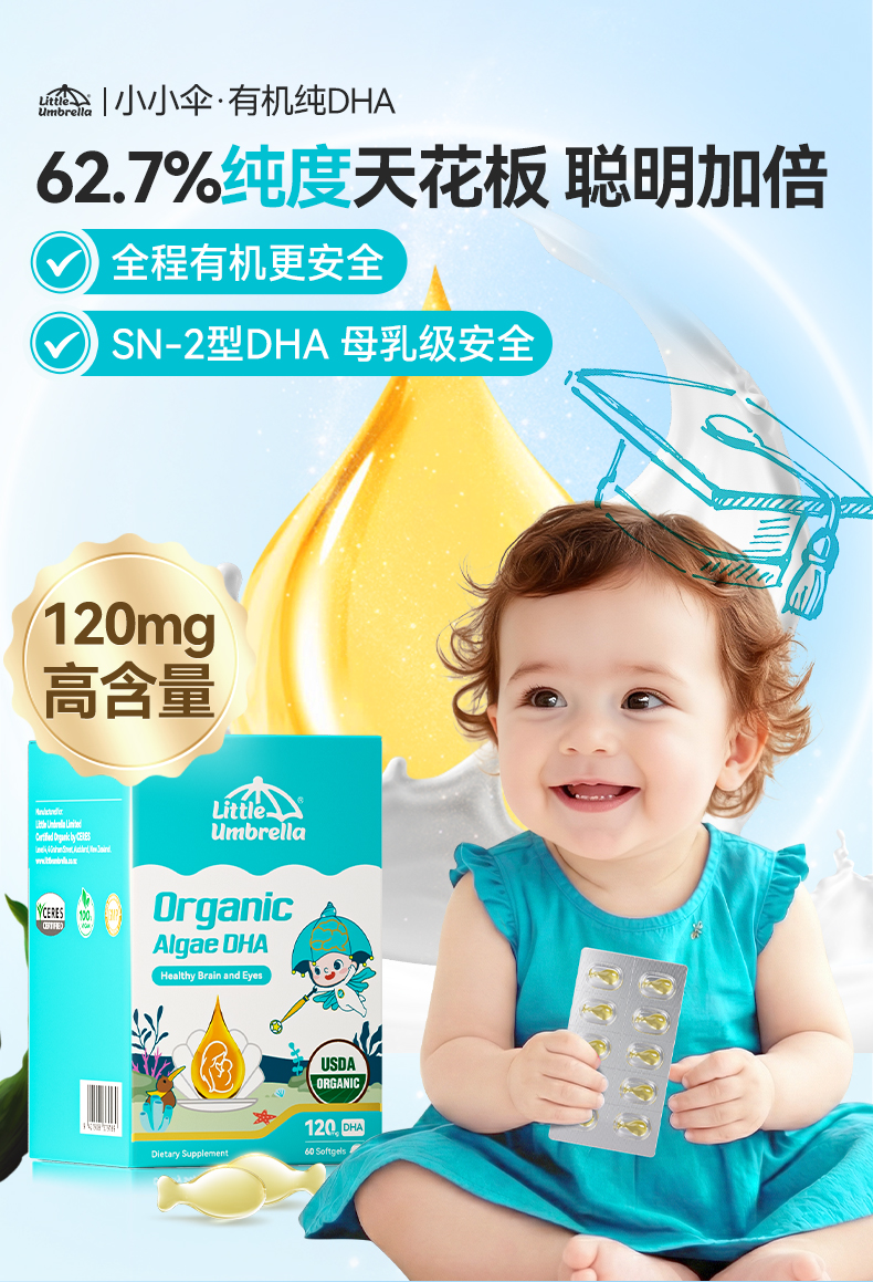 【央视推荐】小小伞有机纯DHA藻油婴幼儿海藻油60粒/盒《赠品链接》★