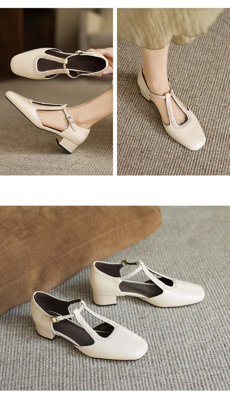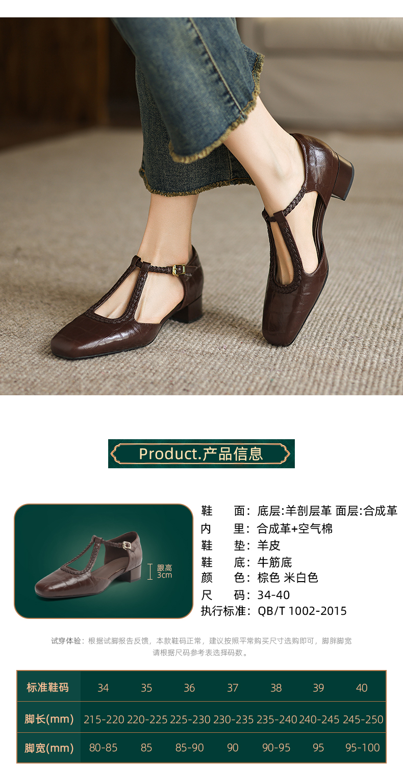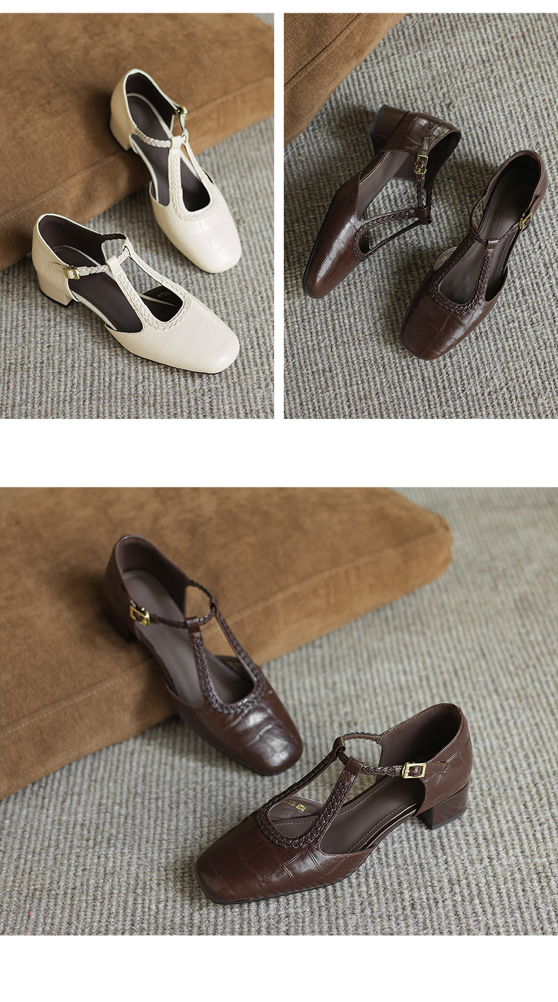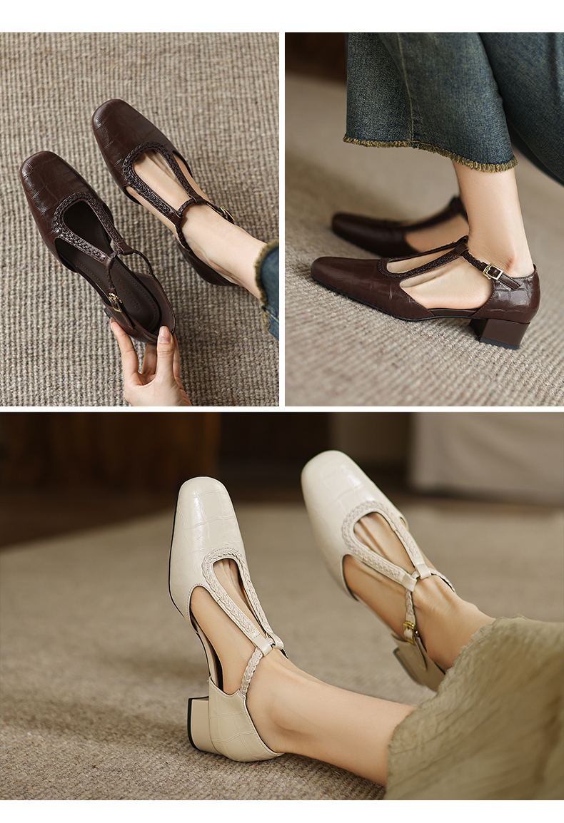 阿么手工女鞋方头编织凉鞋粗跟3CM2025夏季新款浅口复古玛丽珍鞋