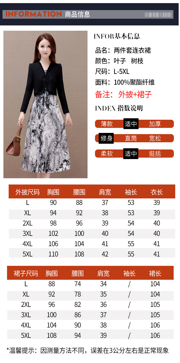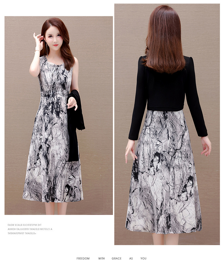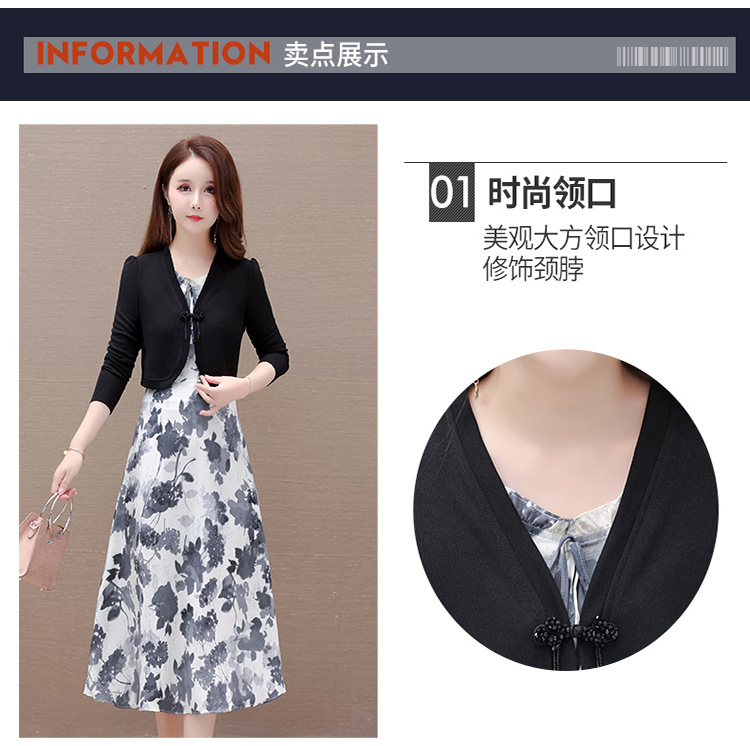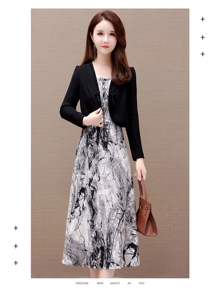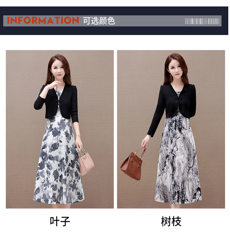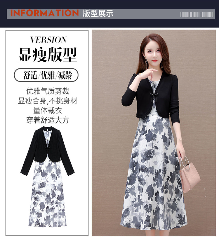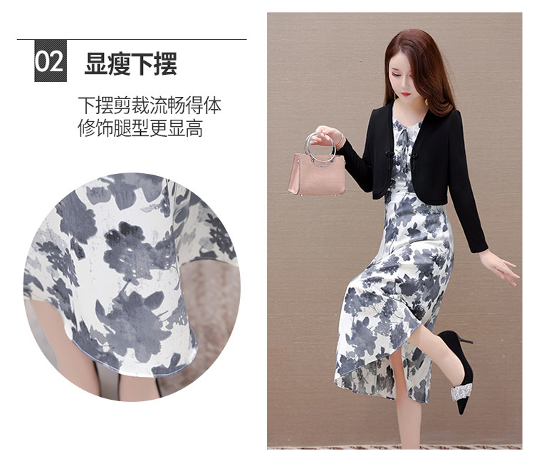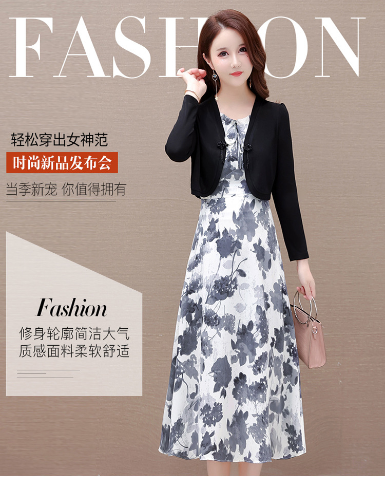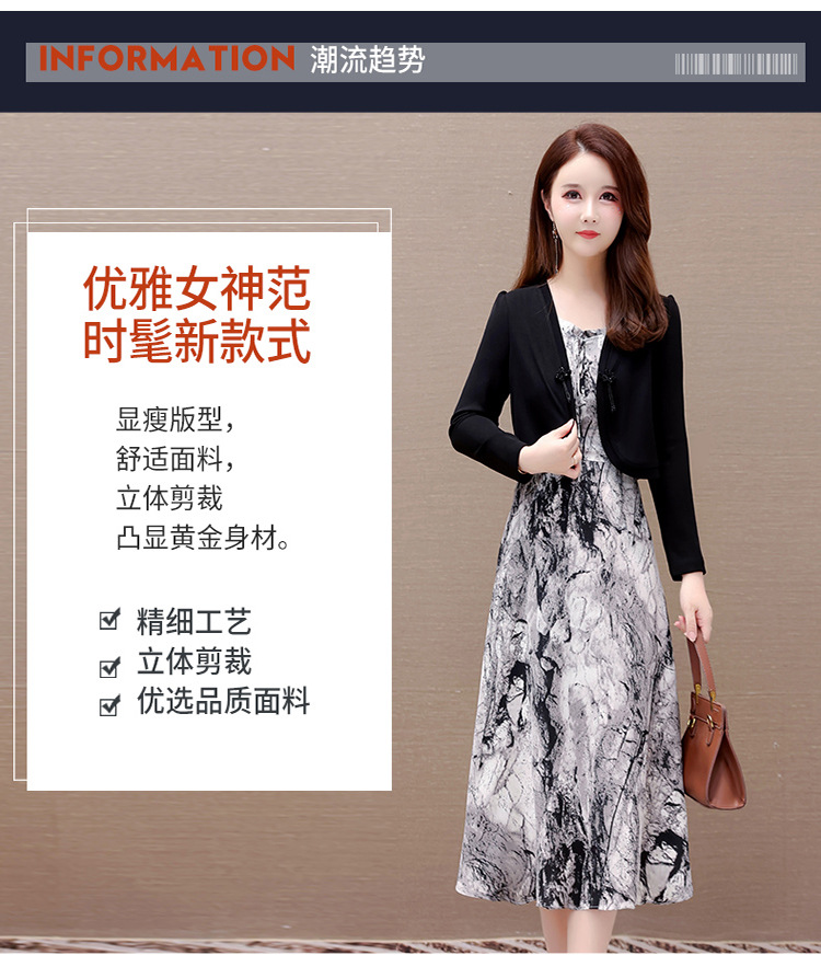 秋季新款,女装印花打底裙中长裙+短款黑色外套两件套连衣裙QYM-JJ-92501-Y