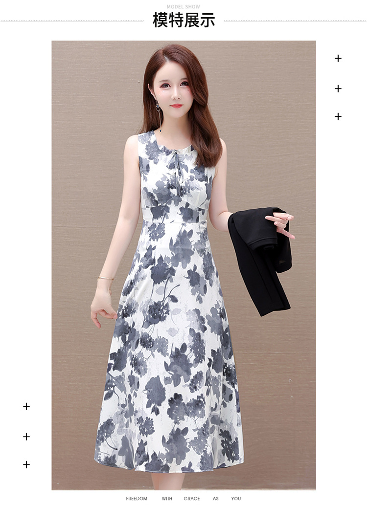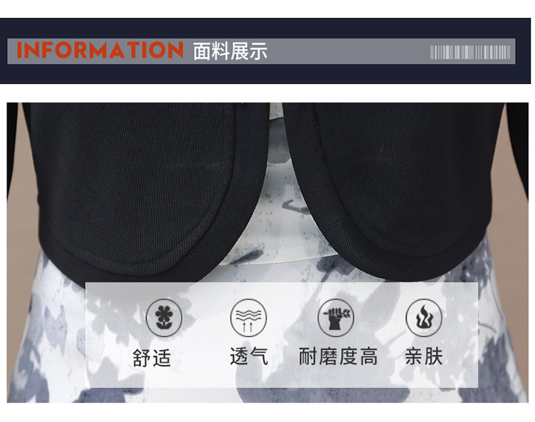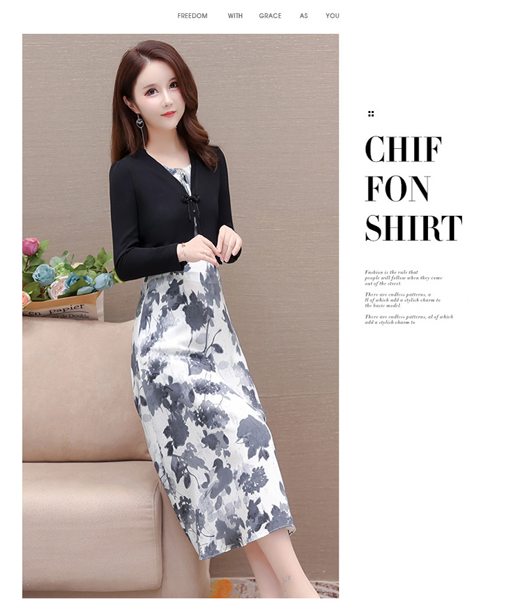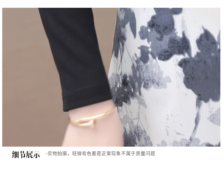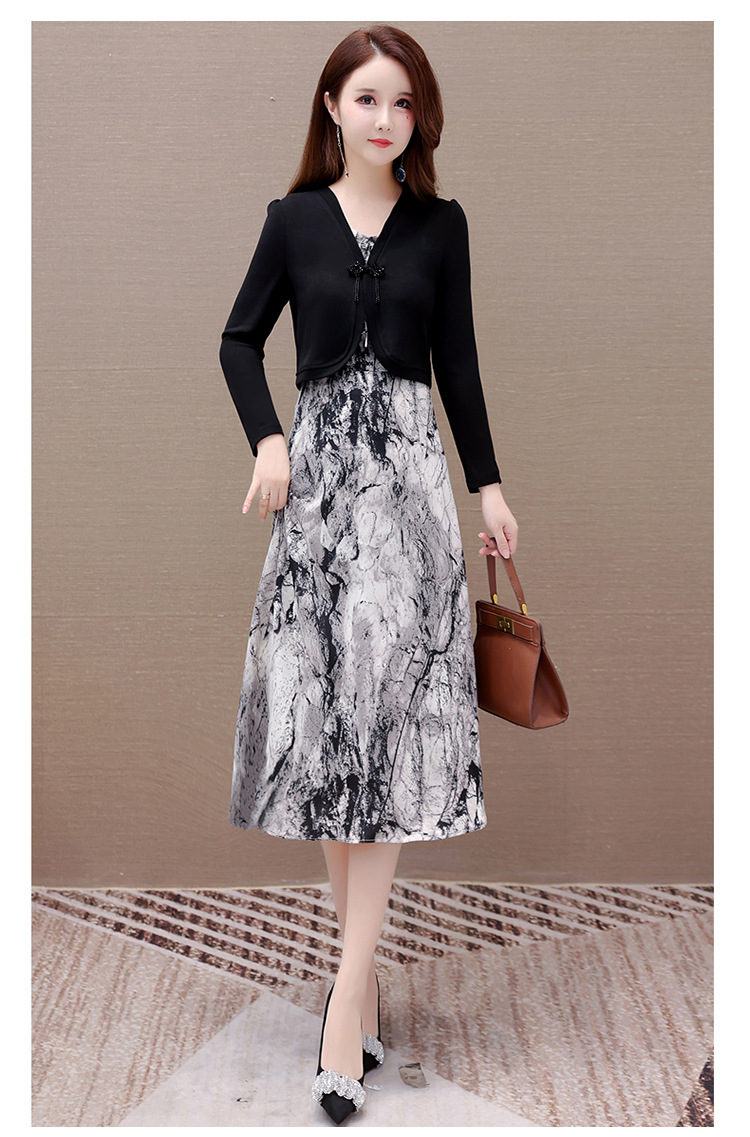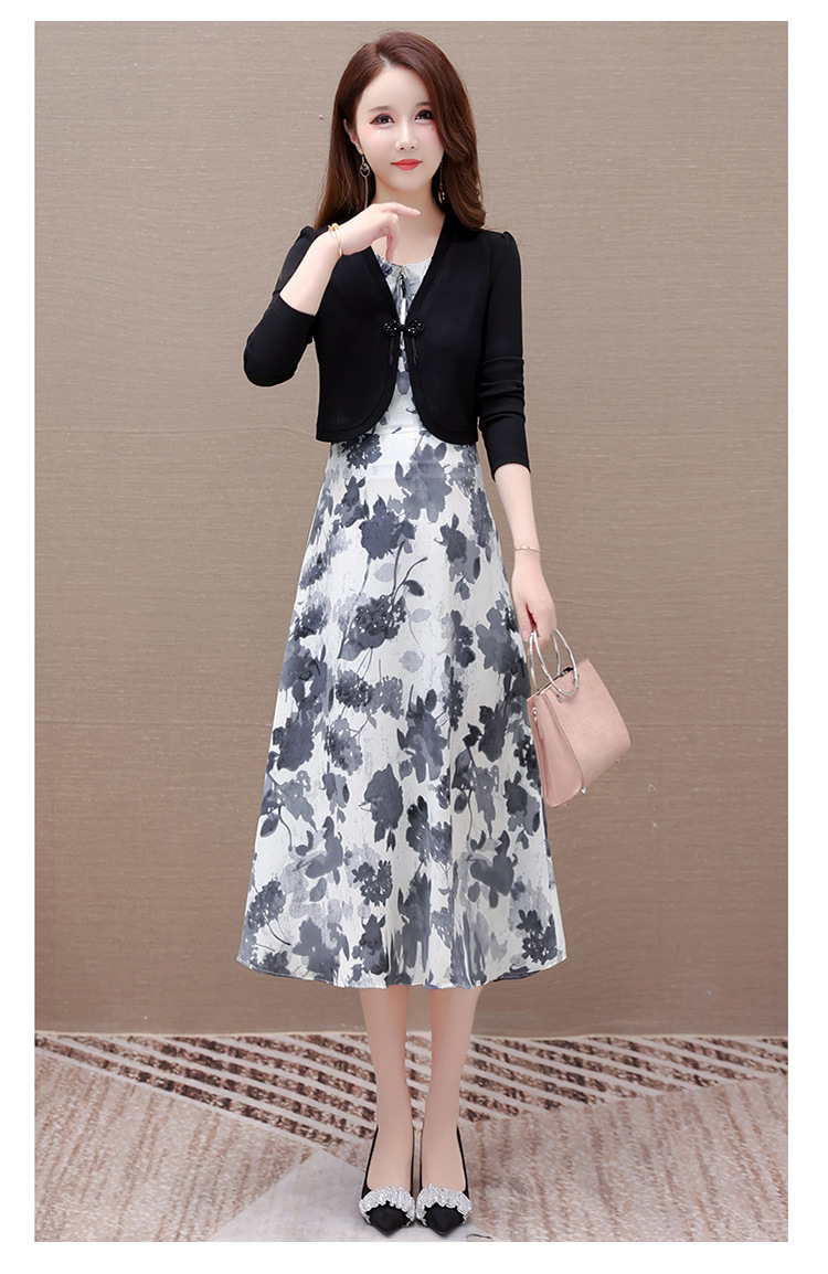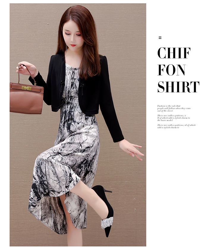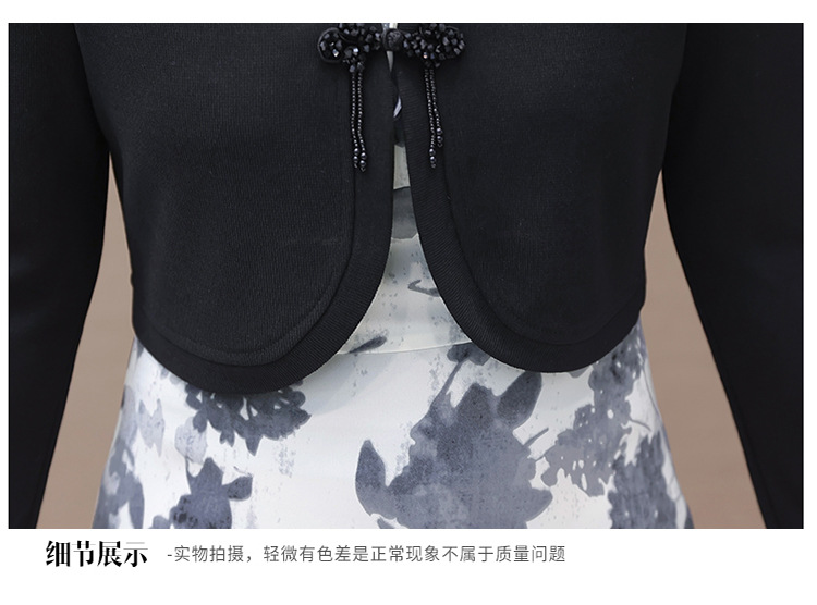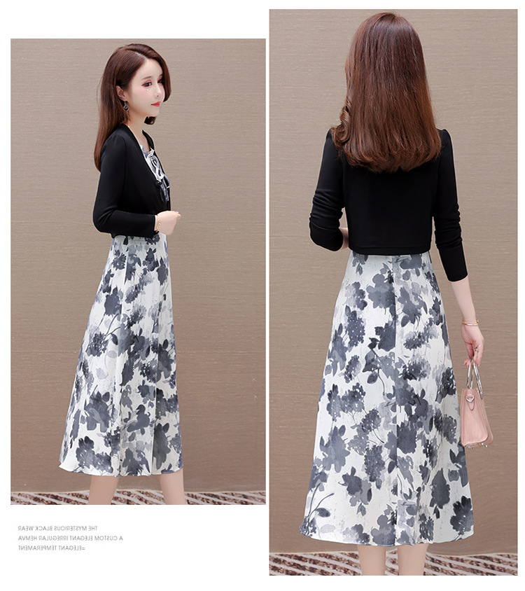 秋季新款,女装印花打底裙中长裙+短款黑色外套两件套连衣裙QYM-JJ-92501-Y