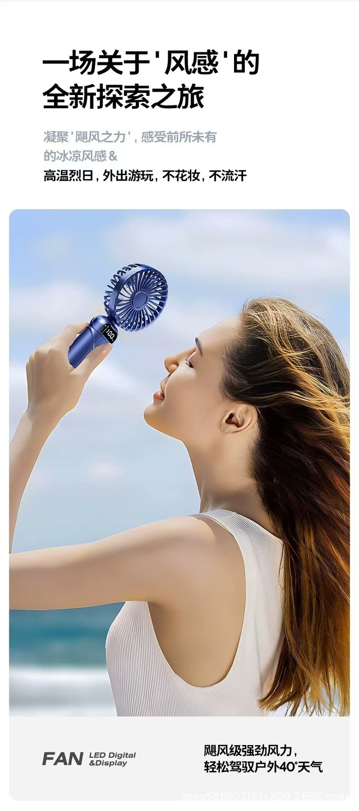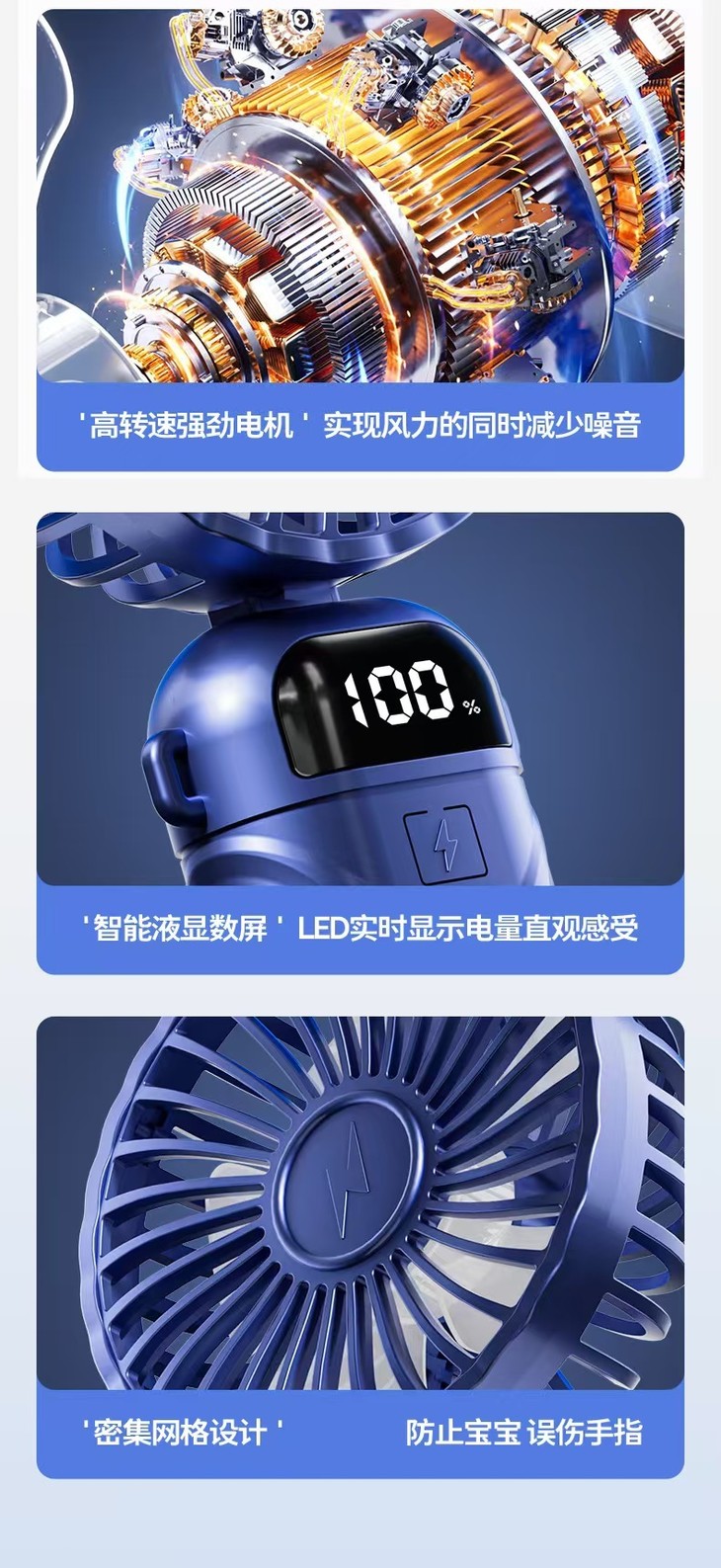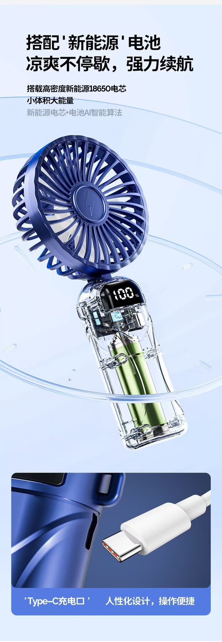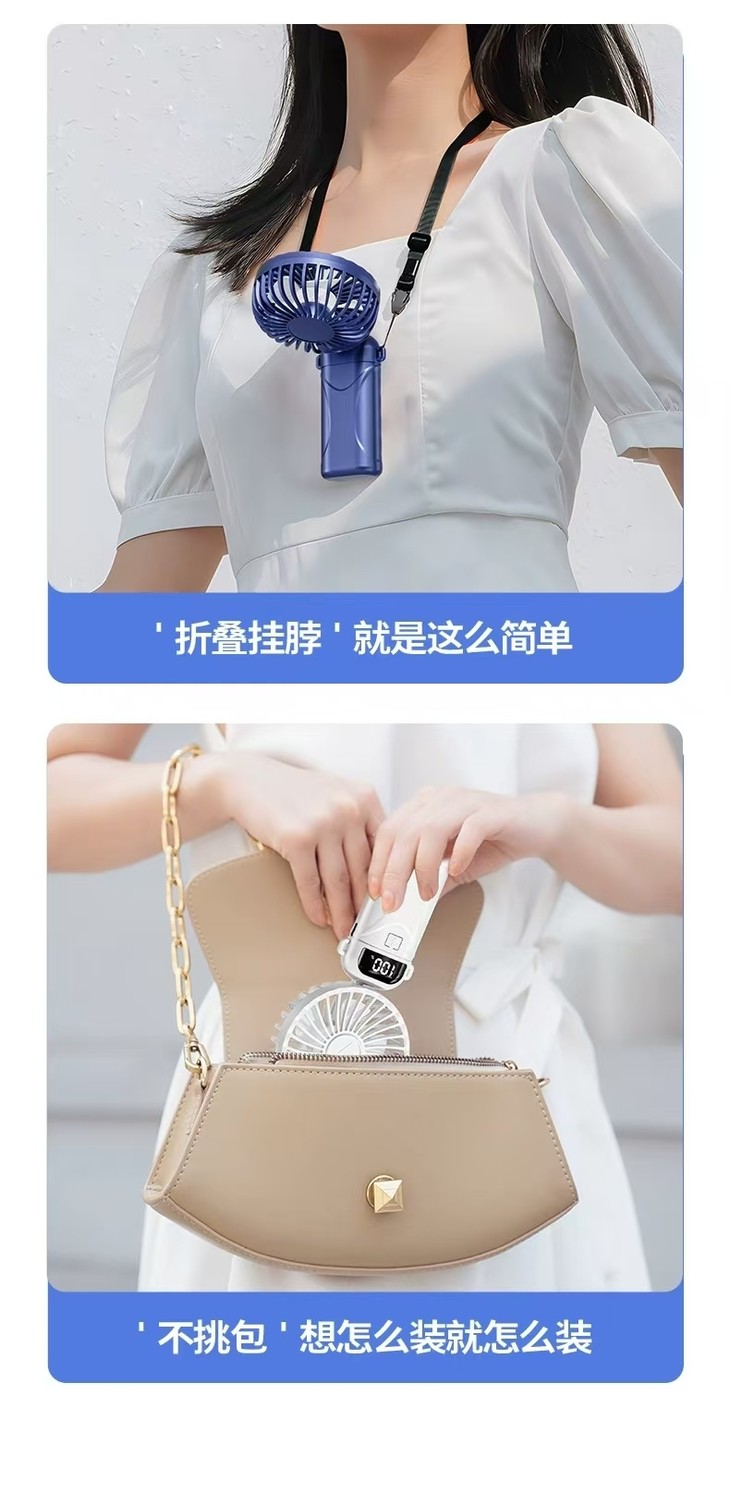KIVEE手持小风扇迷你便捷随身折叠支架usb充电风扇挂脖长续航丨智能数显丨5档强风丨带底座挂绳丨
