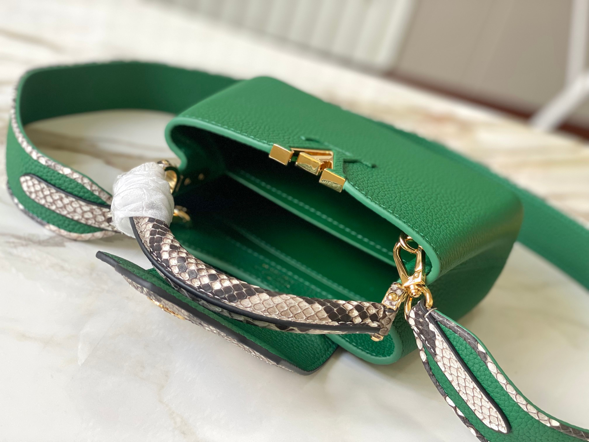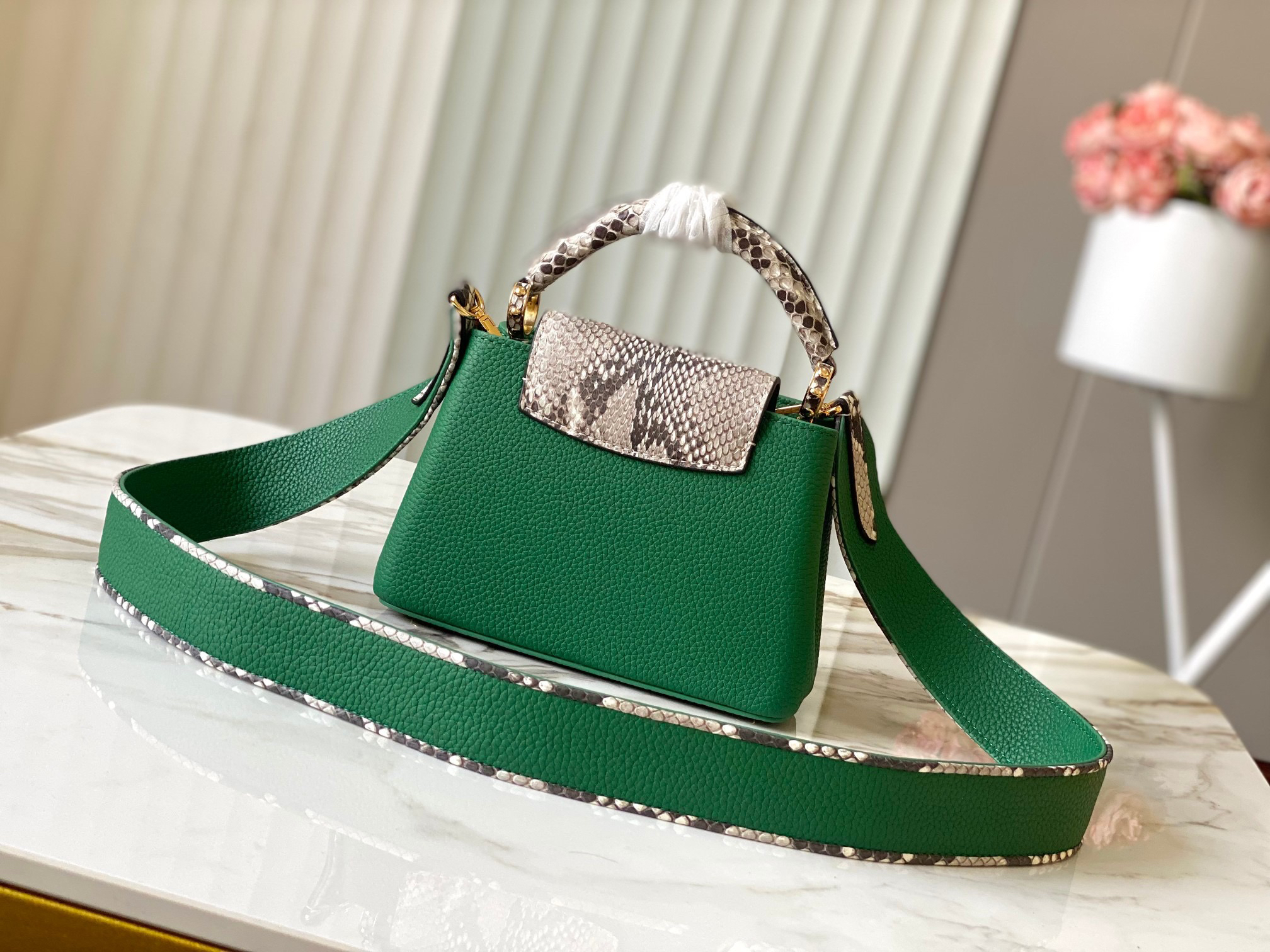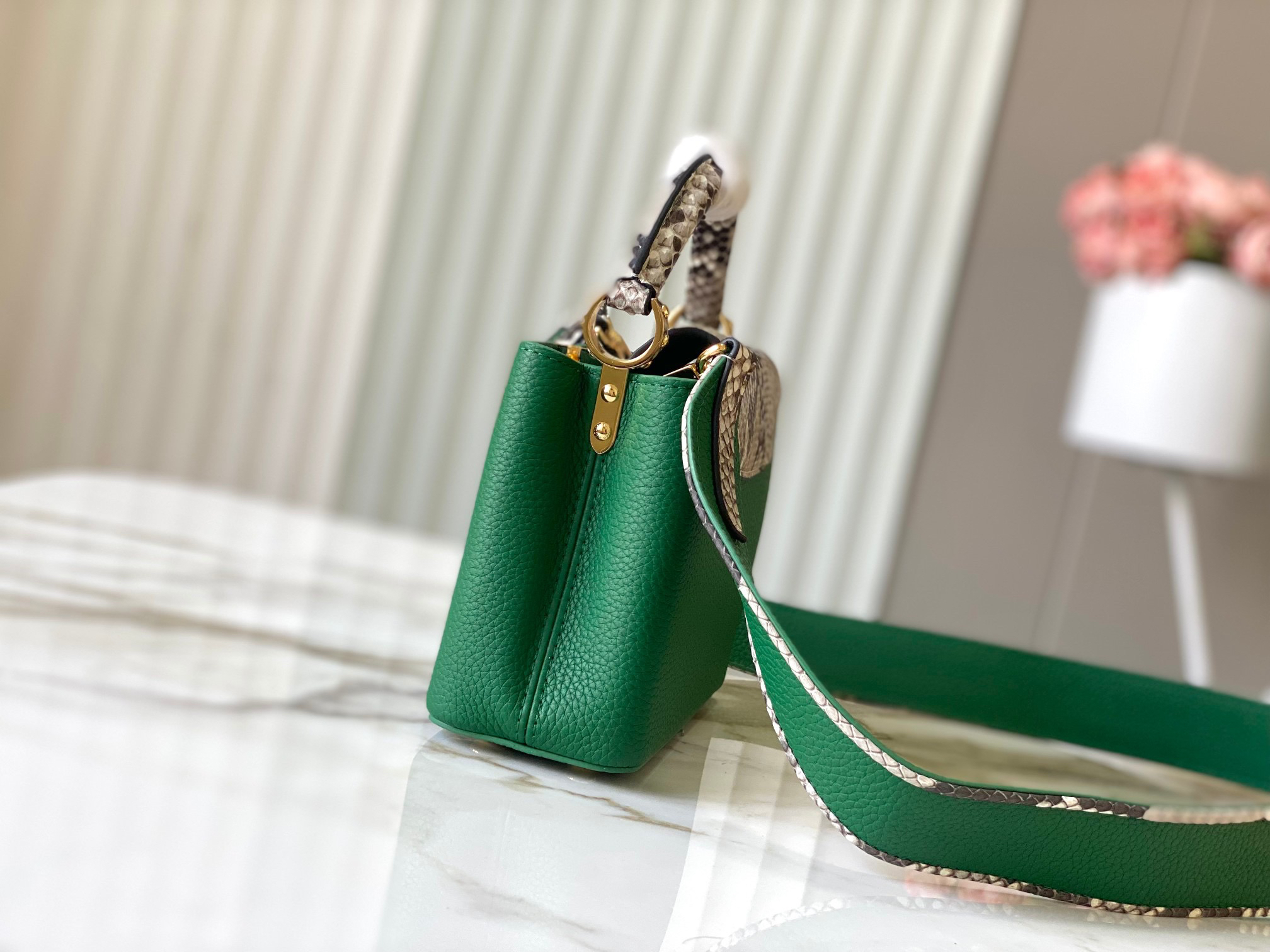 秋冬特惠💰1600 渠道级LV te级LV 全套包装 N99387/M48865绿 本款 Capucines 迷你号手袋以全粒面 Taurillon 皮革塑造精巧构型 搭配ding部手柄、两式翻盖及莹泽蟒蛇皮勾勒的 标识 成就昼夜皆宜的华美之选 可拆卸宽肩带令肩背或斜挎展露前卫气息 Size: 21 *14 * 8 cm
