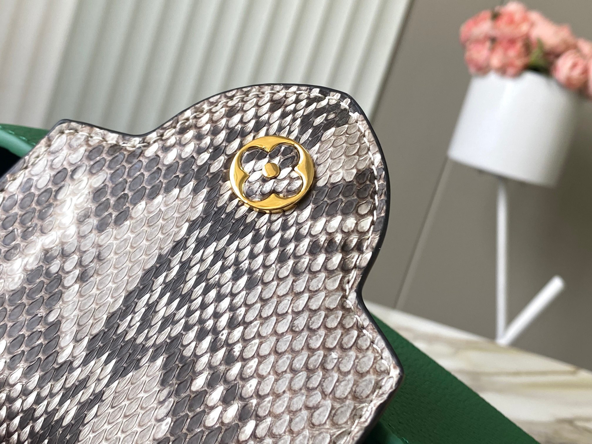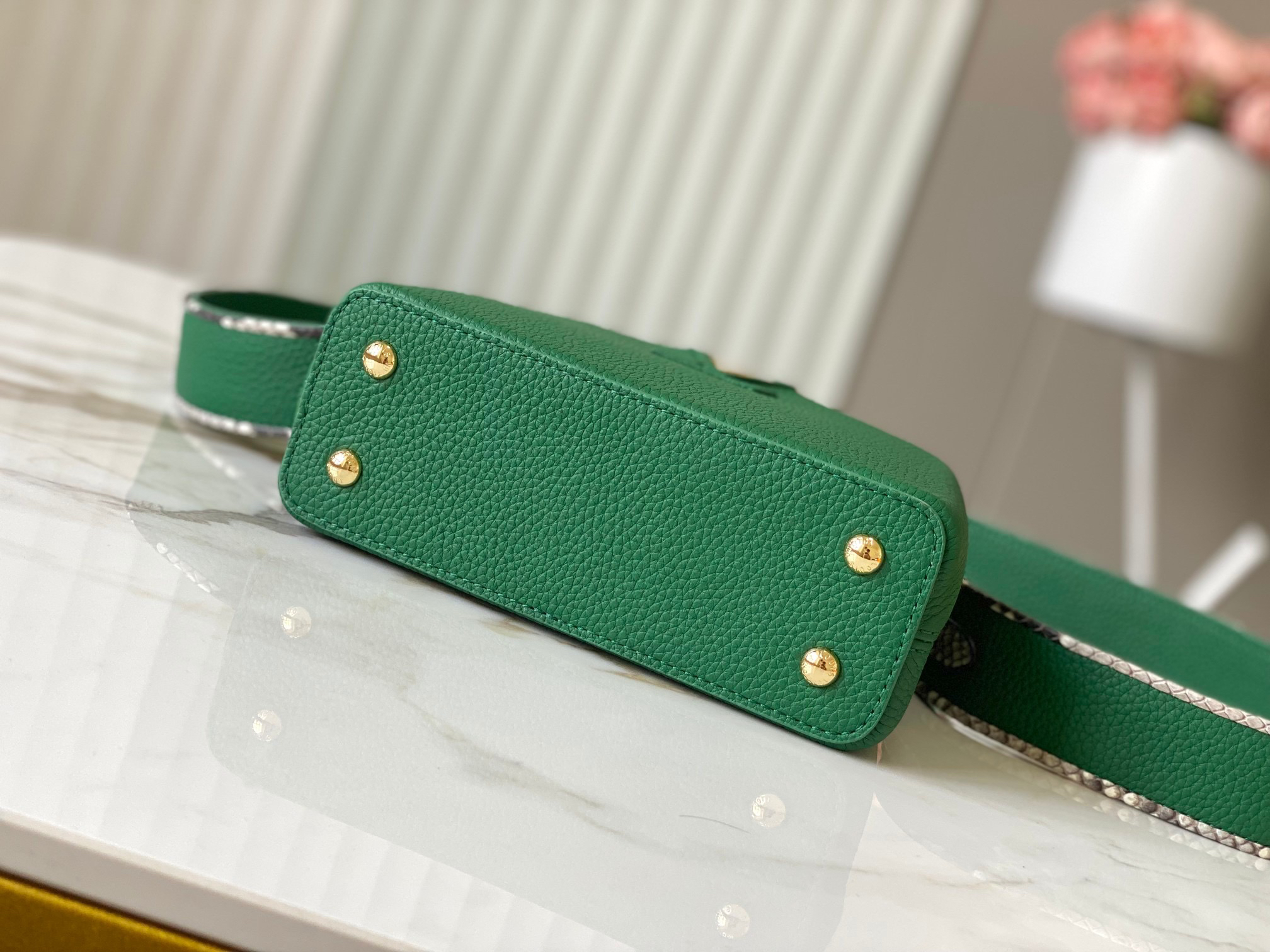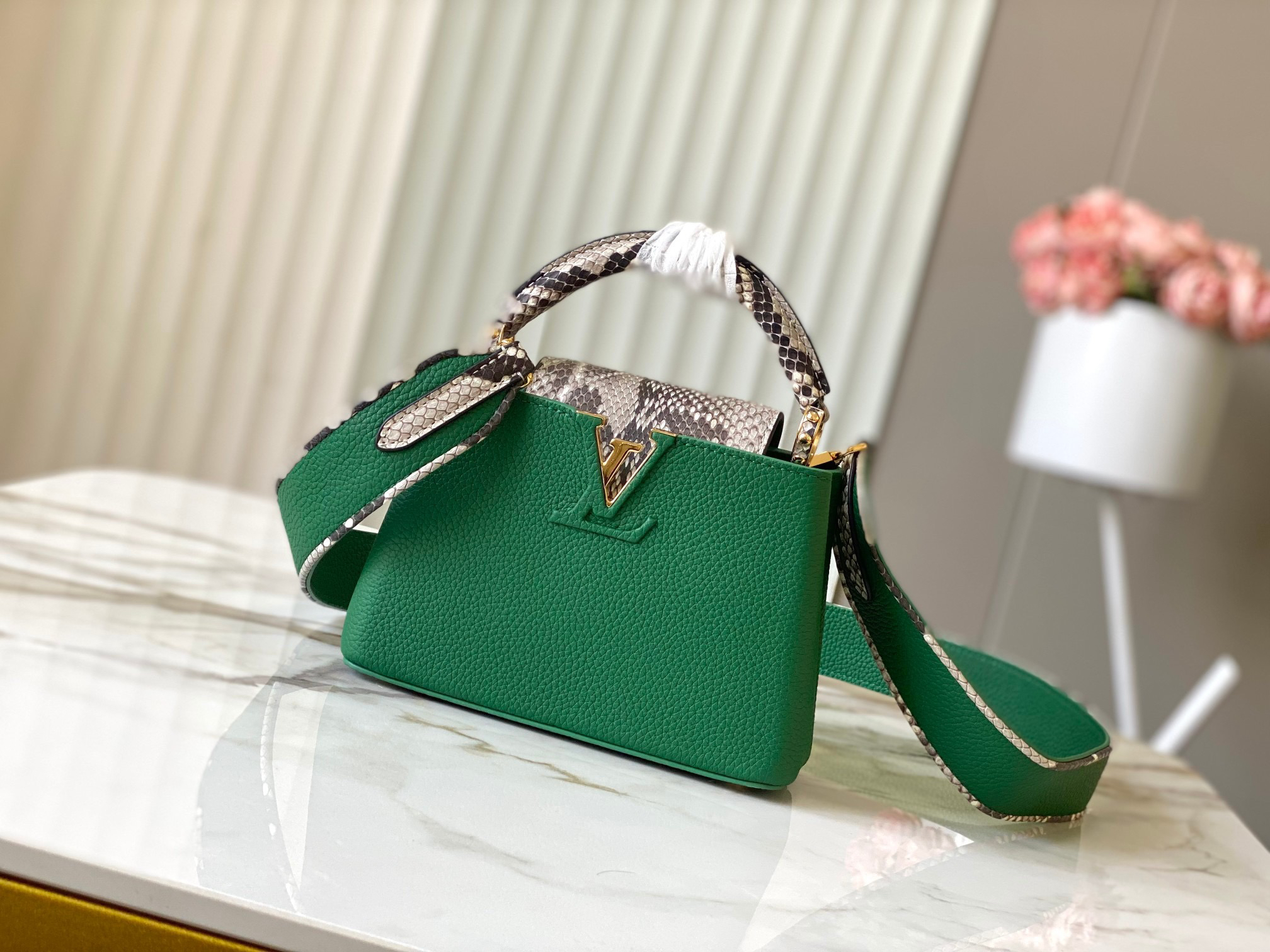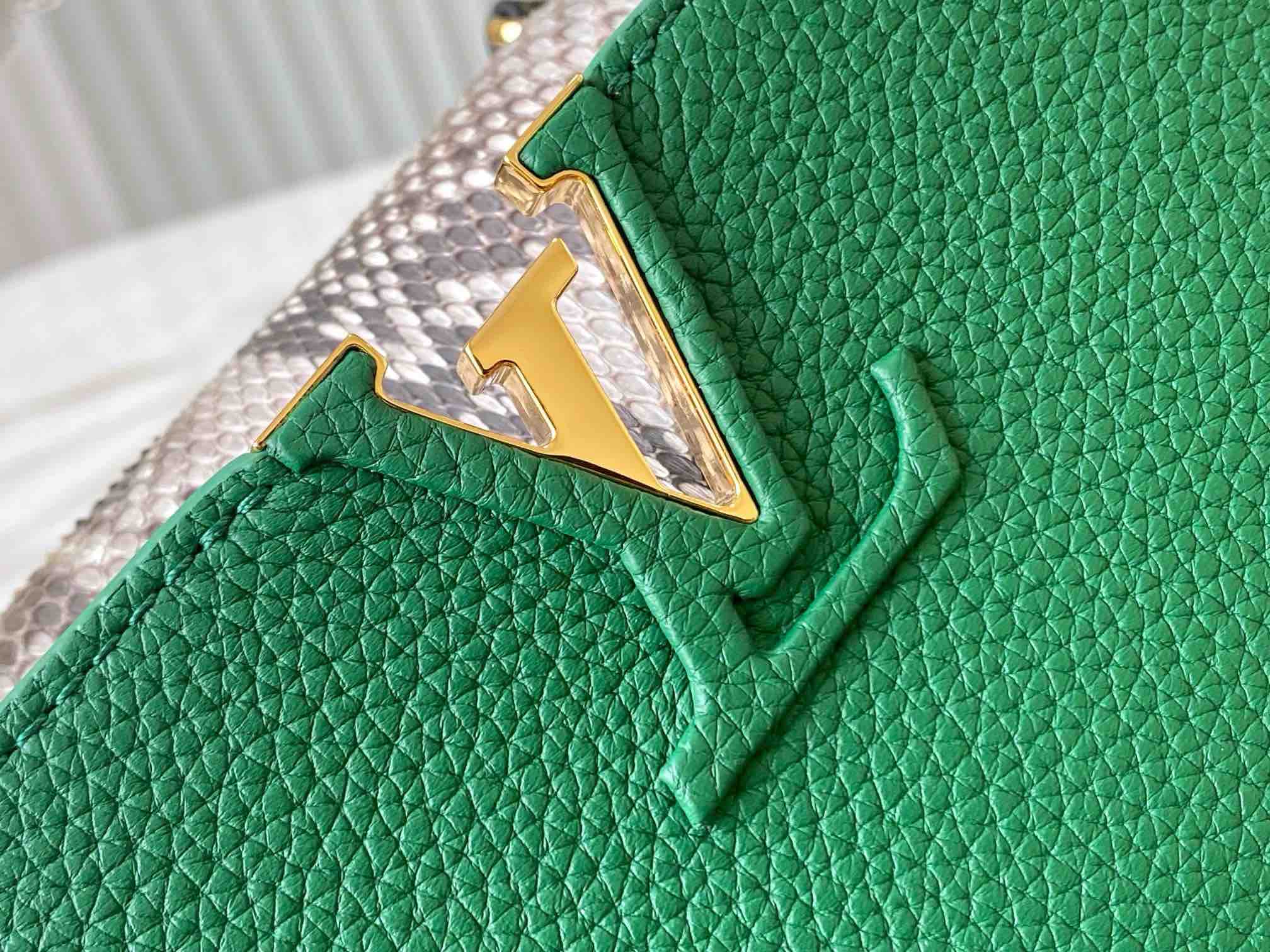 秋冬特惠💰1600 渠道级LV te级LV 全套包装 N99387/M48865绿 本款 Capucines 迷你号手袋以全粒面 Taurillon 皮革塑造精巧构型 搭配ding部手柄、两式翻盖及莹泽蟒蛇皮勾勒的 标识 成就昼夜皆宜的华美之选 可拆卸宽肩带令肩背或斜挎展露前卫气息 Size: 21 *14 * 8 cm