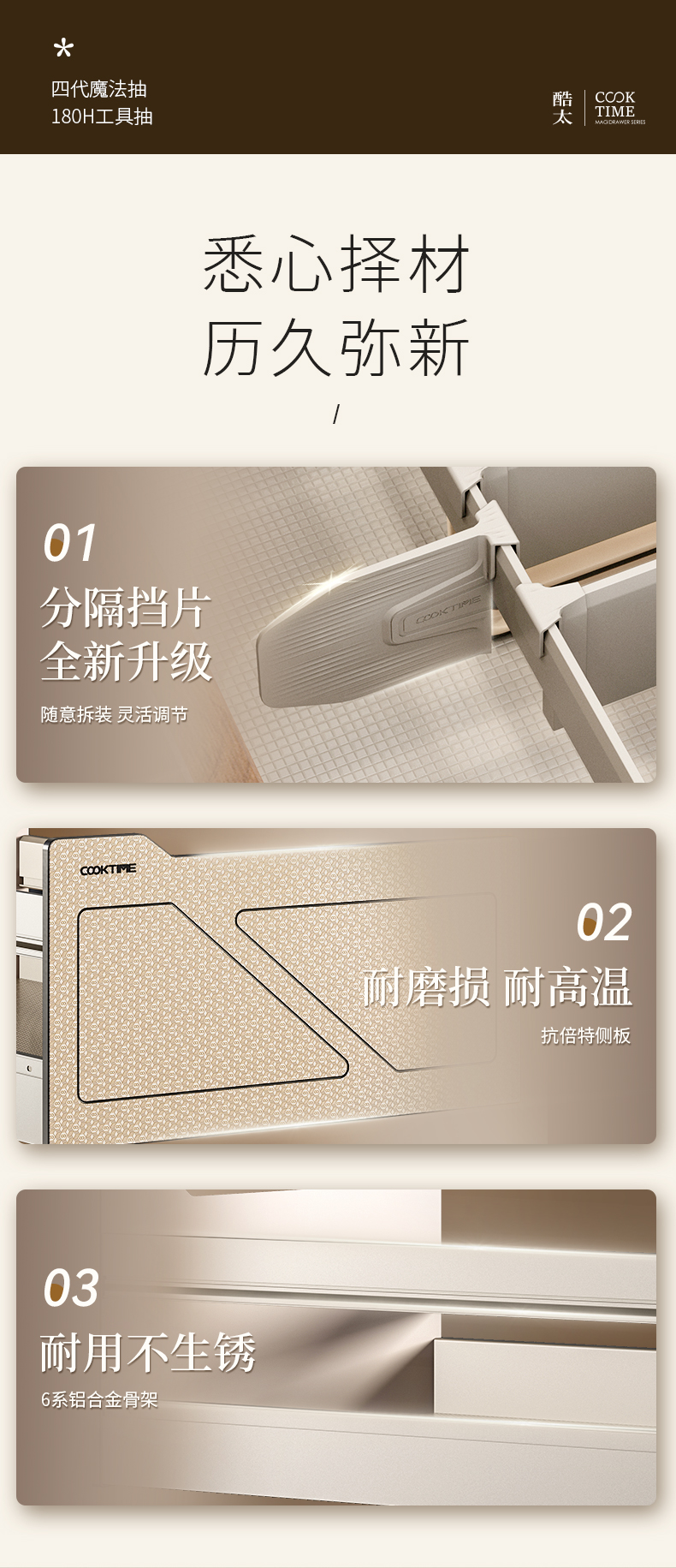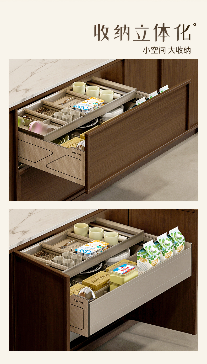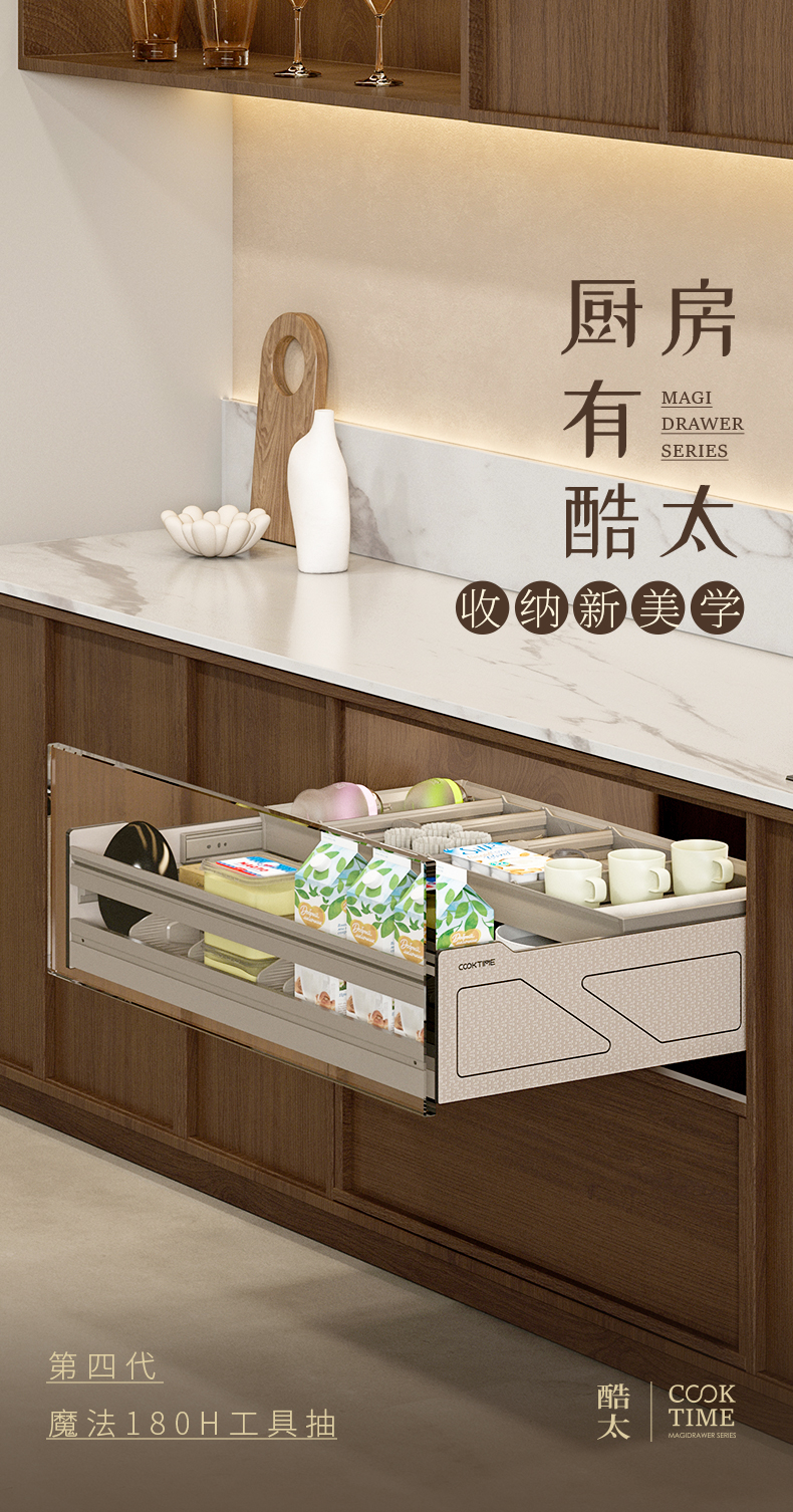 - 酷太坚持8年自主研发,已获得专利证书130项,拥有一套领先市场的厨房收纳系统,为千万中国家庭解决厨房脏乱差,缔造厨房新生活。