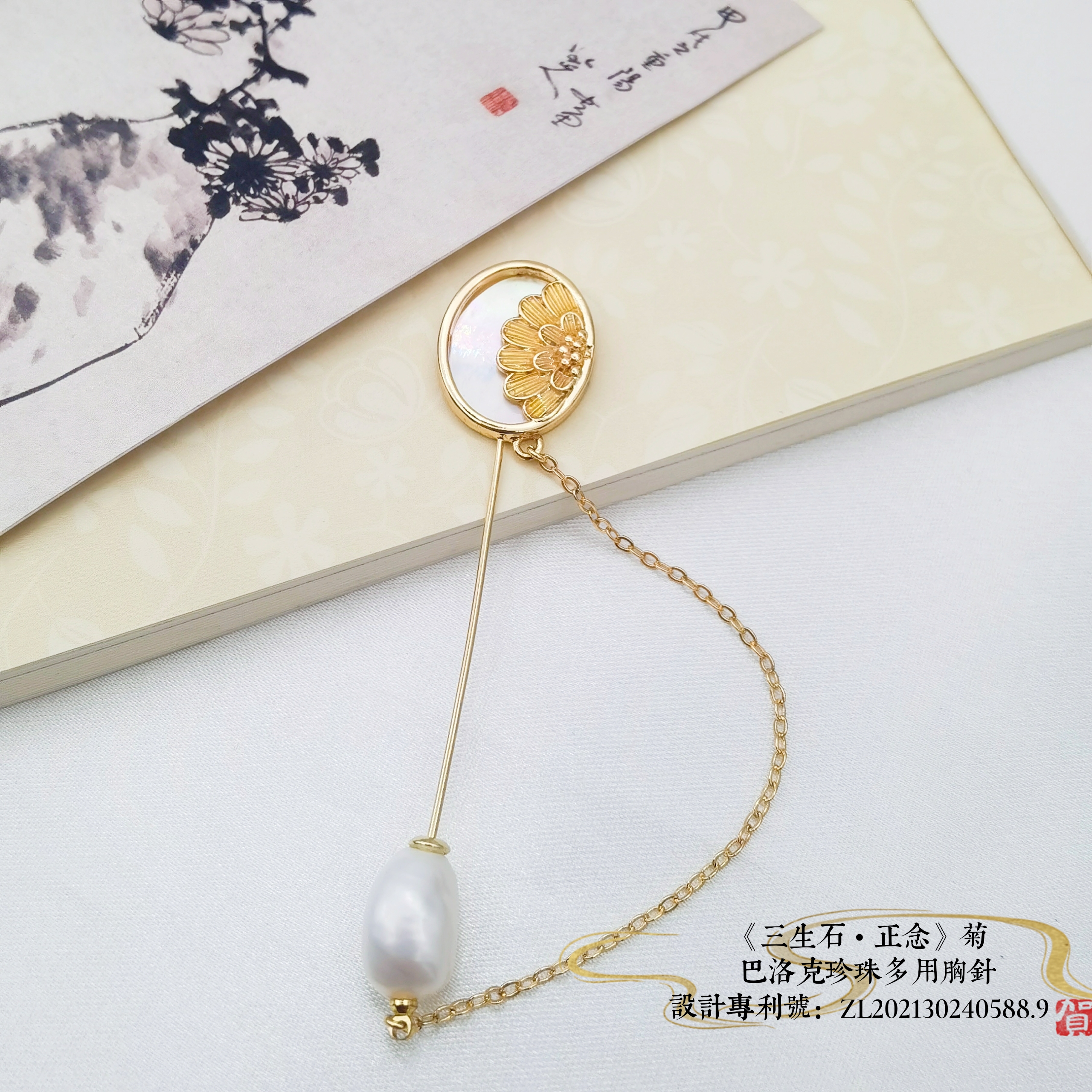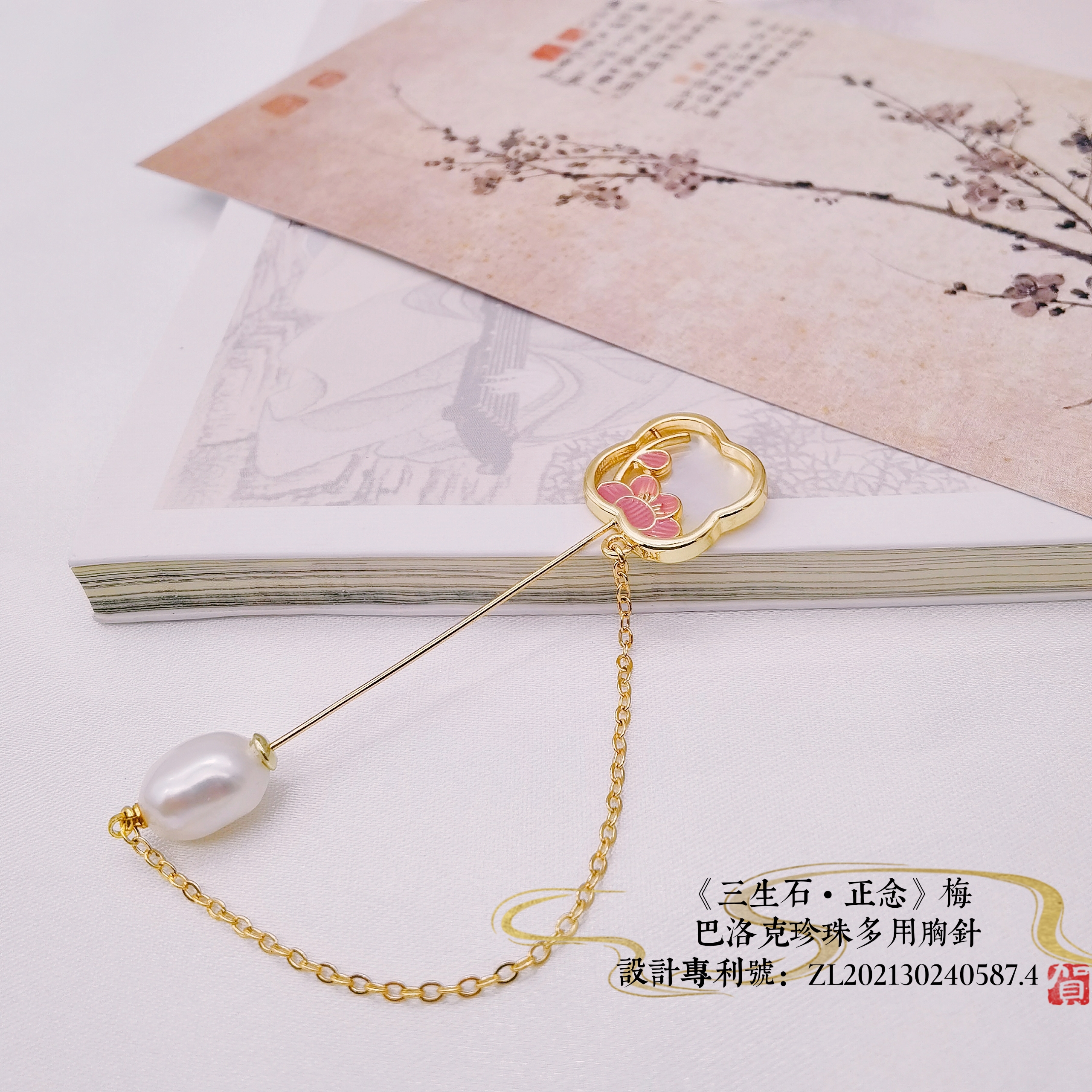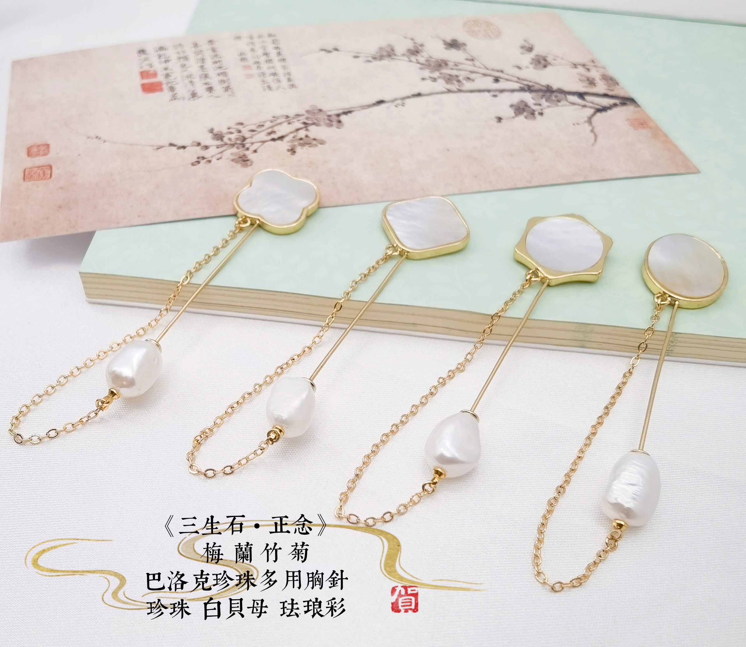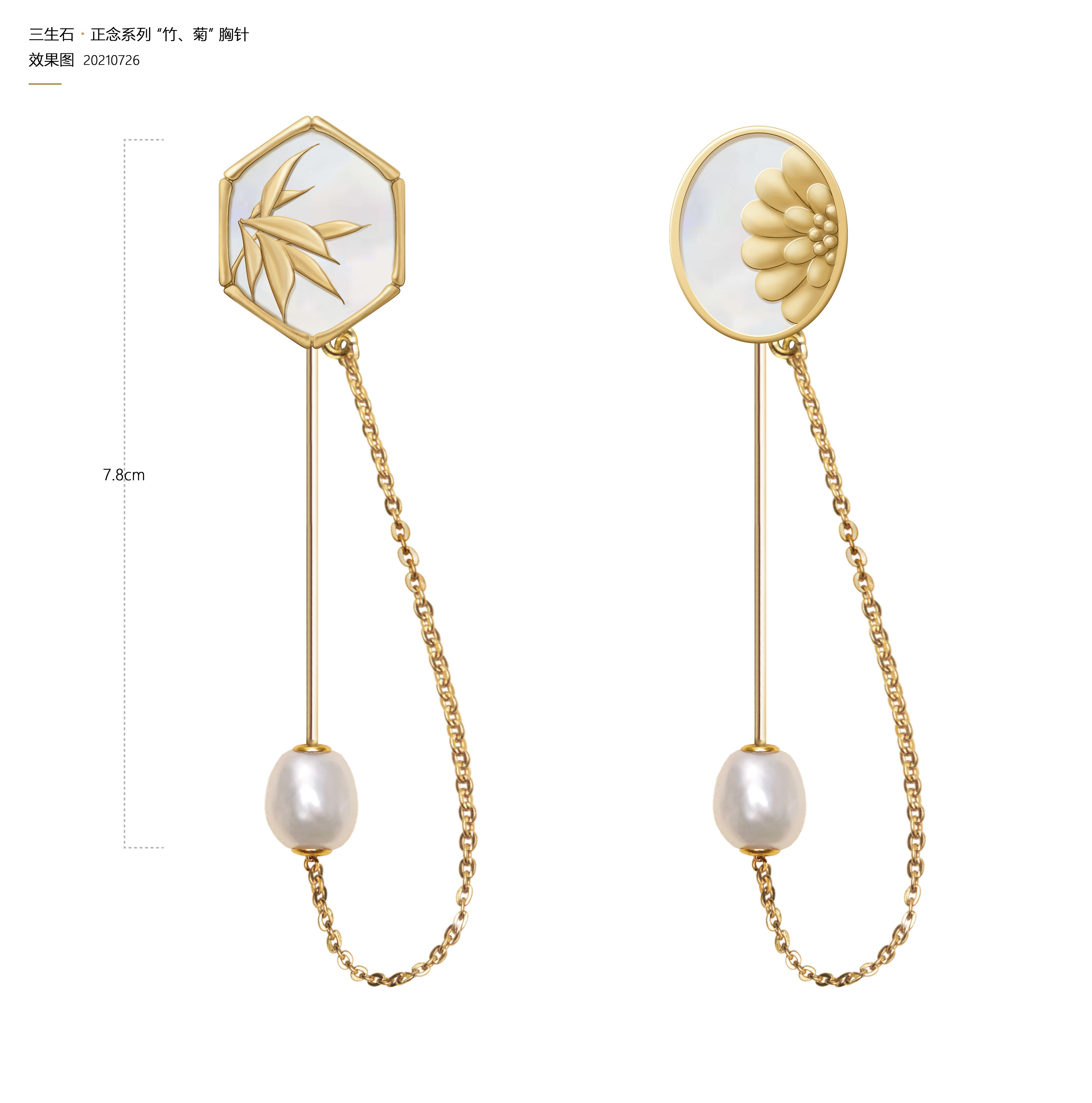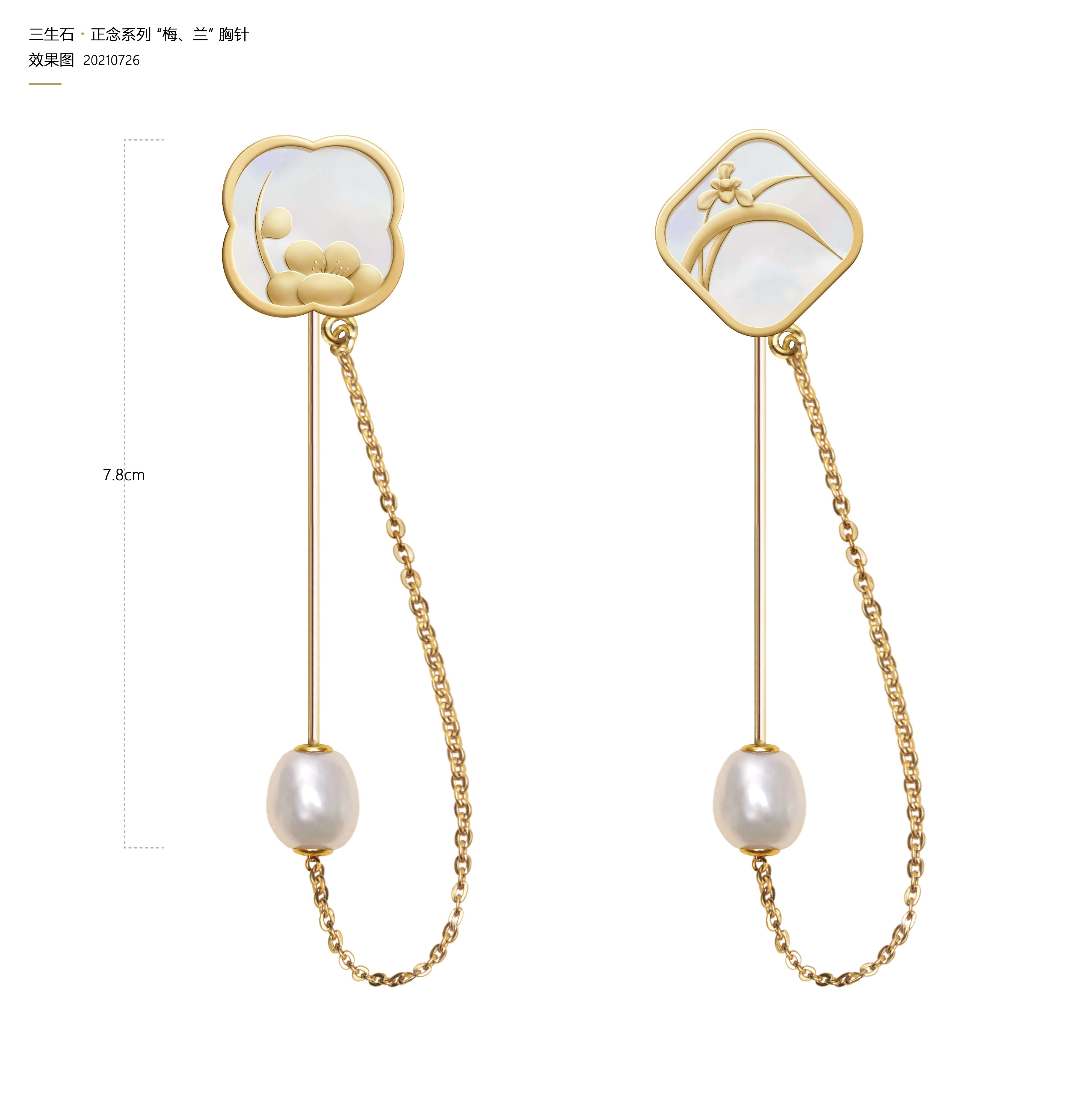 《三生石•正念》新国风生活首饰“梅兰竹菊”系列,以“正念”为切入点,选取传统“梅、兰、竹、菊”为创意原点,取元代王冕《墨梅》、清代郑板桥《兰》《竹》和明代八大山人朱耷的《菊》的作品局部写意,用现代与传统工艺相结合、设计一款基于胸针的多用途多功能配饰。