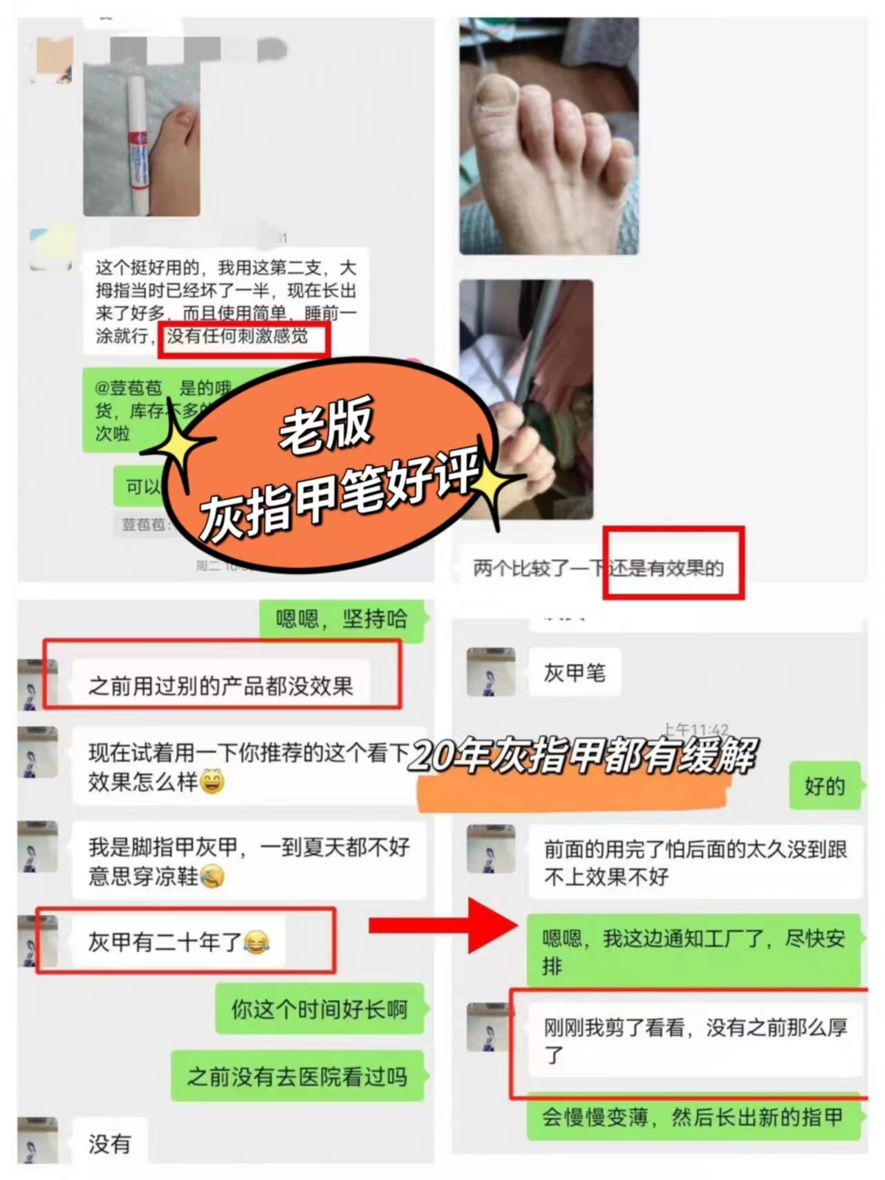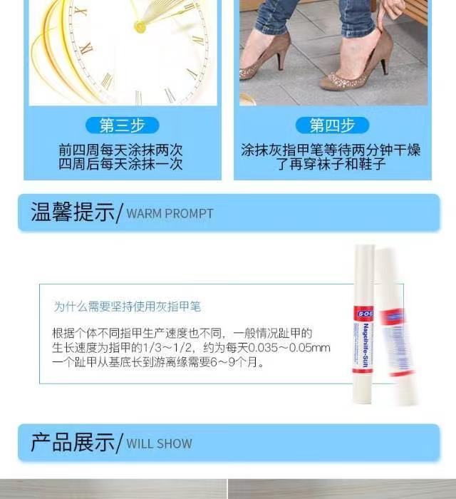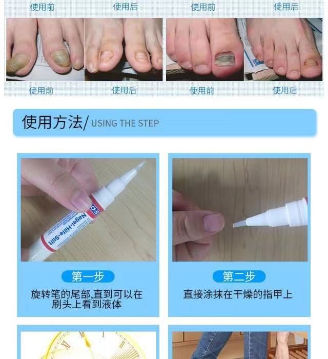3.每个人的基本情况不一样,去灰指甲笔对常规轻微的灰指甲,有抑菌作用,且可以加快指甲的代谢和新甲的生长;灰指甲症状比较重的家人们建议去医院检查治疗更佳,然后用指甲笔作为辅助治疗,效果更好!