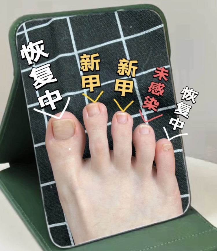 重点强调: 不要见好就收,真菌没有被灭,还会复发的,加上一个健康的指甲从甲根完全生长出来也需要3个月左右~
