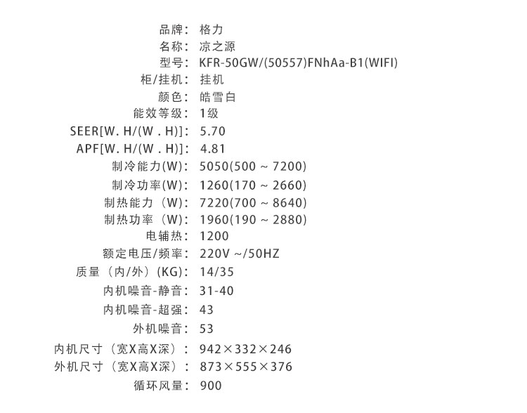 格力·凉之源 变频冷暖2匹新一级能效挂机空调 KFR-50GW/(50557)FNhAa-B1(WIFI)