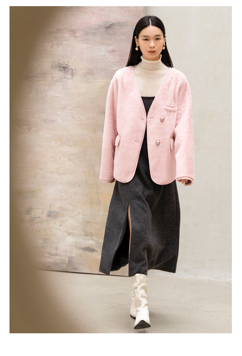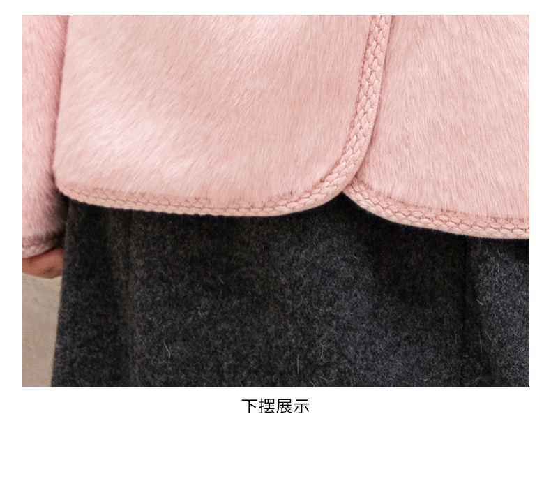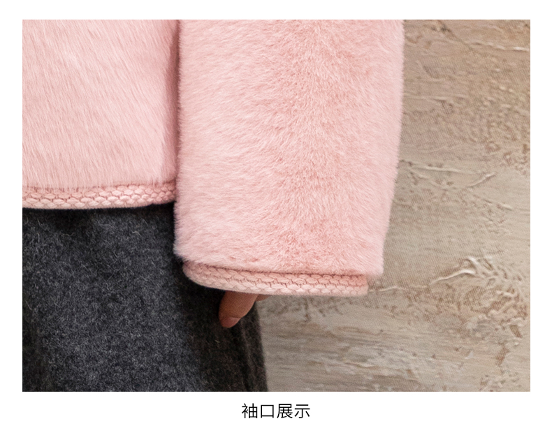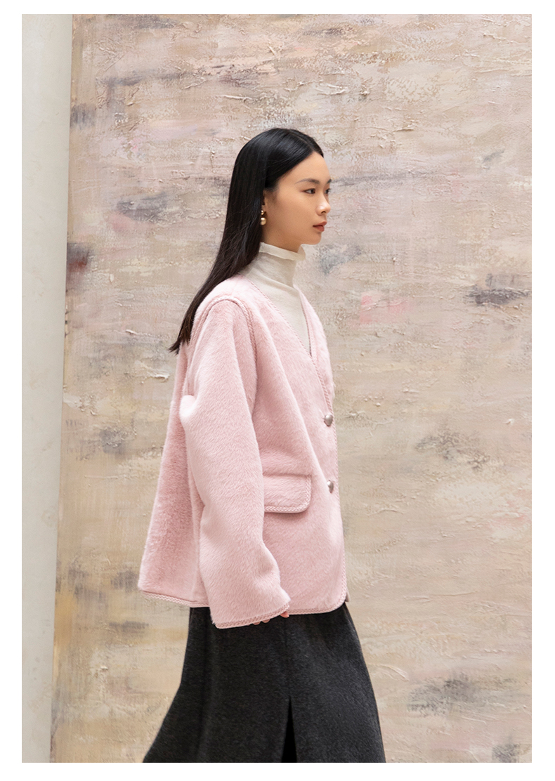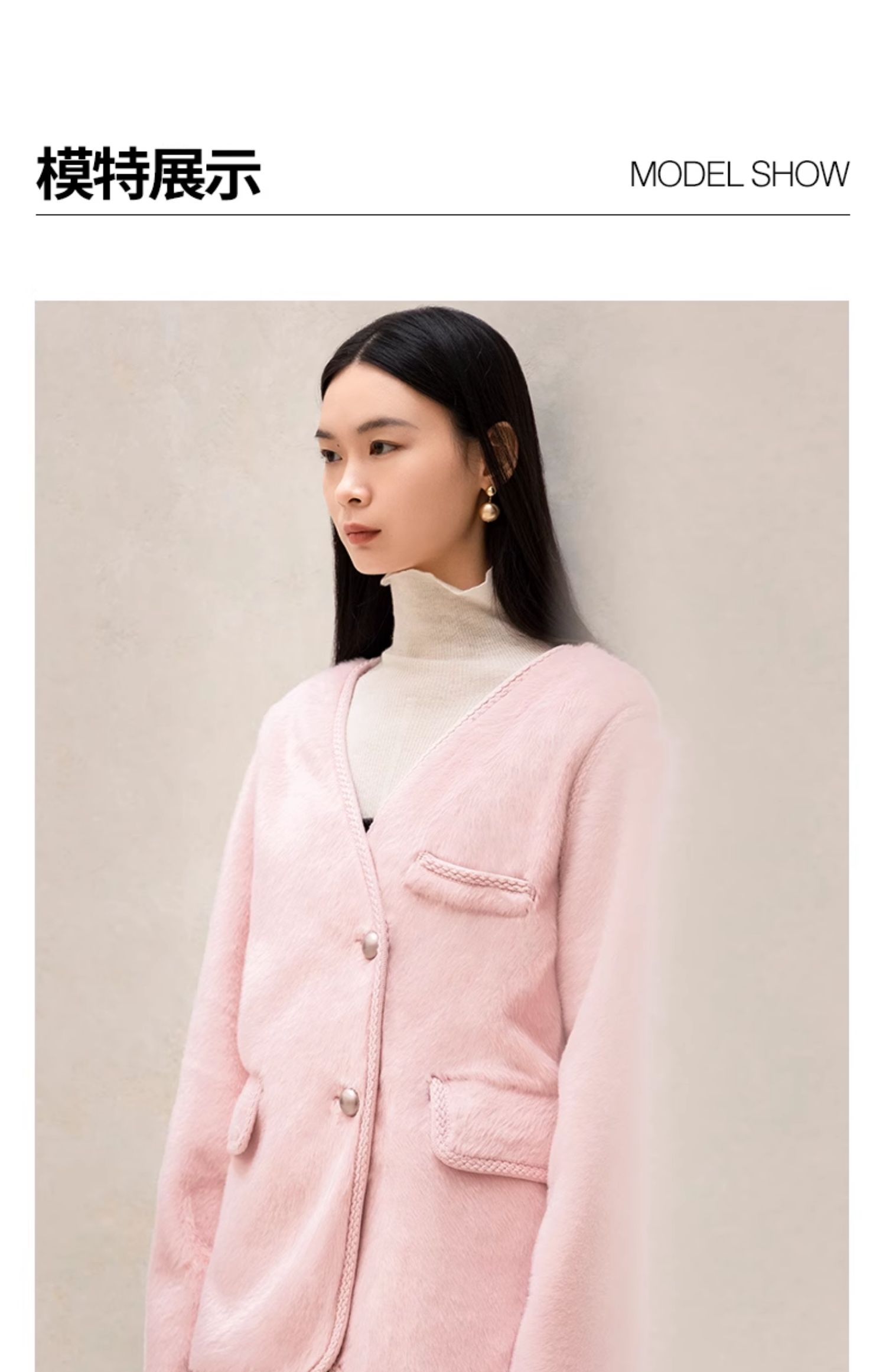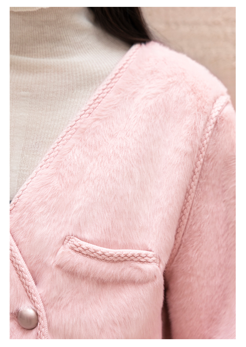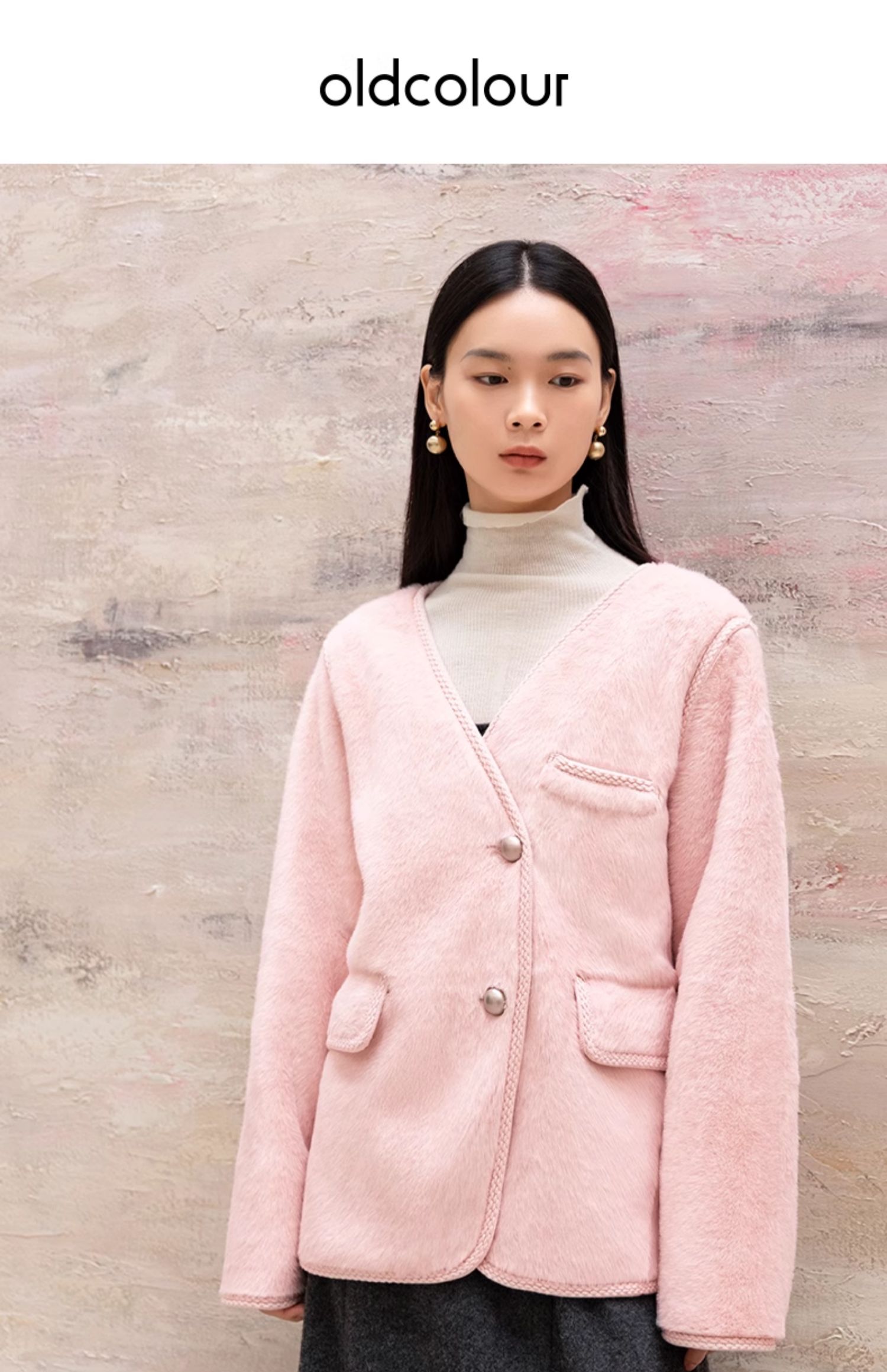 oldcolour秋冬新品V领保暖时尚纯色编织边外套女P430402A1