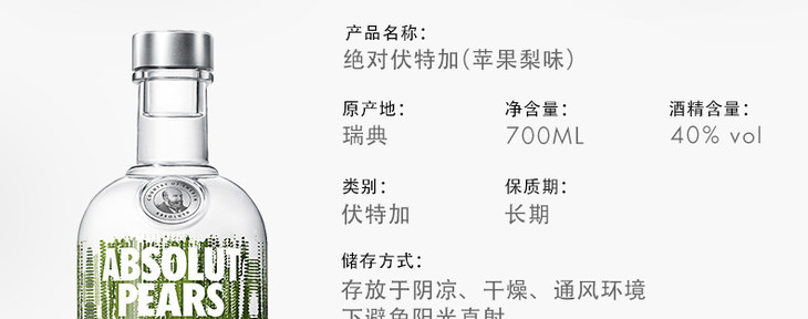 【单瓶】绝对伏特加(苹果梨味) 700ml 40%vol 同城免邮