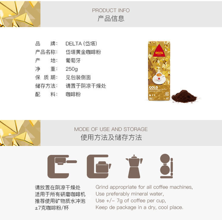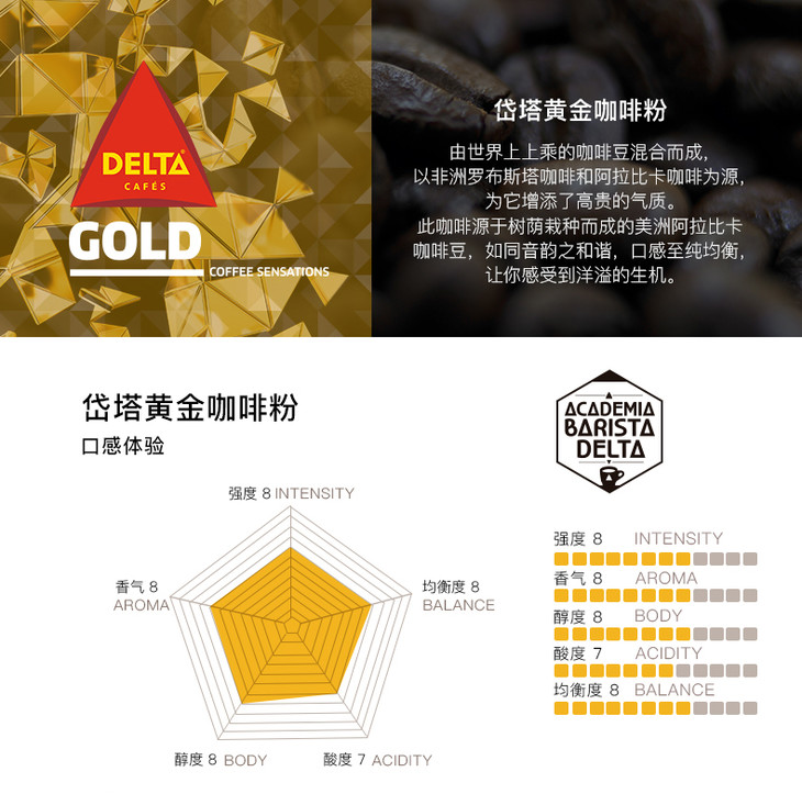DELTA/岱塔 黄金 进口精选阿拉比卡 现磨无蔗糖手冲咖啡粉 250g