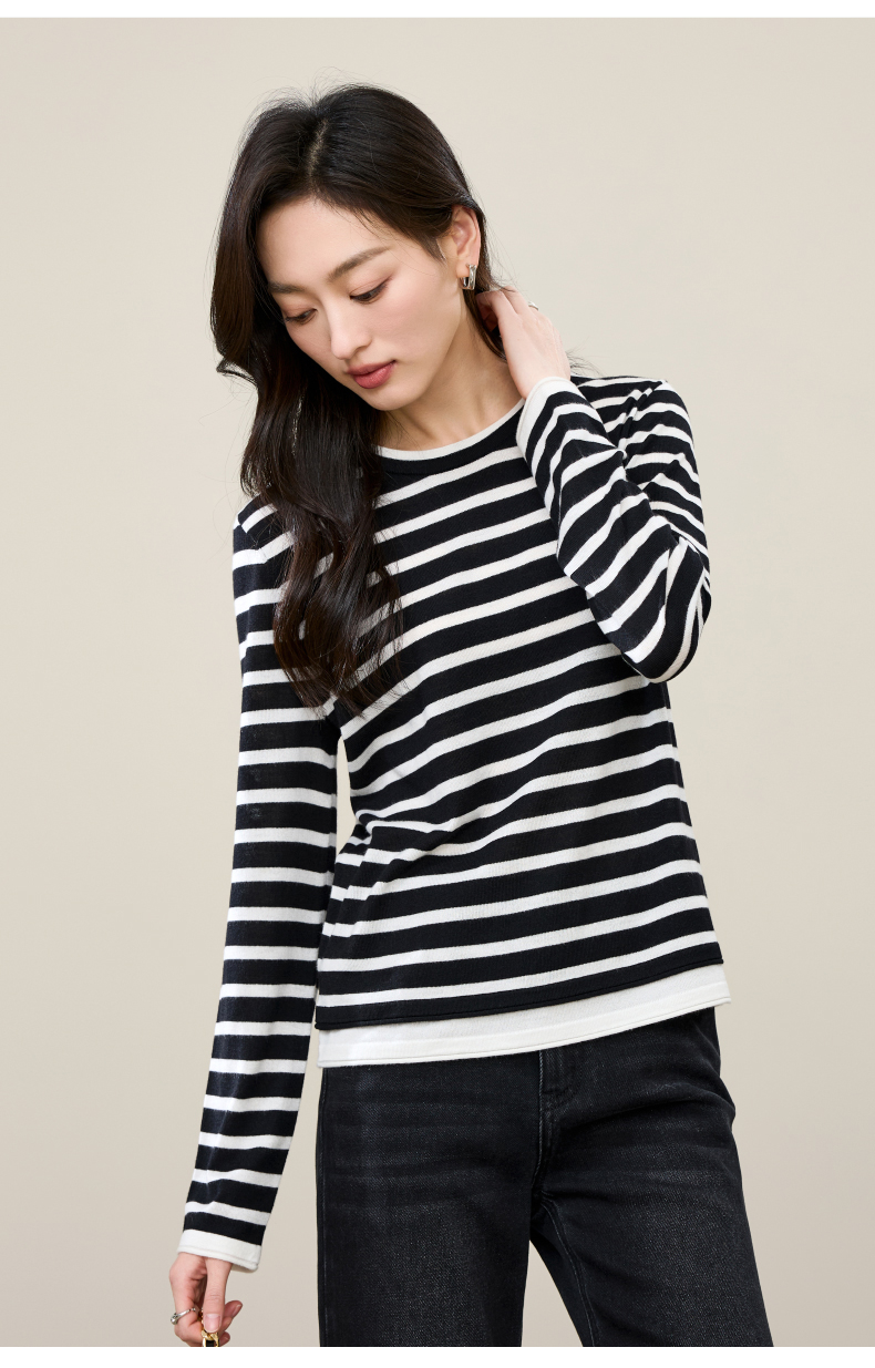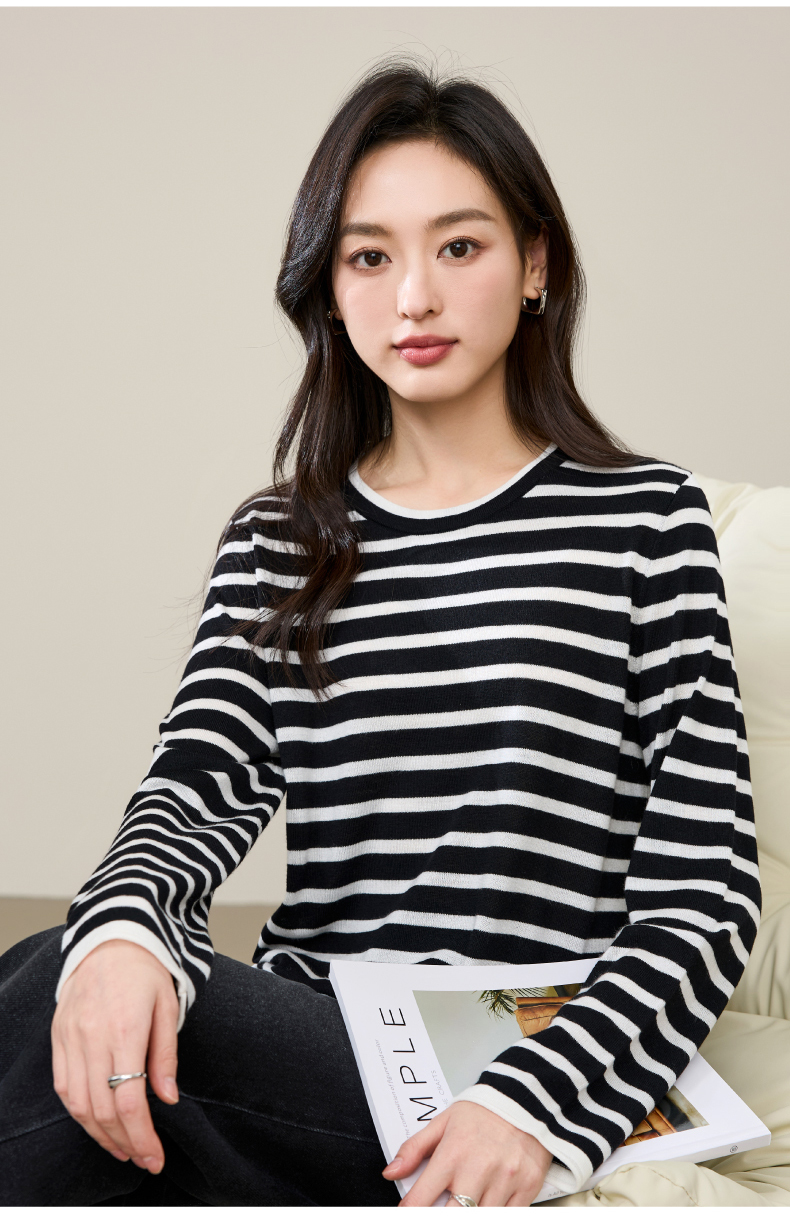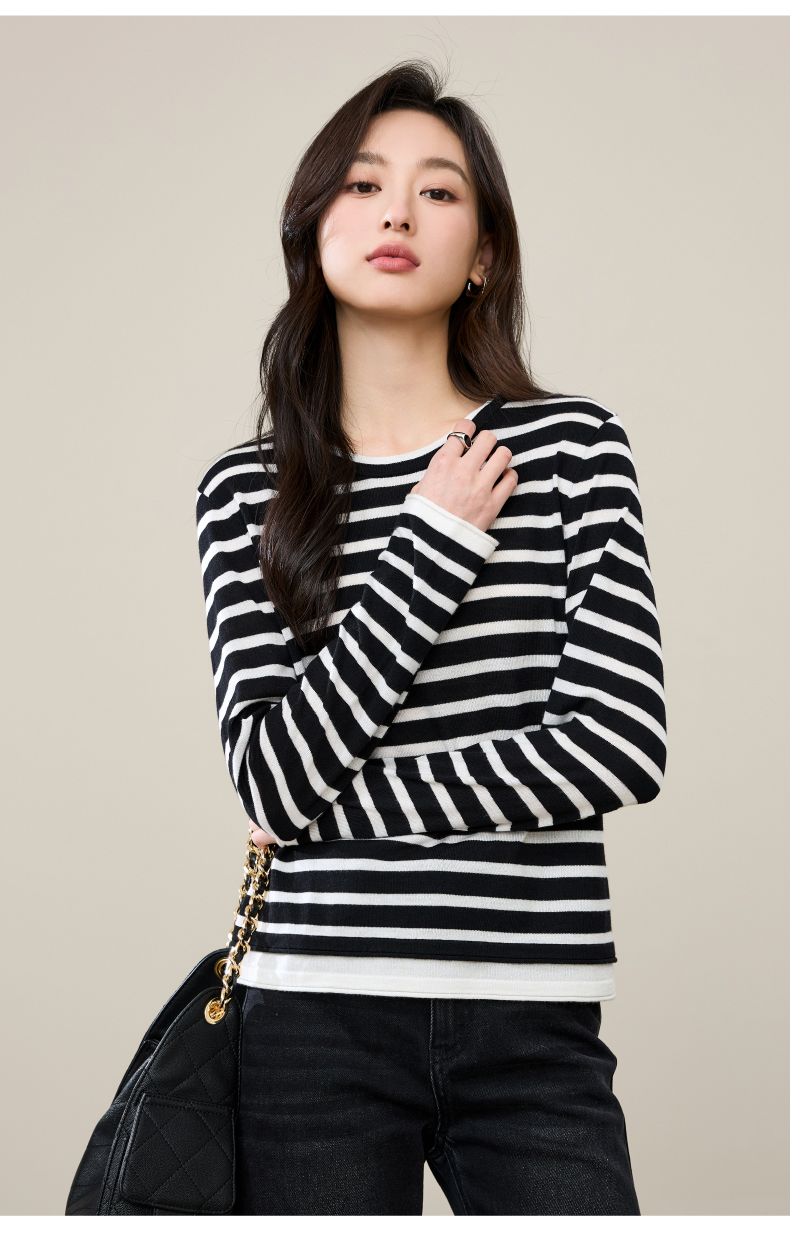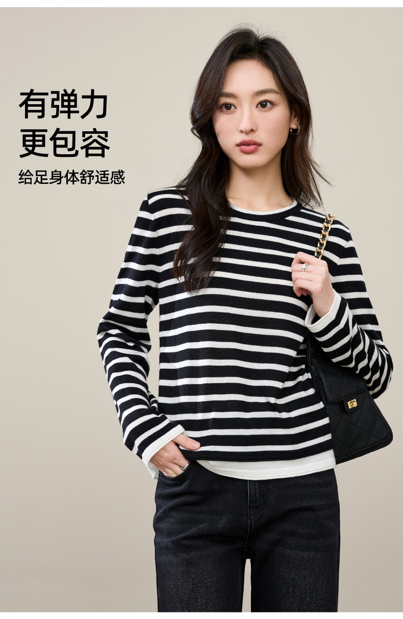 【软糯-条纹T恤】逸阳秋新品宽松套头黑白条纹时尚撞色内搭打底衫5290