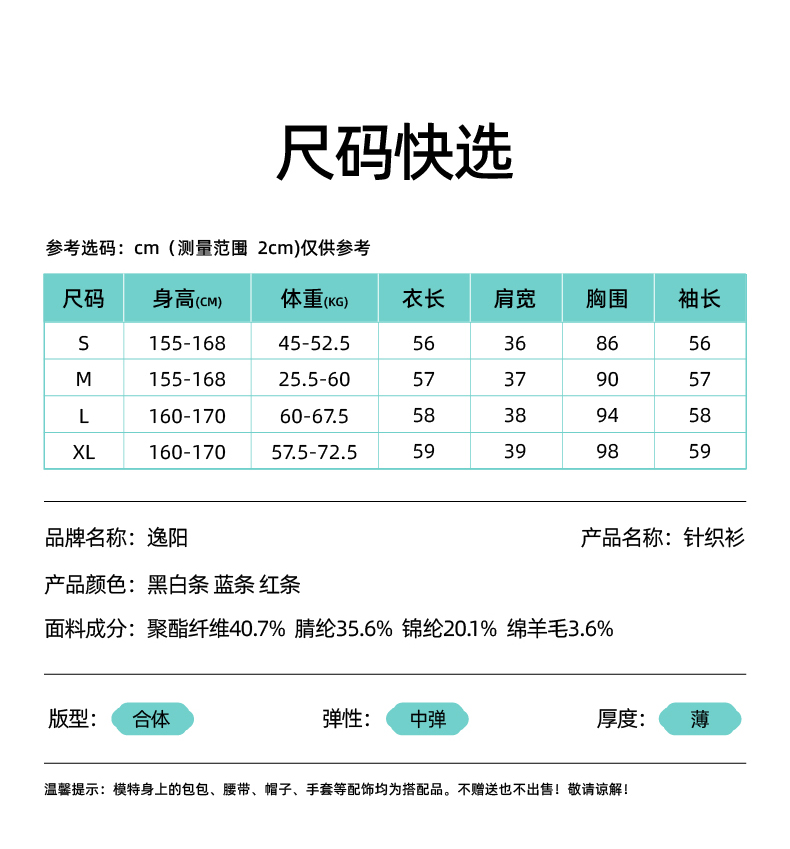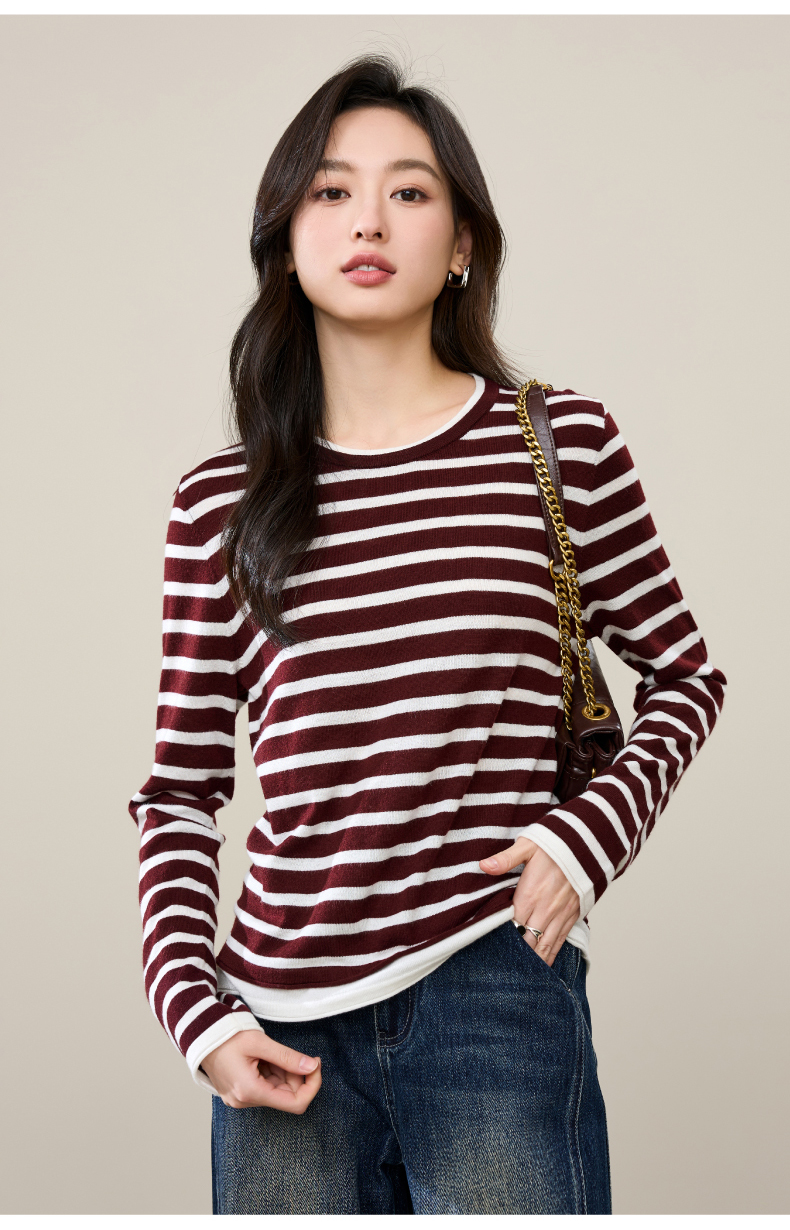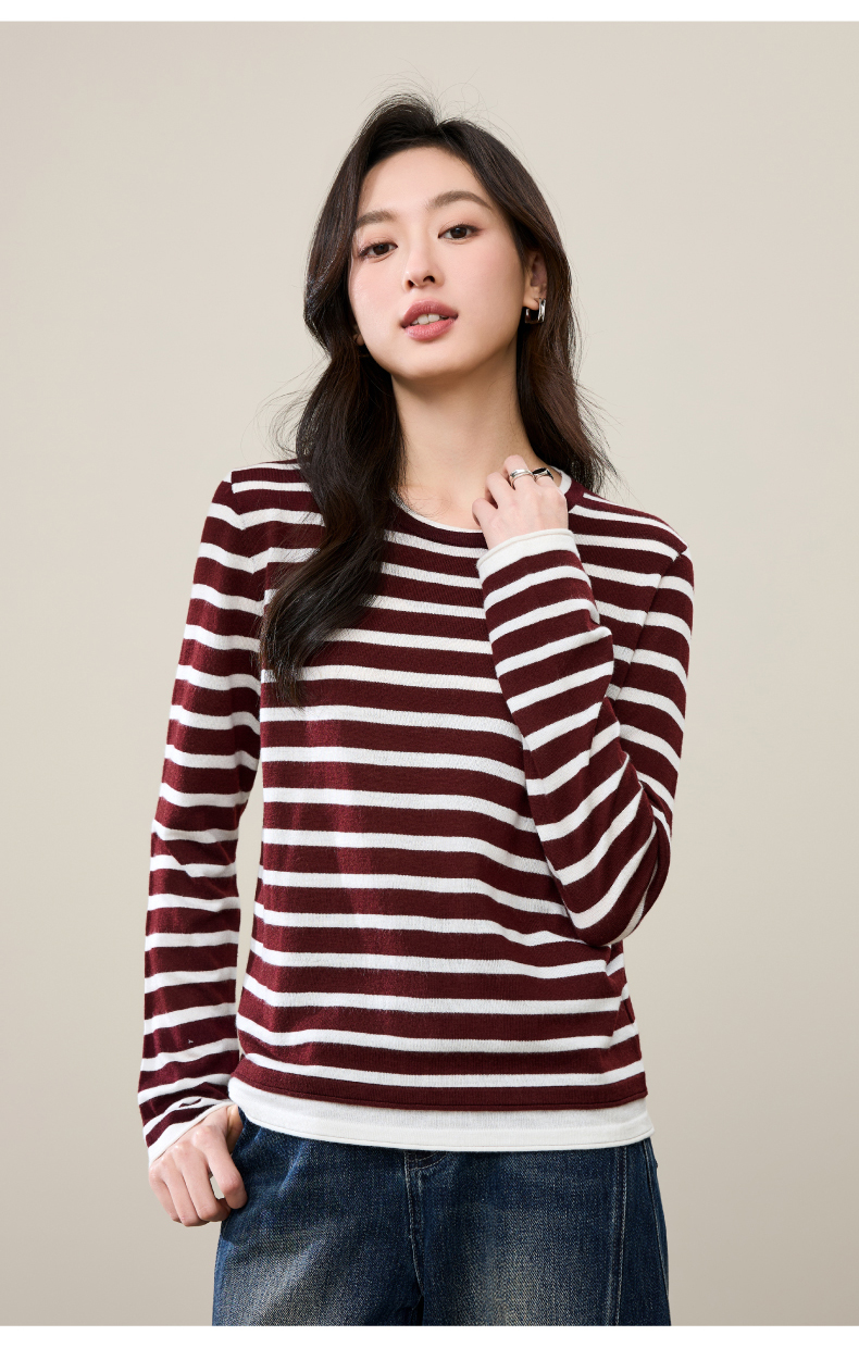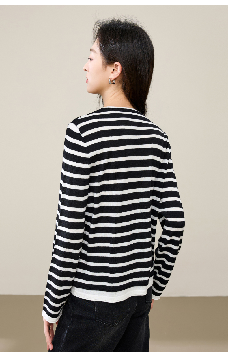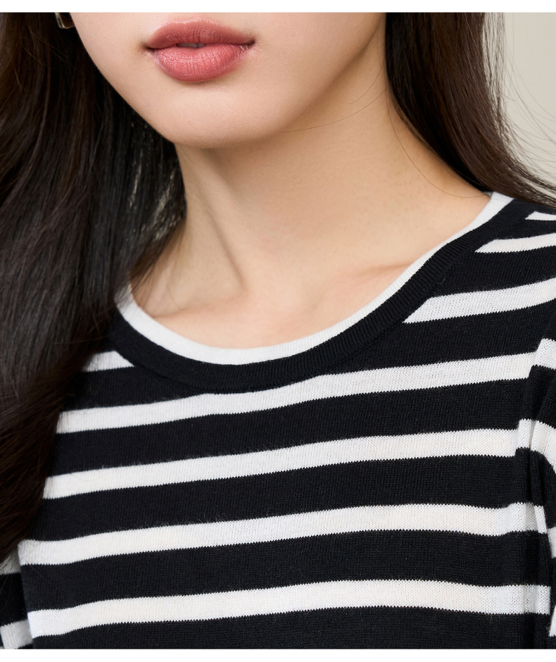 【软糯-条纹T恤】逸阳秋新品宽松套头黑白条纹时尚撞色内搭打底衫5290