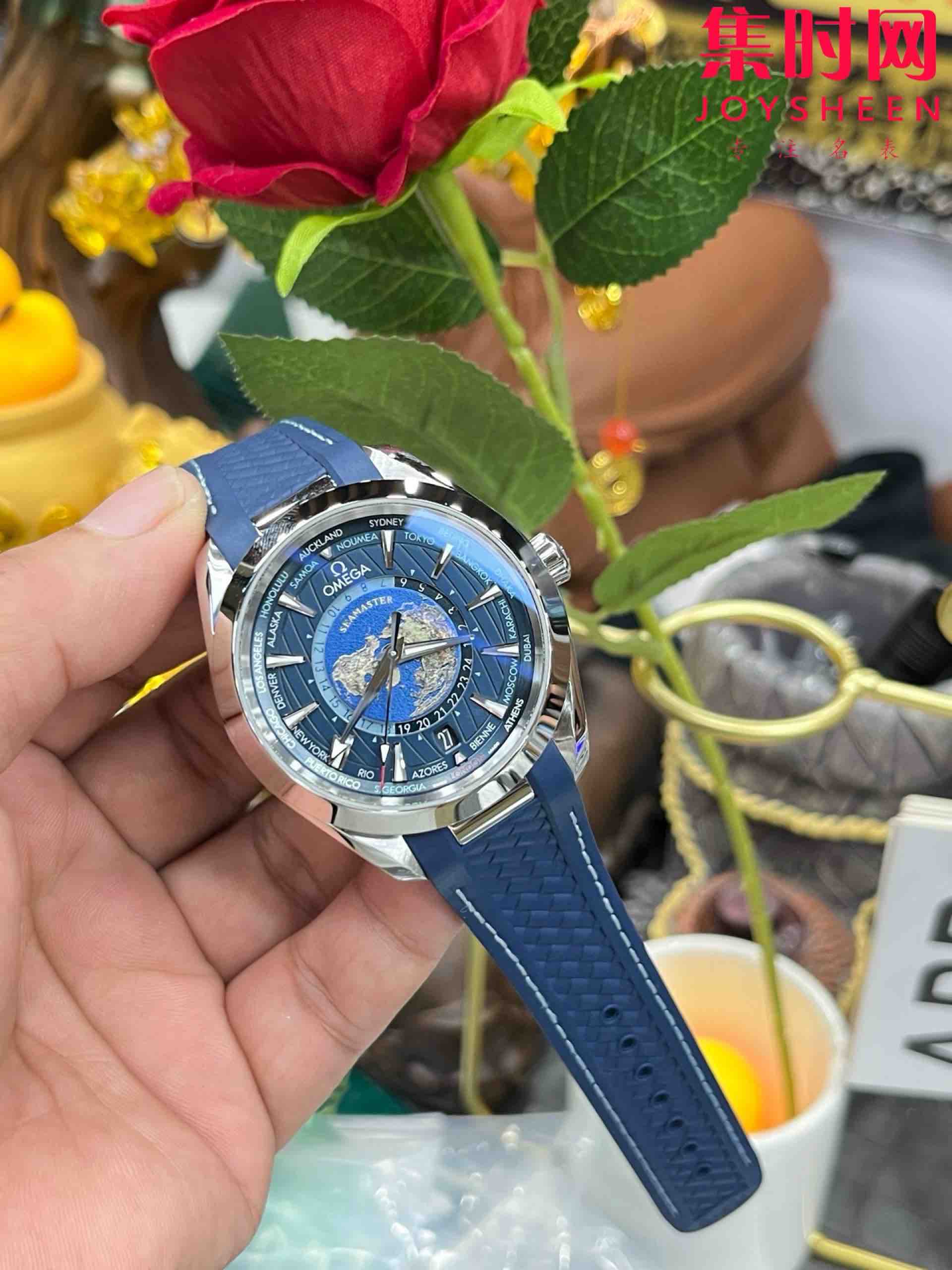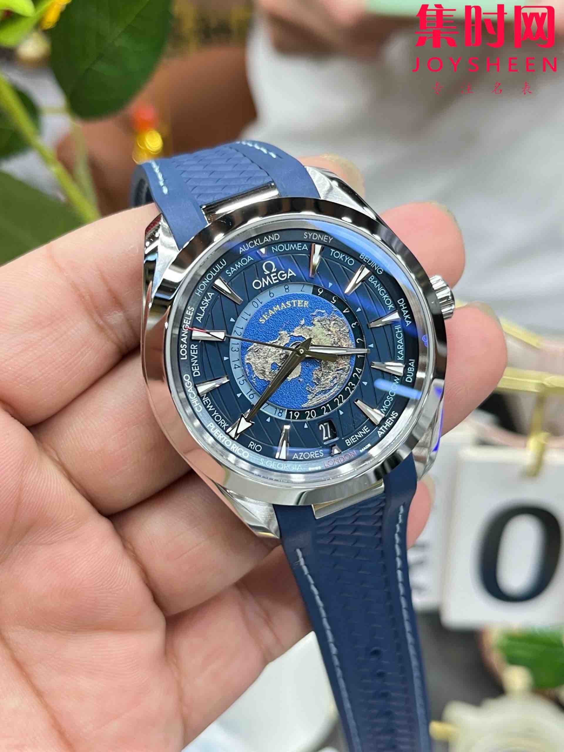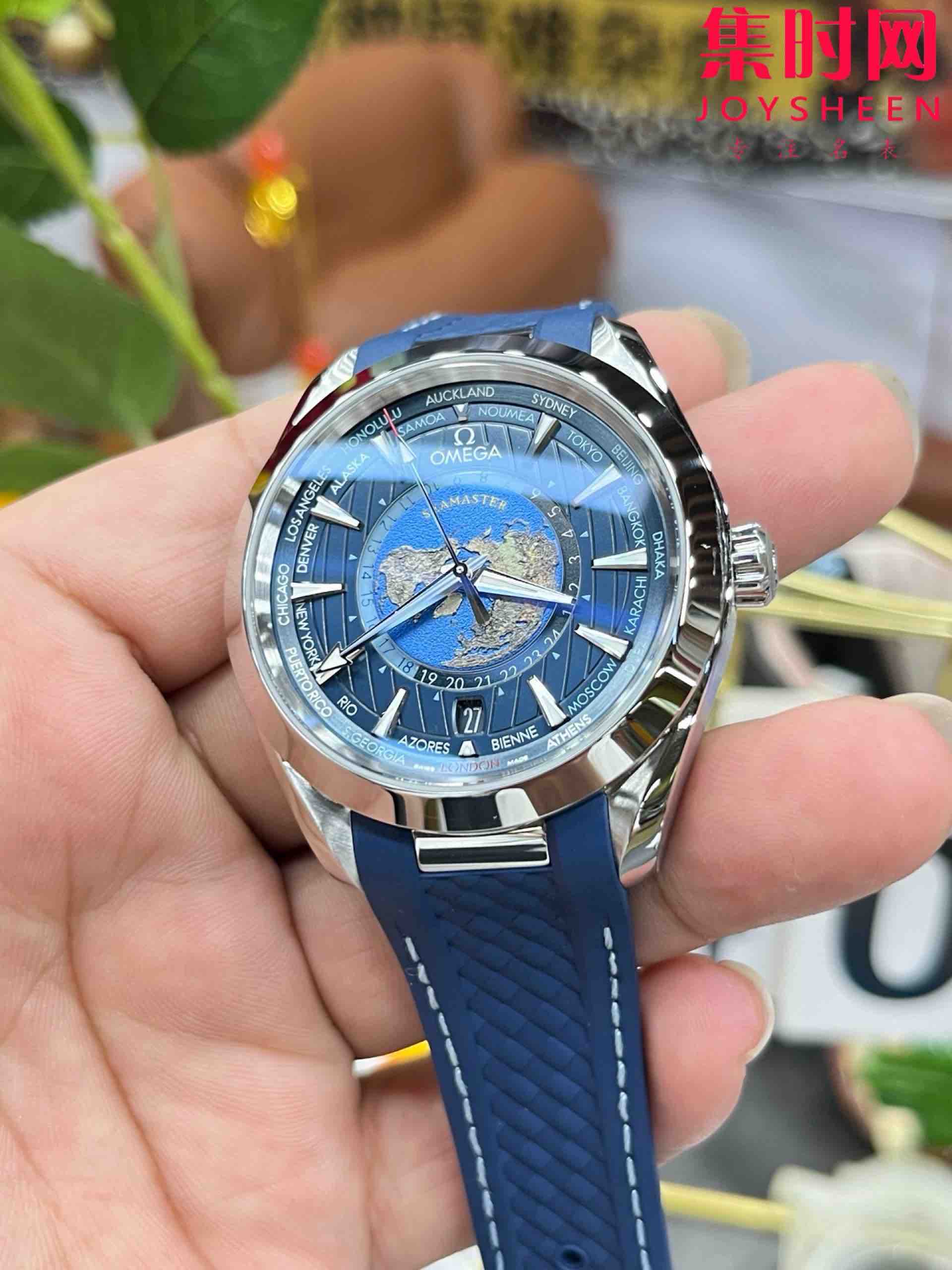 VS欧米茄海马世界时系列 VS海马世界时深海之蓝 蓝海马 海马世界时胶带款 男士腕表 表径43mm Aqua Terra 世界时腕表。一款可以戴着环游世界的世界时腕表,激光烧蚀蓝色海洋,陆地浮雕勾勒,24小时hesalite水晶环。辽阔世界尽在掌握,于方寸之间伴您开启环球之旅!搭载VS定制Cal.8938多功能全自动机械机芯,蓝宝石水晶镜面,316L精钢表壳,定制橡胶表带,原装折叠扣,功能同步原装真实可用!表径43mm