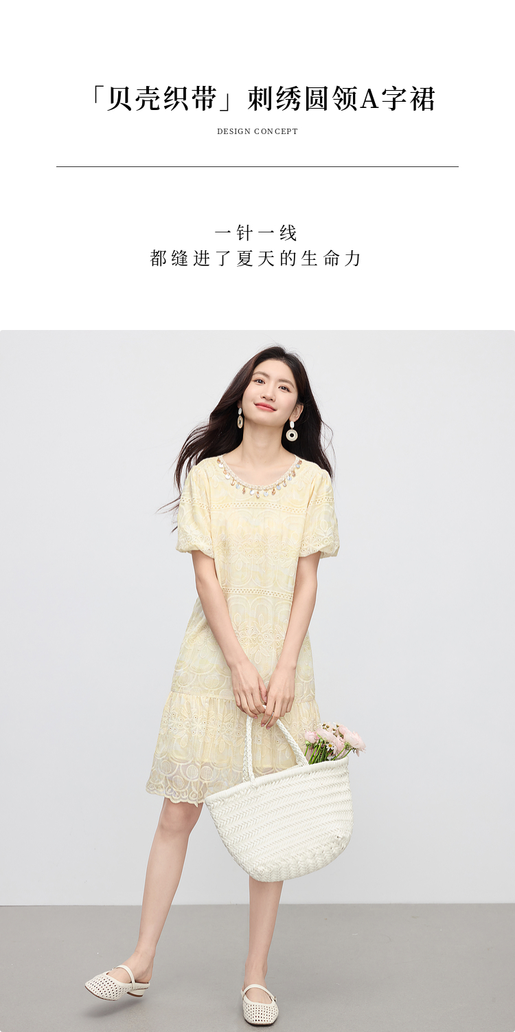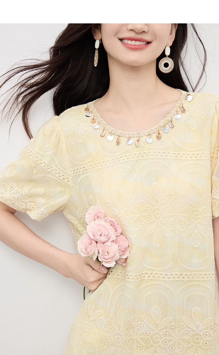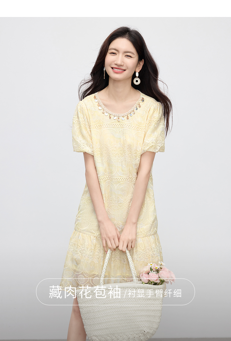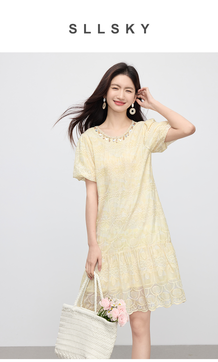【专属特价】熙世界度假风花苞袖蕾丝刺绣连衣裙女夏季小个子亮片圆领a字裙子