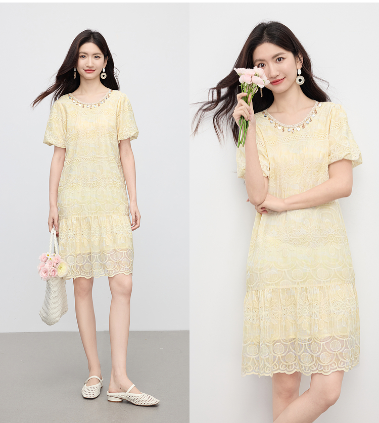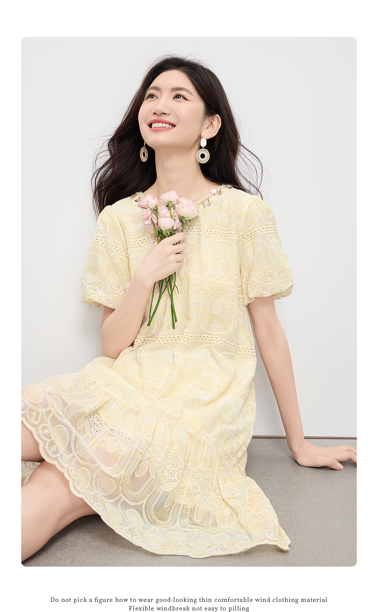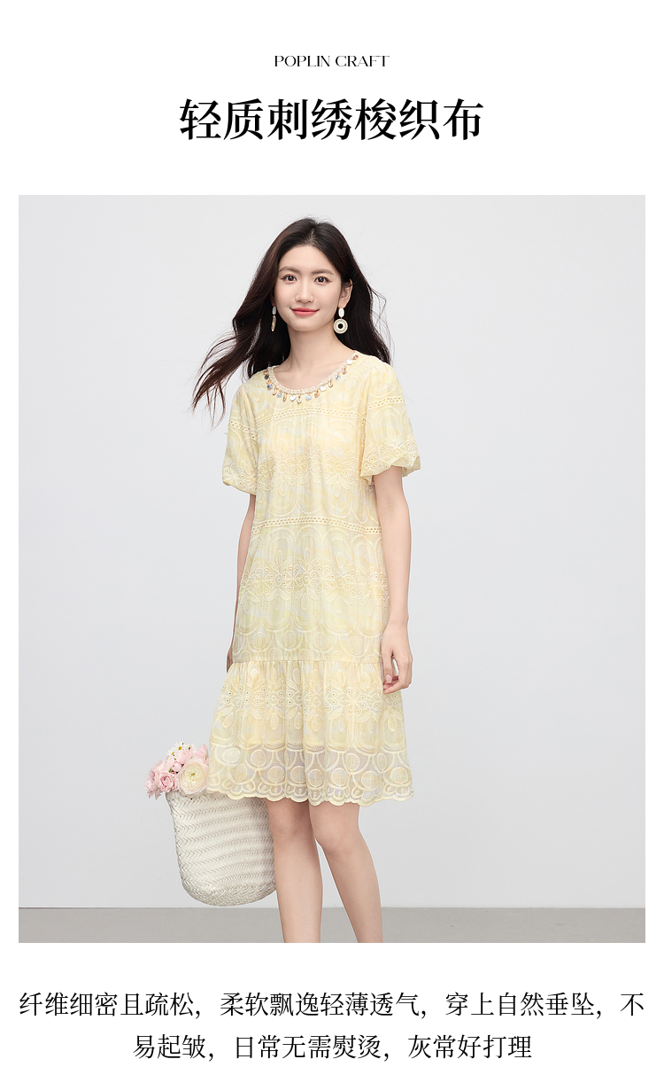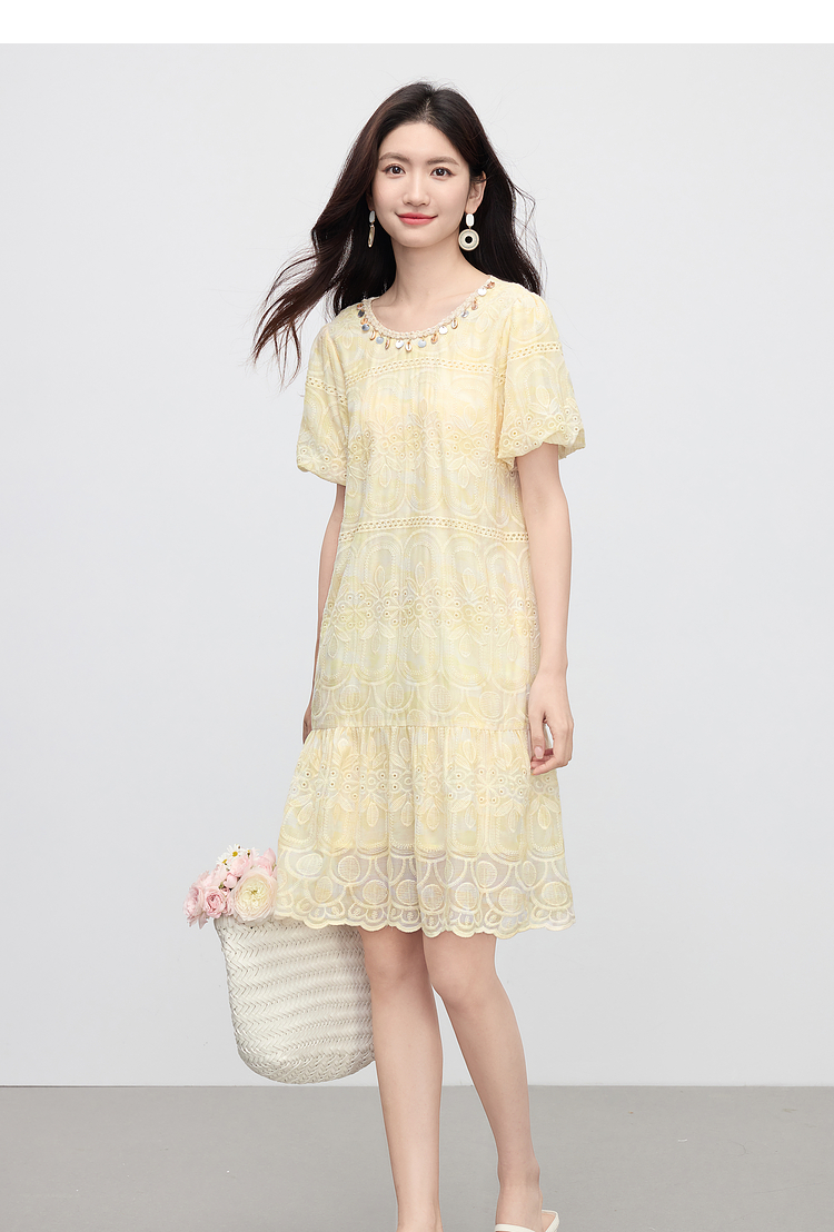 【专属特价】熙世界度假风花苞袖蕾丝刺绣连衣裙女夏季小个子亮片圆领a字裙子